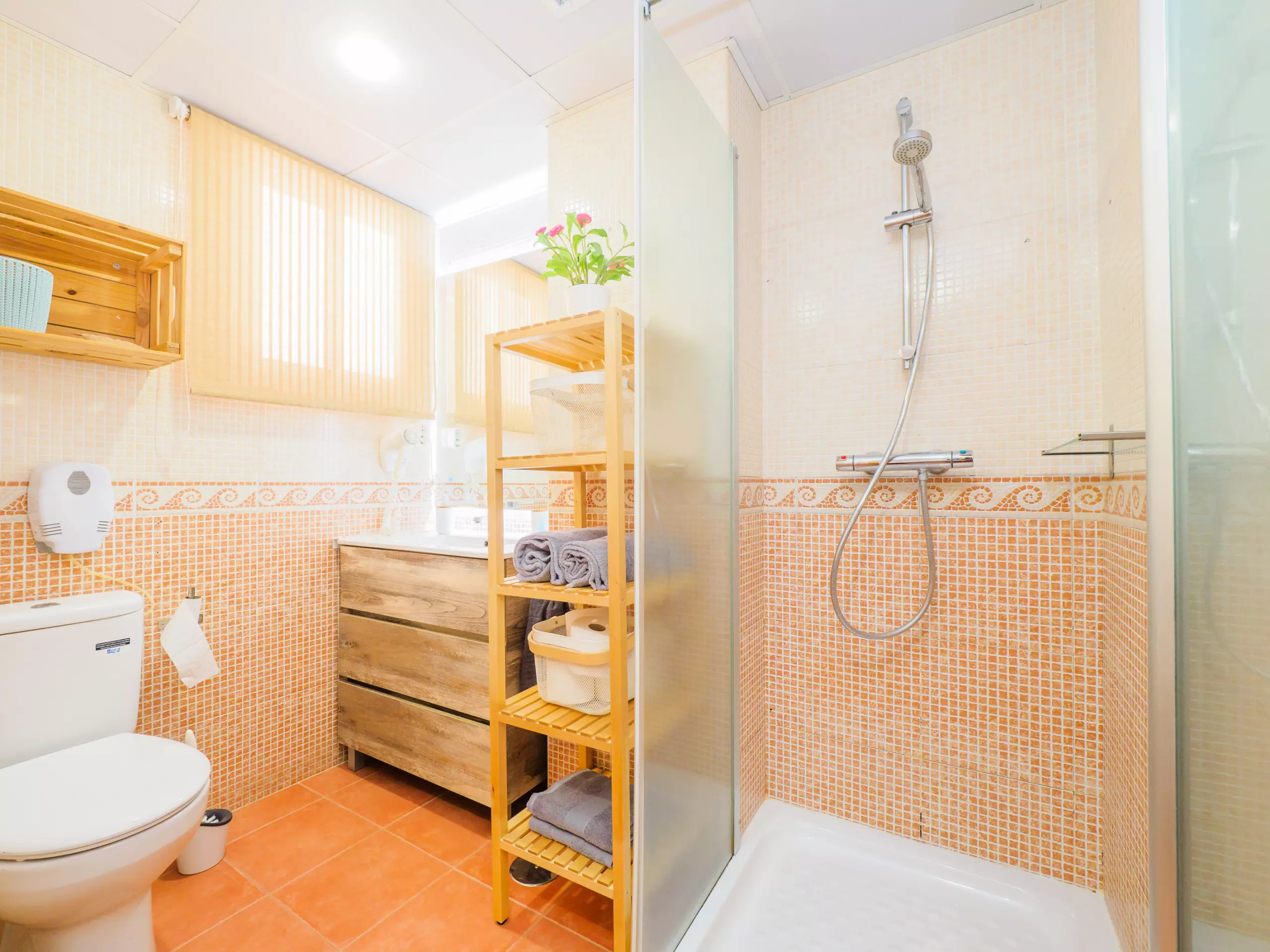 * Salle de bain avec douche moderne et fonctionnelle.