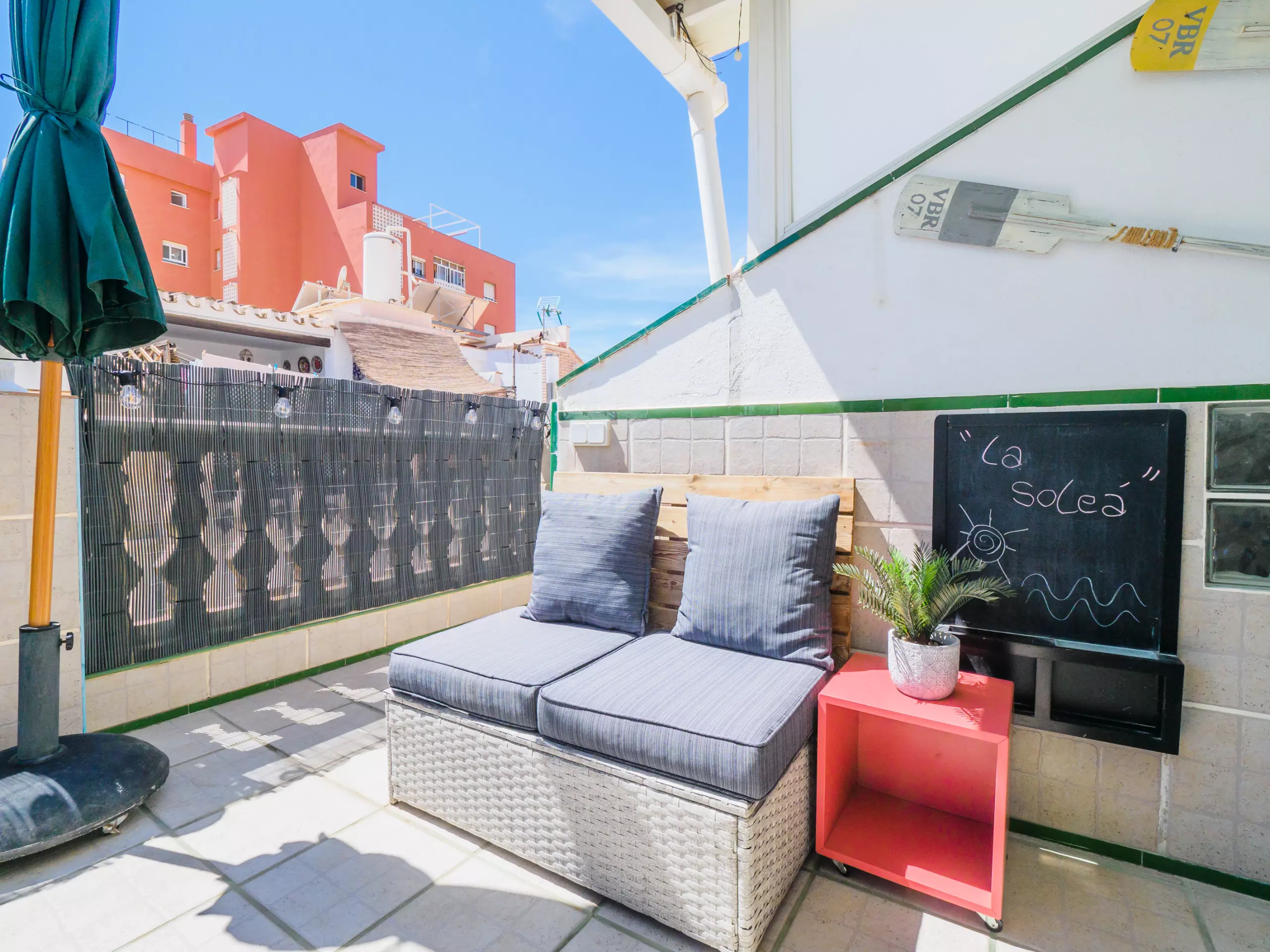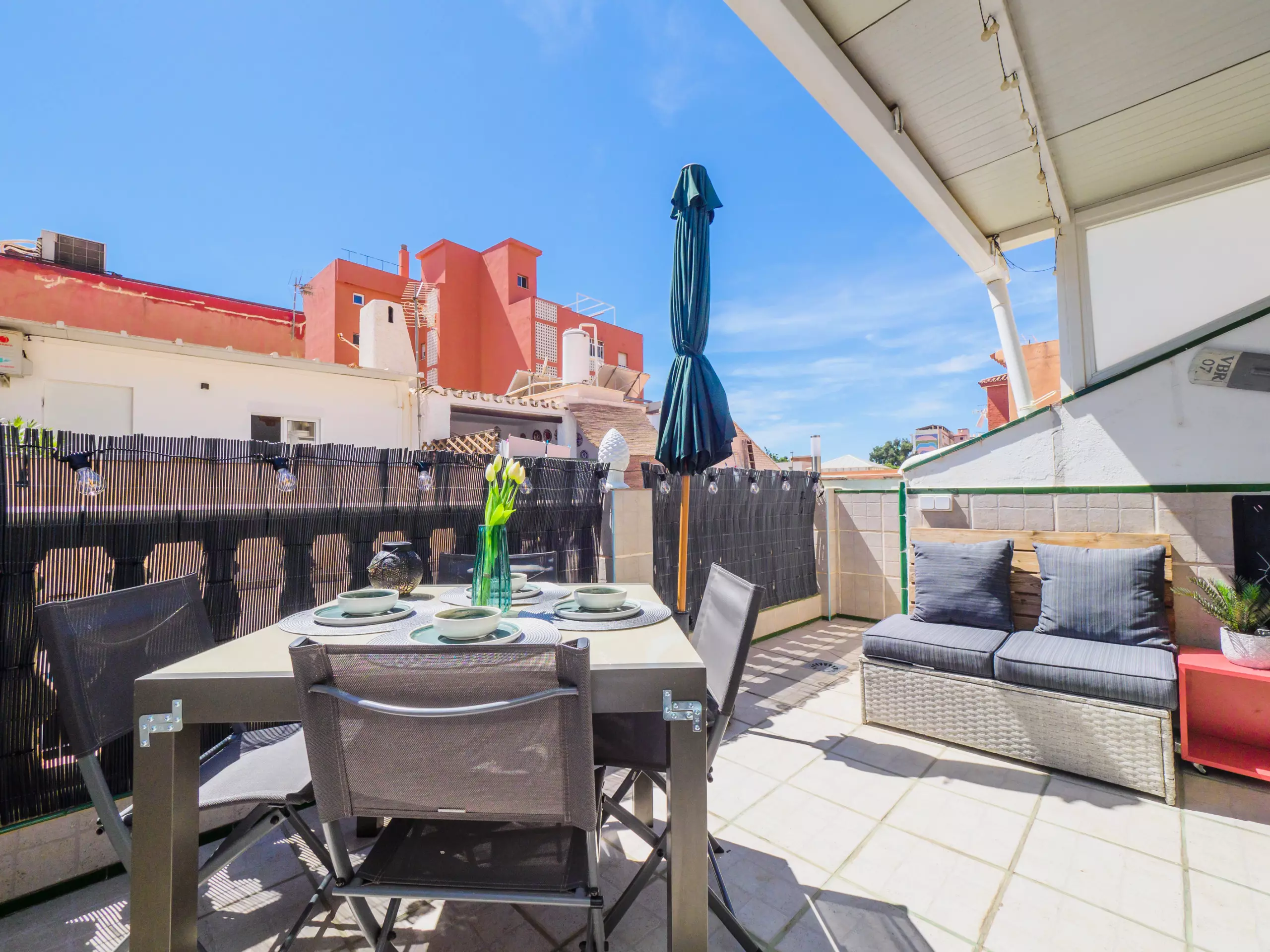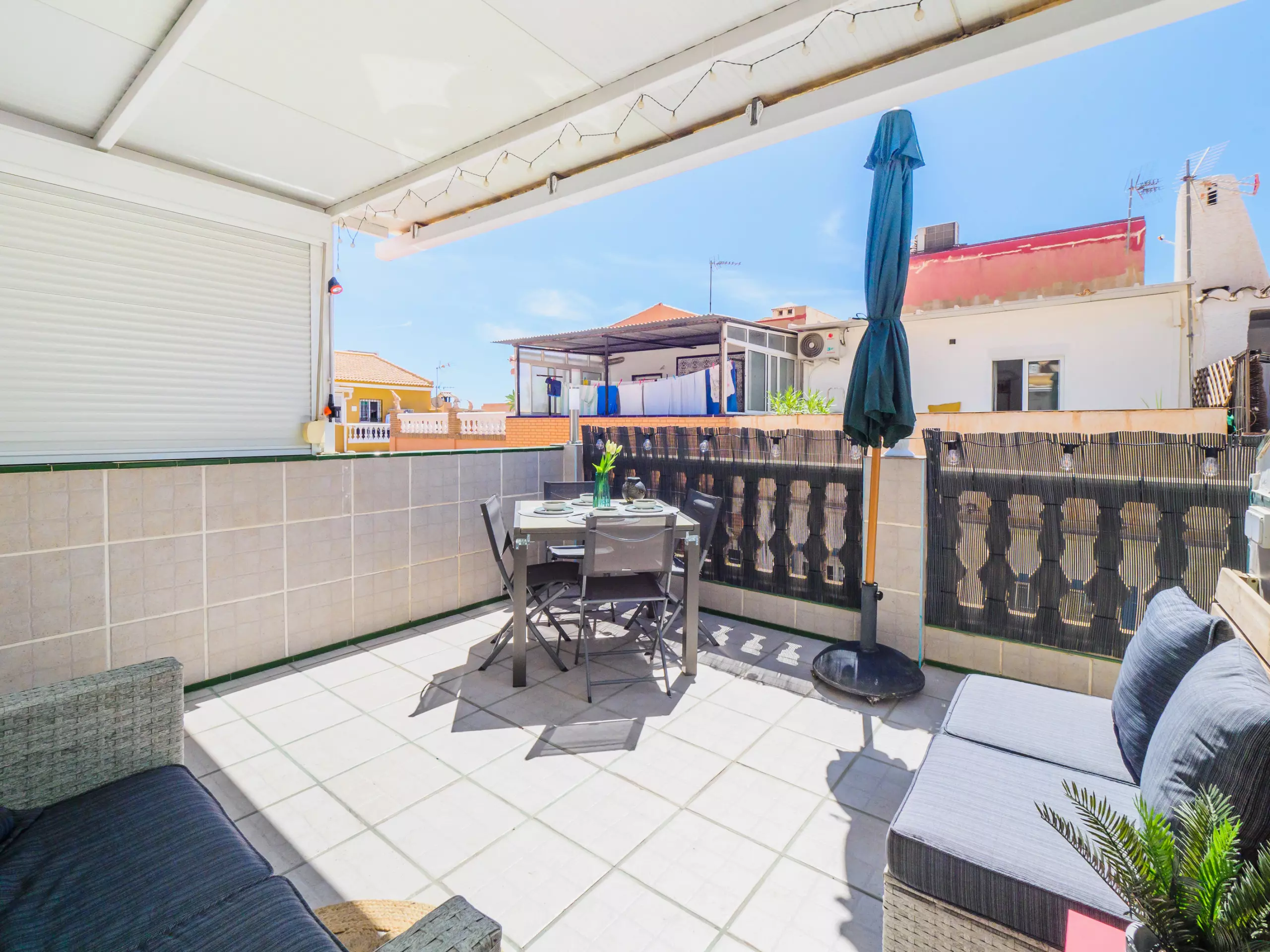 * Grande terrasse supérieure, équipée de mobilier d'extérieur, où vous pourrez prendre le soleil, vous détendre en lisant un livre ou profiter d'un dîner en plein air sous un ciel dégagé.