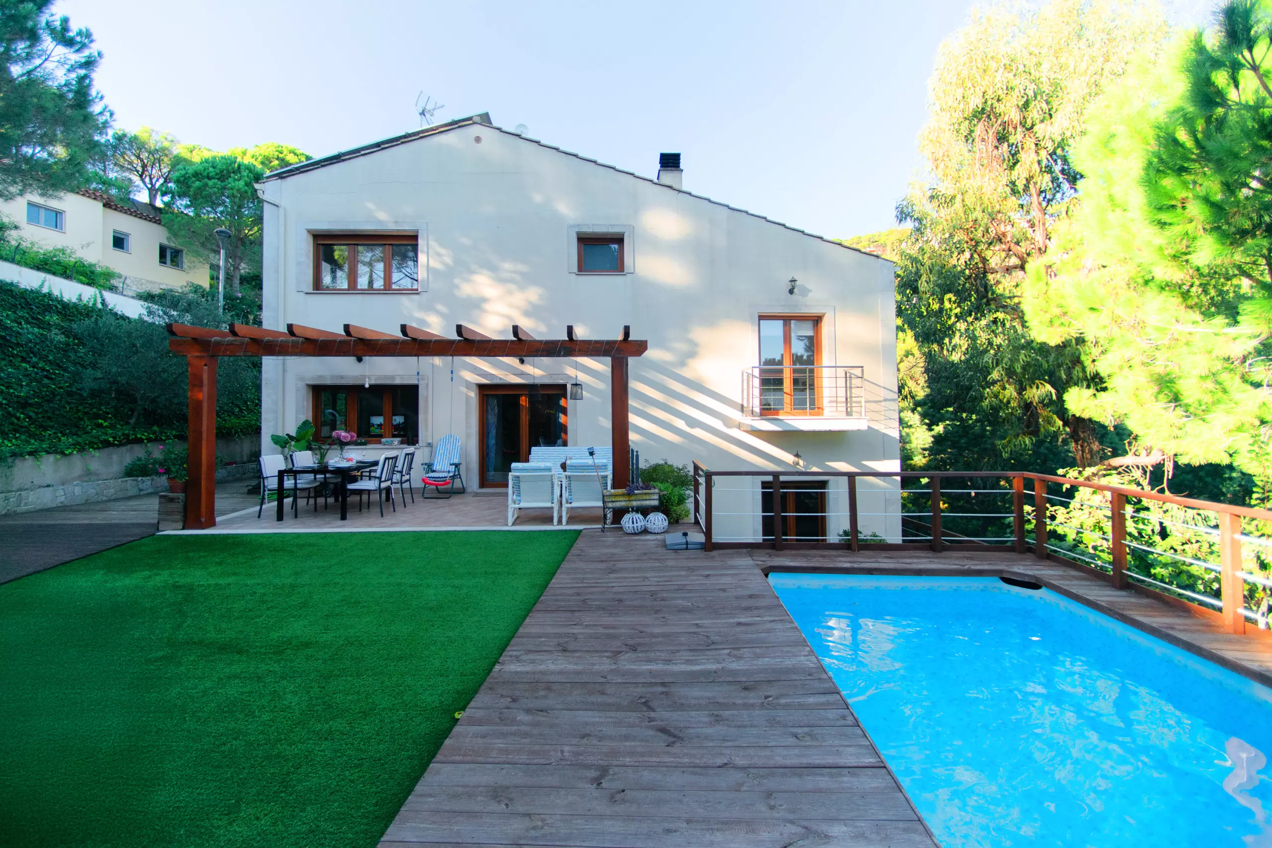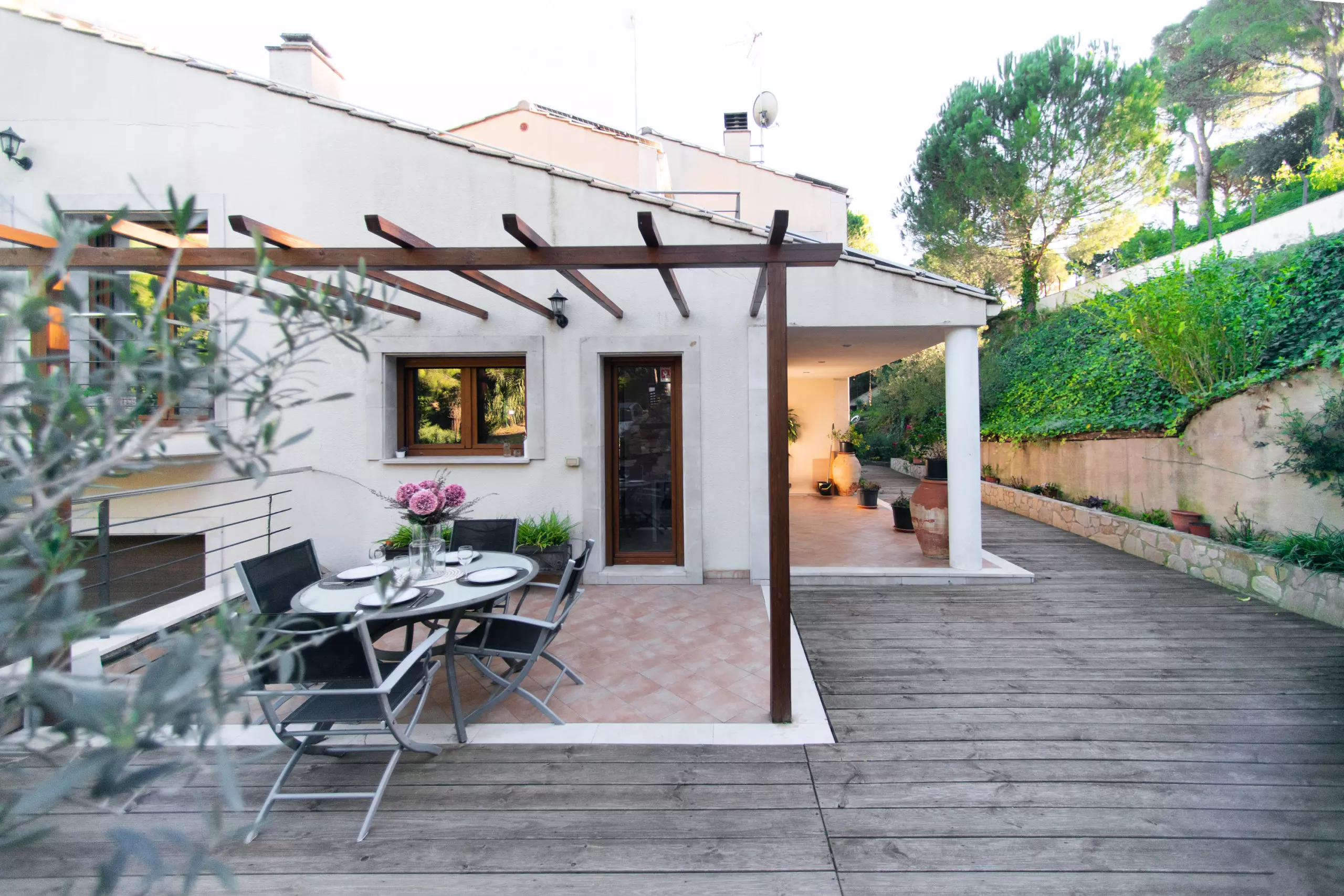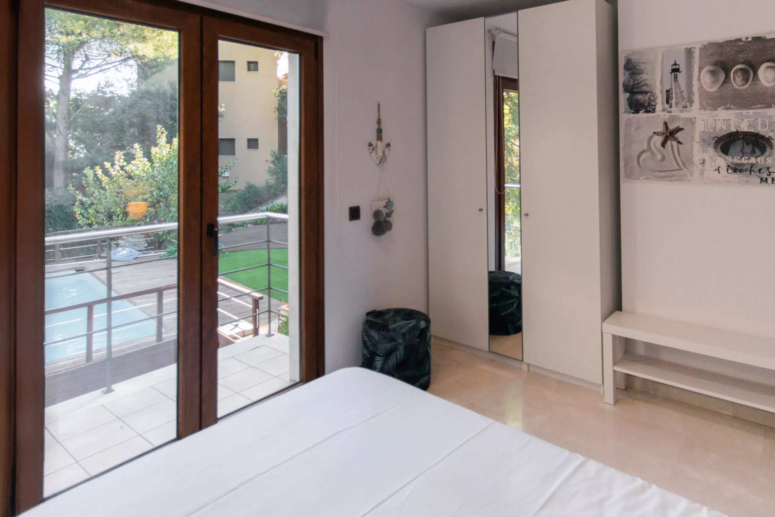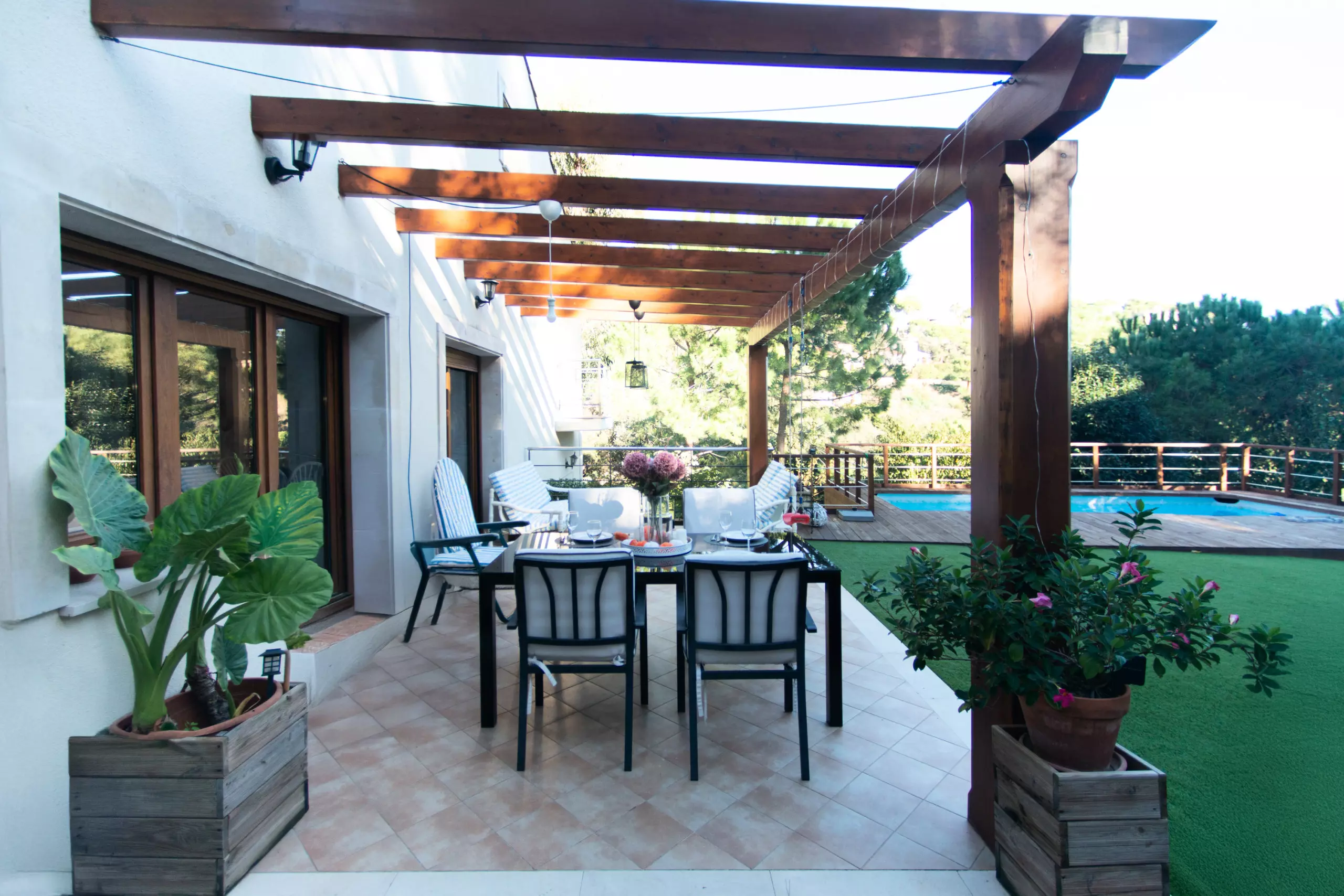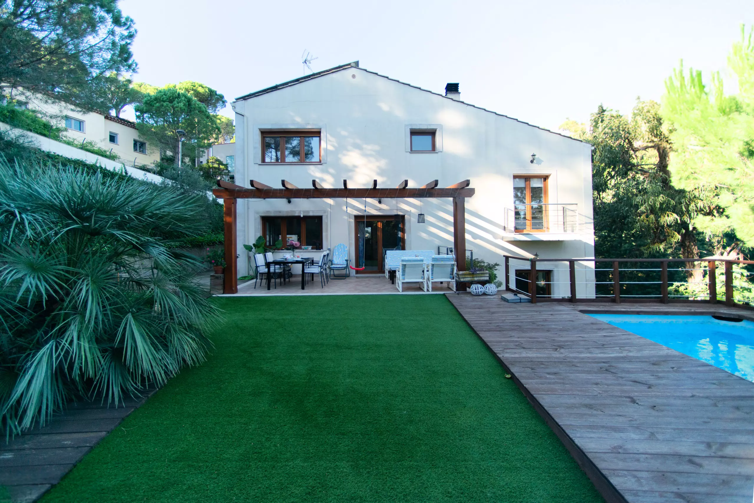 À l'extérieur, vous attend un environnement vert et relaxant. Vous pourrez profiter du jardin avec du mobilier et une large terrasse privée de 43 m² pour prendre votre petit-déjeuner en plein air, lire ou dîner dans une ambiance calme. Le grand point fort est la piscine privée, parfaite pour se rafraîchir et profiter du soleil en toute intimité.