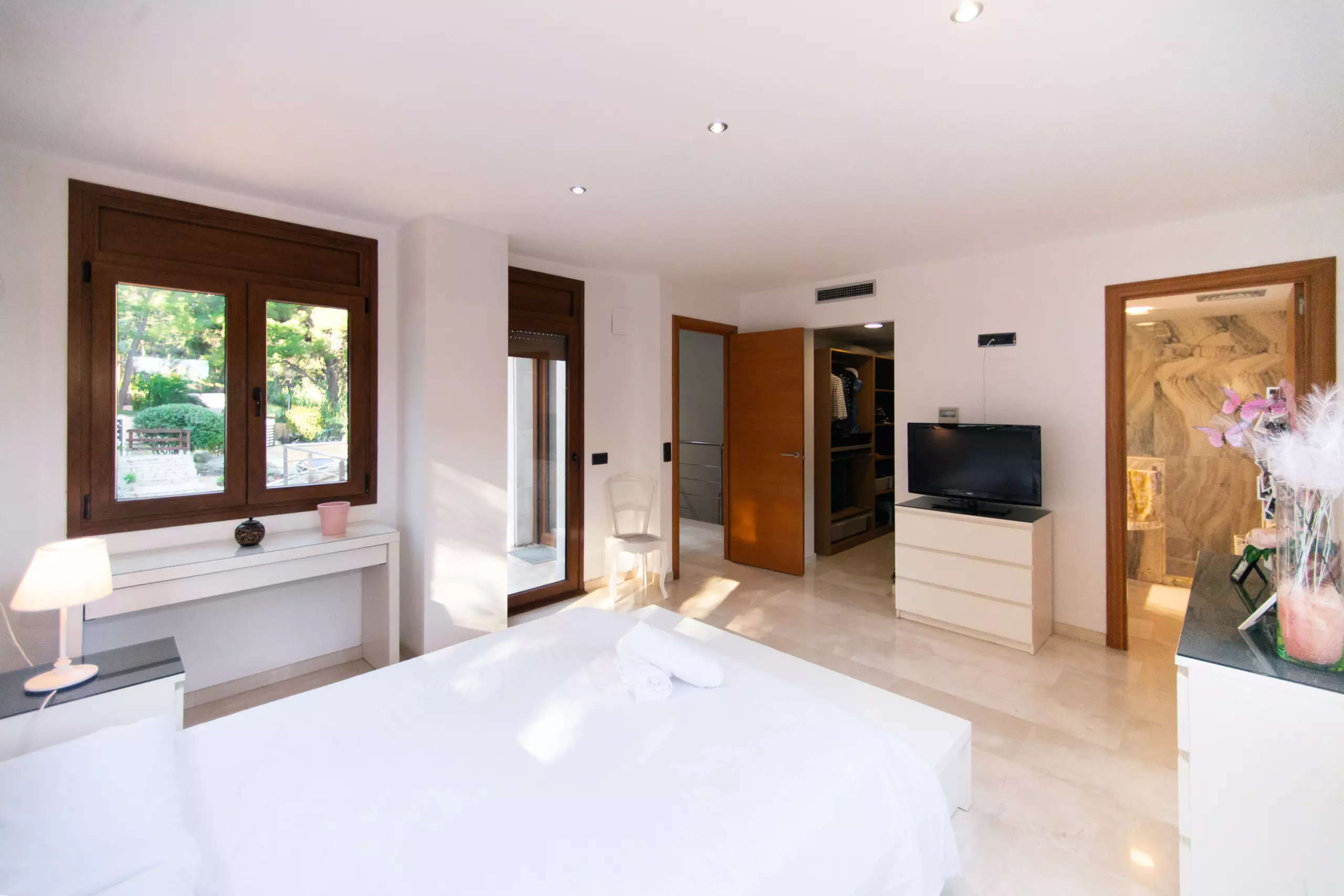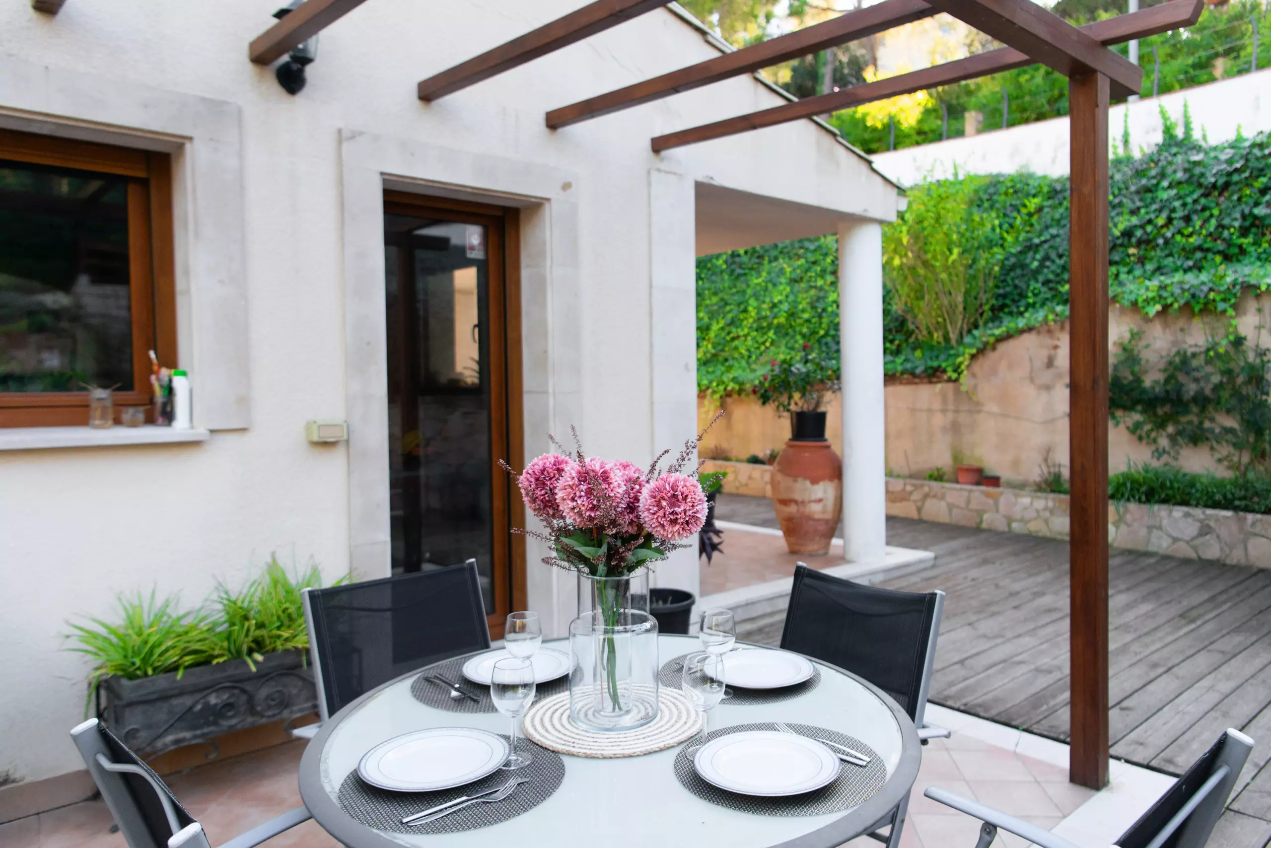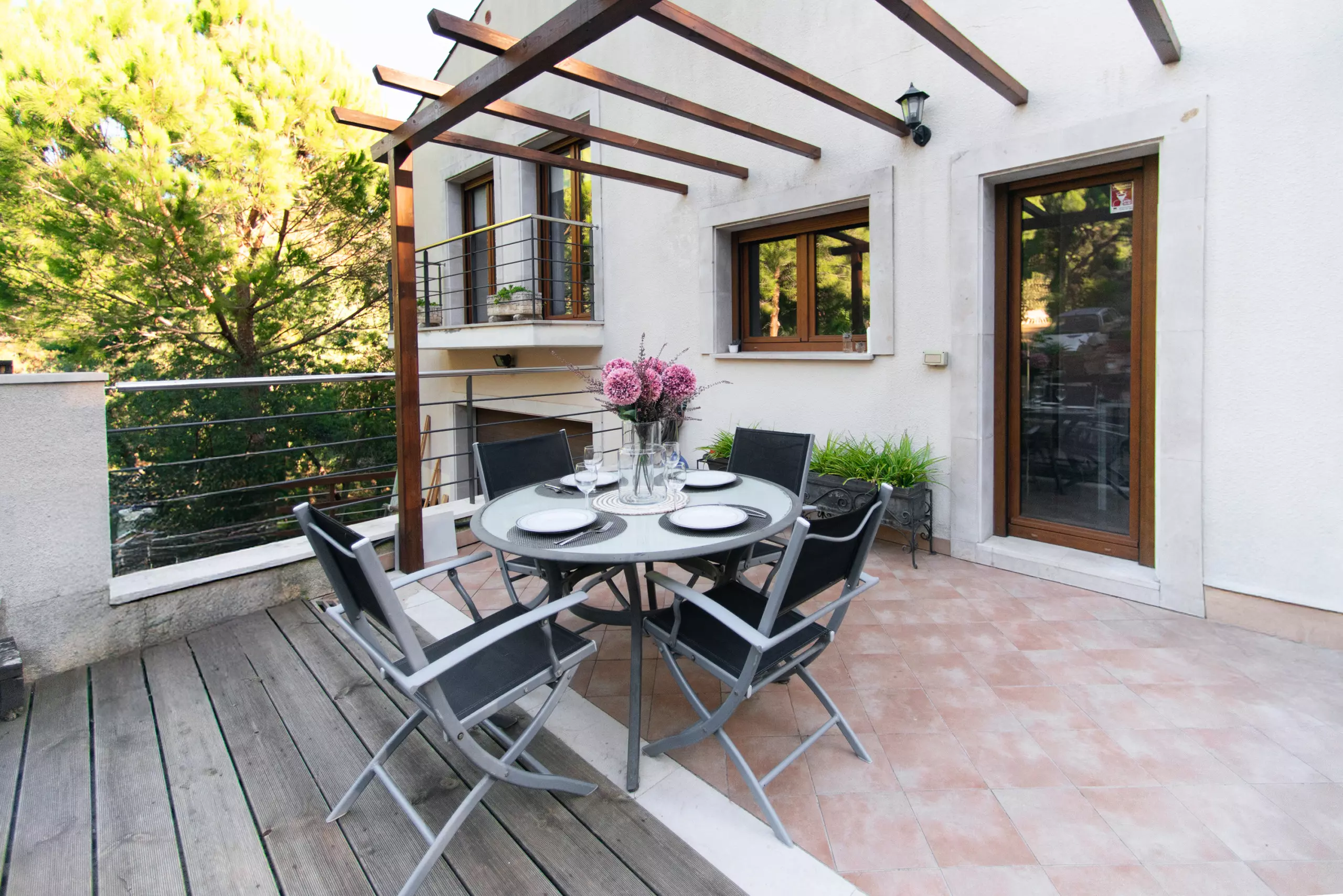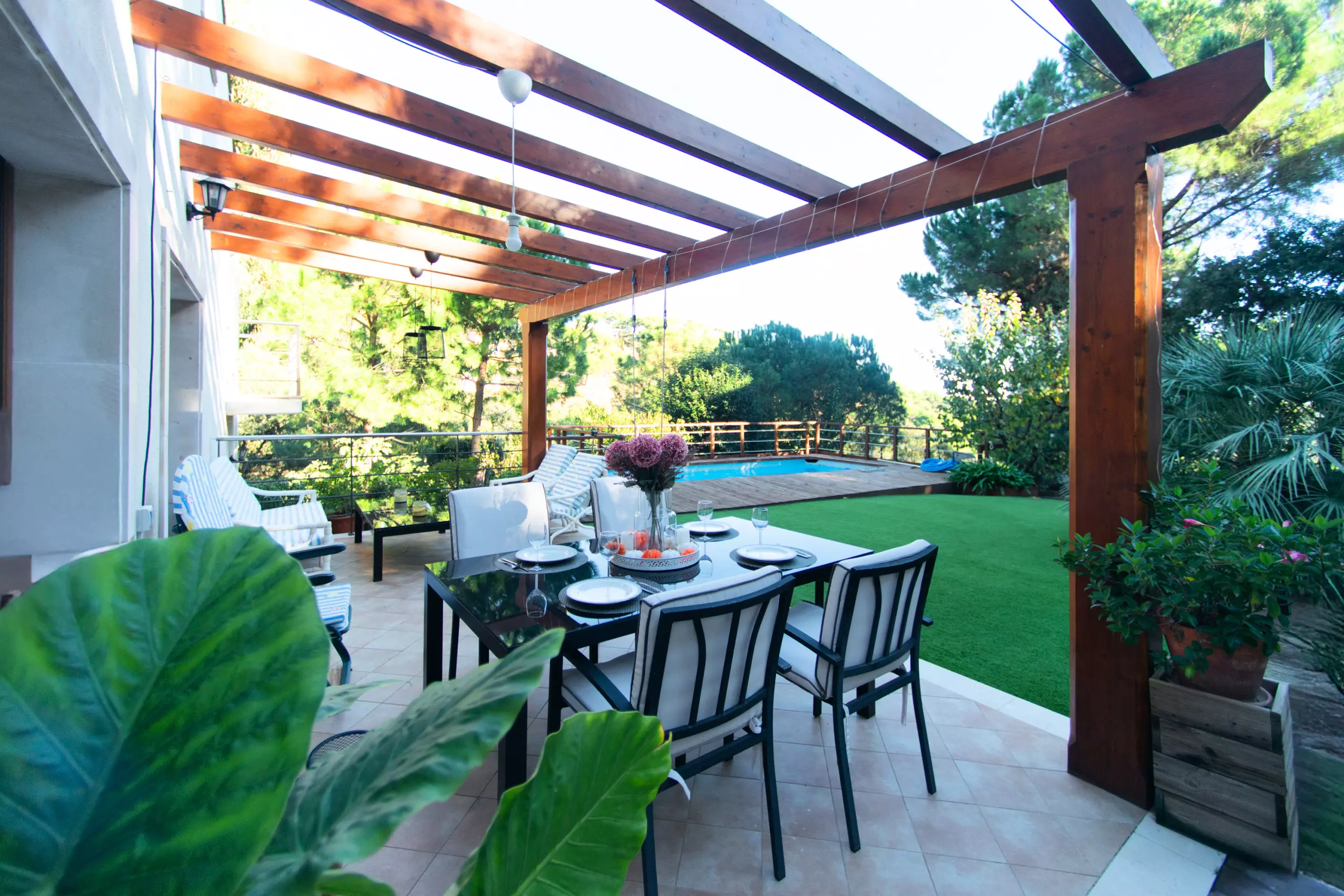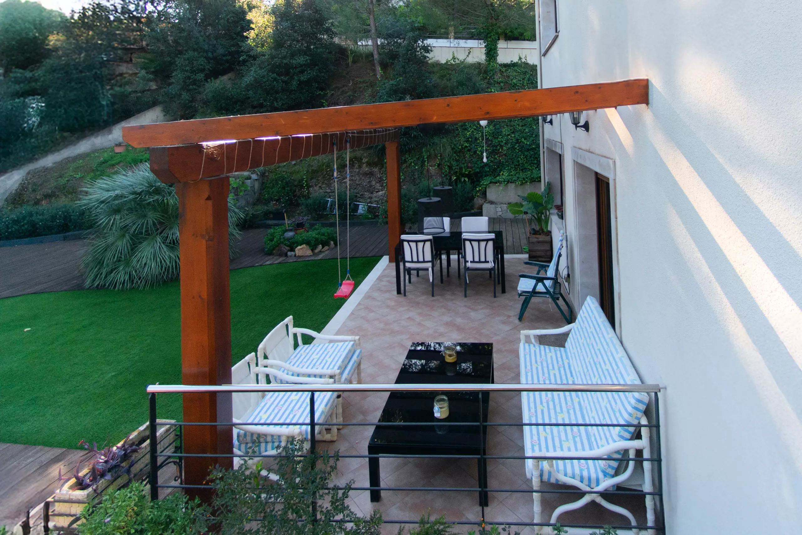 À l'extérieur, vous attend un environnement vert et relaxant. Vous pourrez profiter du jardin avec du mobilier et une large terrasse privée de 43 m² pour prendre votre petit-déjeuner en plein air, lire ou dîner dans une ambiance calme. Le grand point fort est la piscine privée, parfaite pour se rafraîchir et profiter du soleil en toute intimité.
