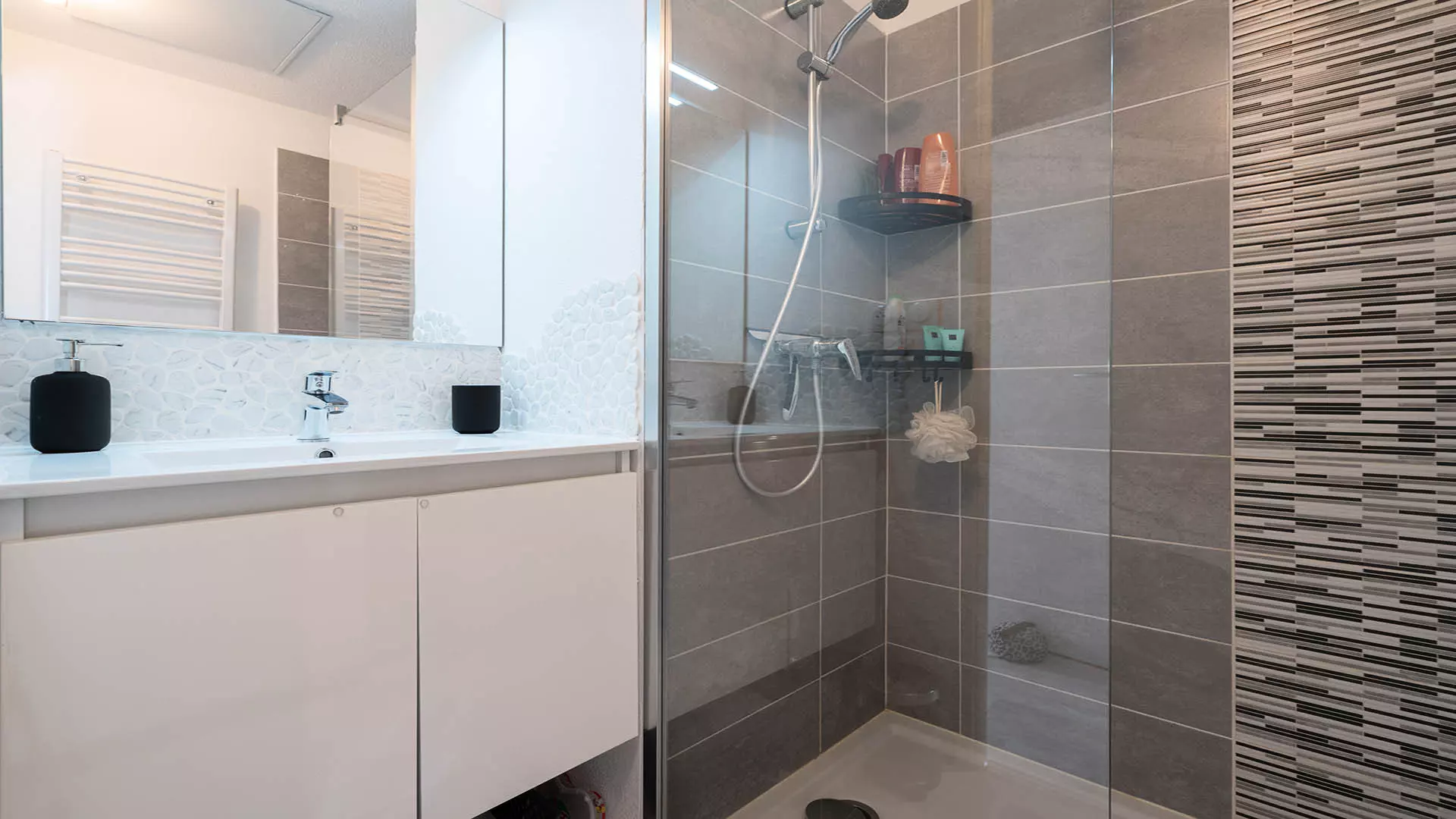 Salle de bain : Douche moderne et sèche-serviette pour un maximum de confort.