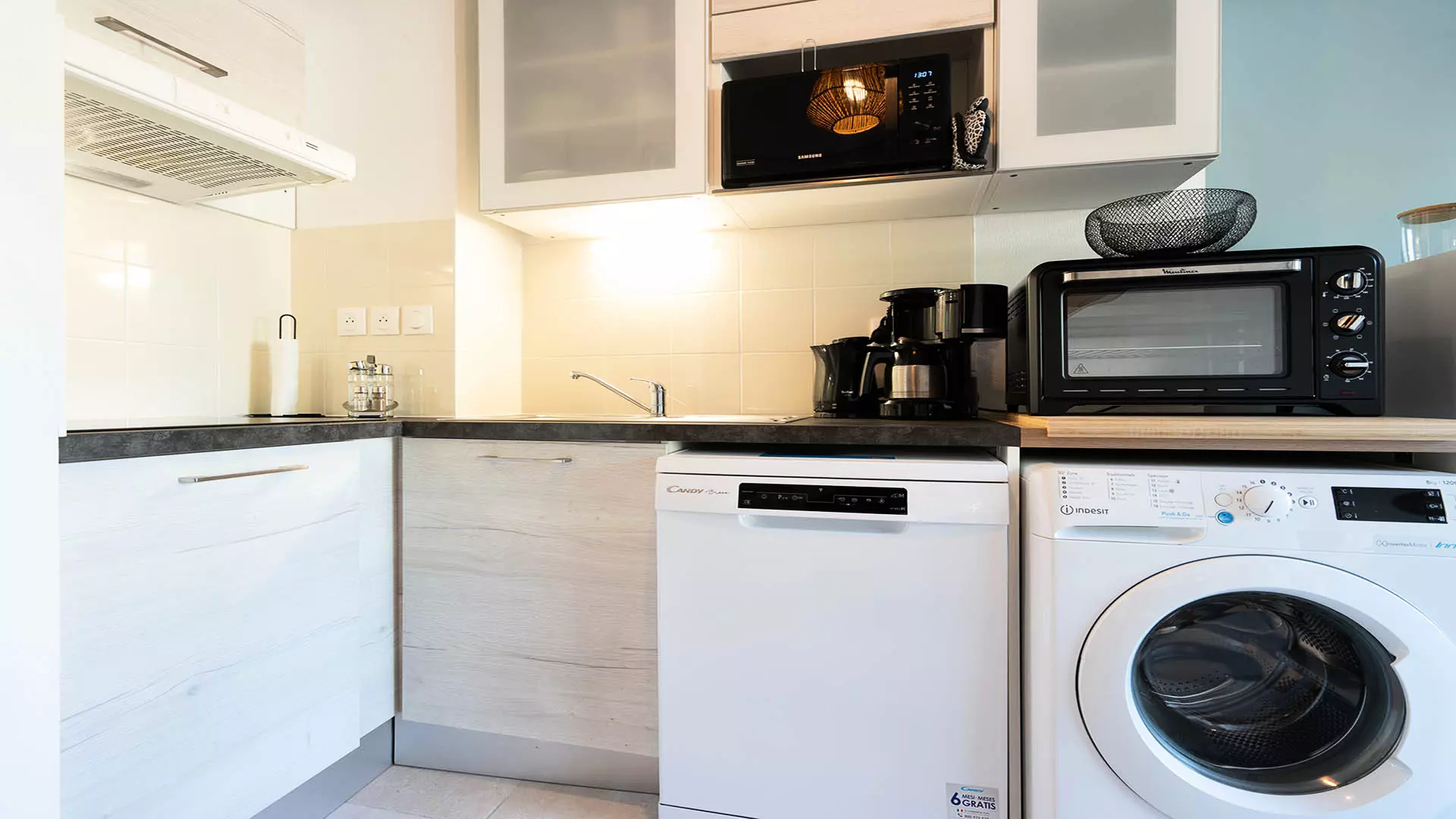 Cuisine équipée : Réfrigérateur, micro-ondes, four, lave-vaisselle, couverts, ustensiles de cuisine, grille-pain et cafetière à filtre.