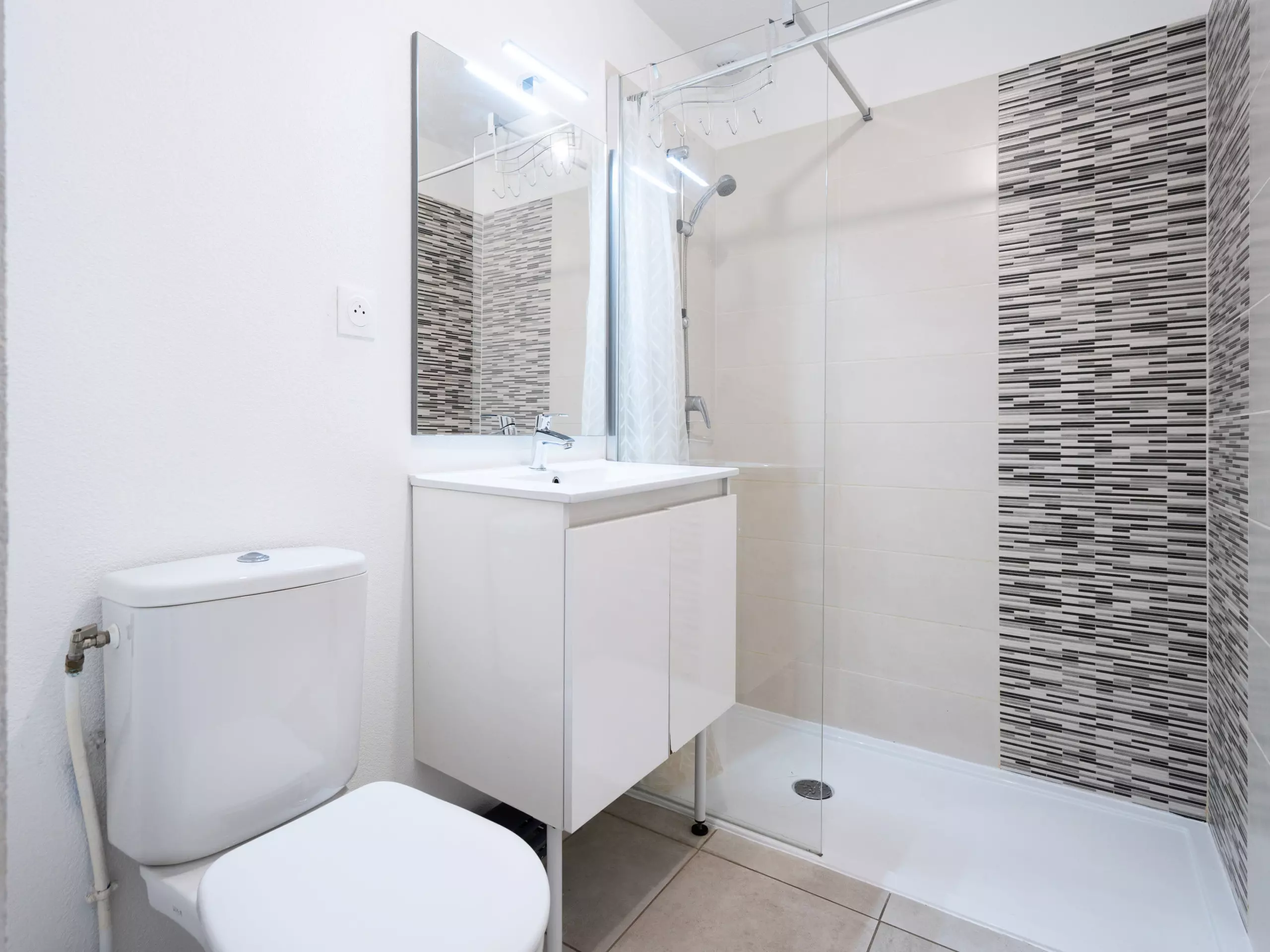 - Salle de douche avec Sèche-cheveux, sèche-serviette et WC
