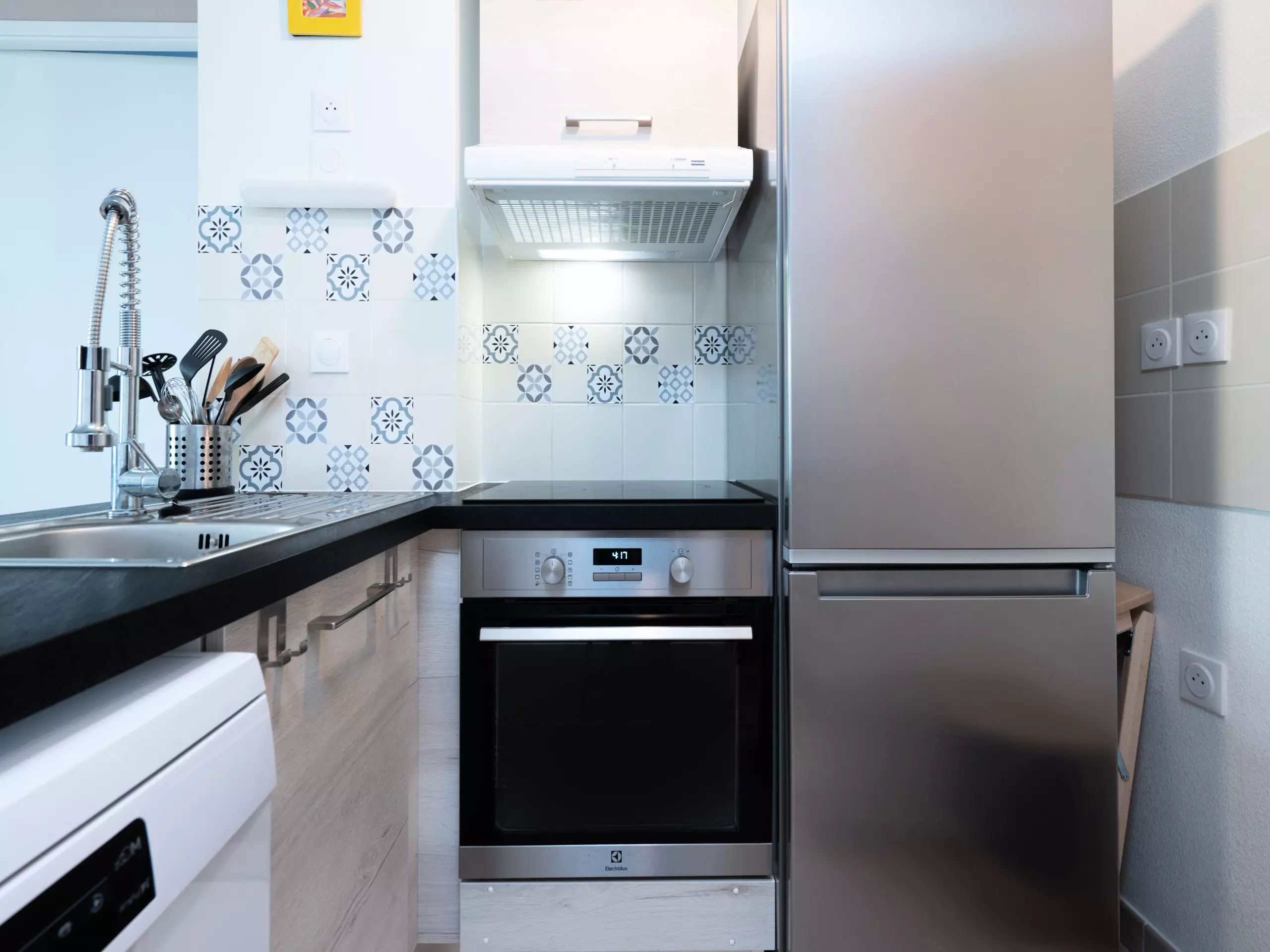 - Cuisine équipée (réfrigérateur, four, bouilloire, grille-pain, plaque de cuisson (électrique) lave-vaisselle, cafetière, vaisselle et ustensiles de cuisine) ;