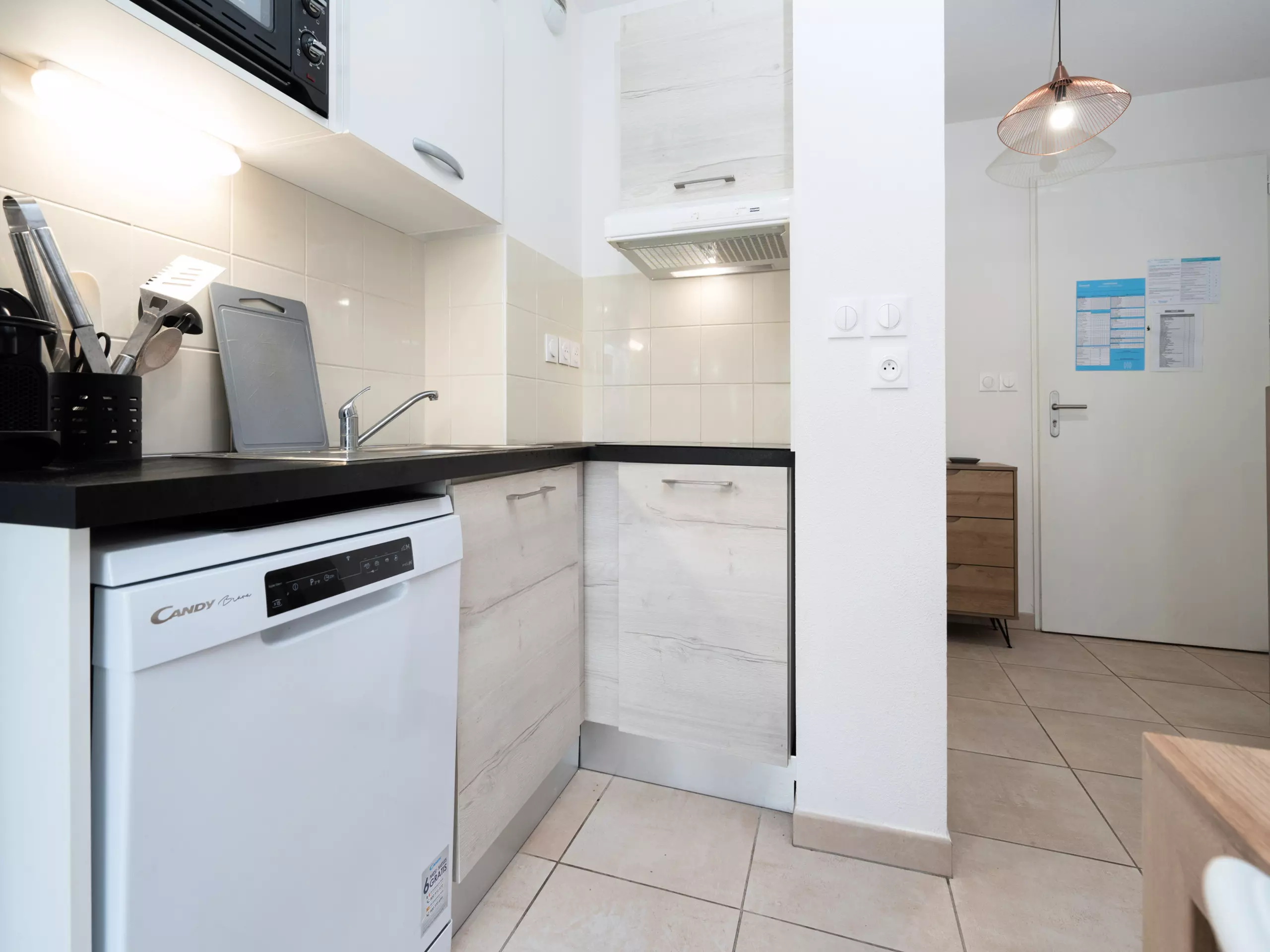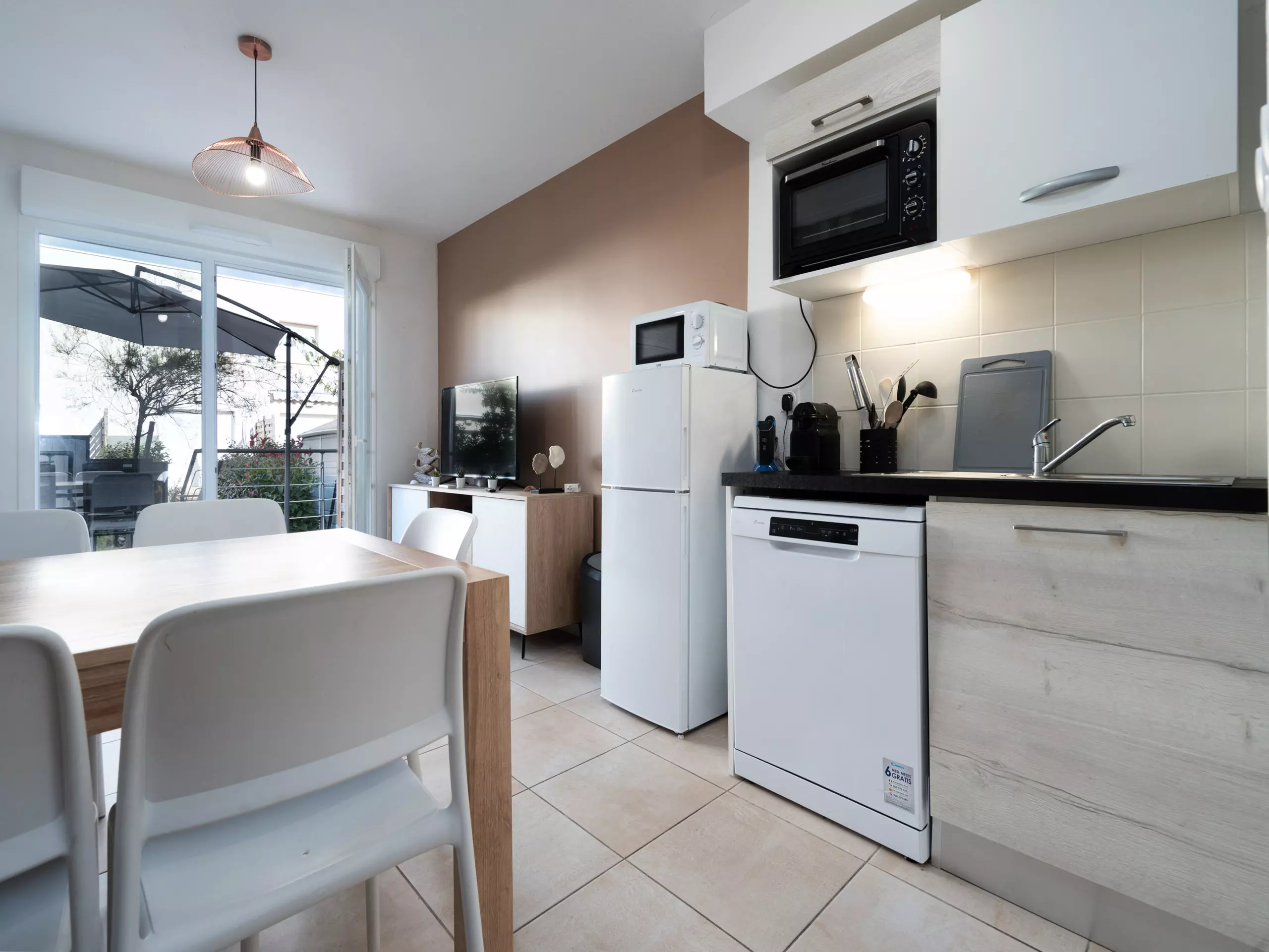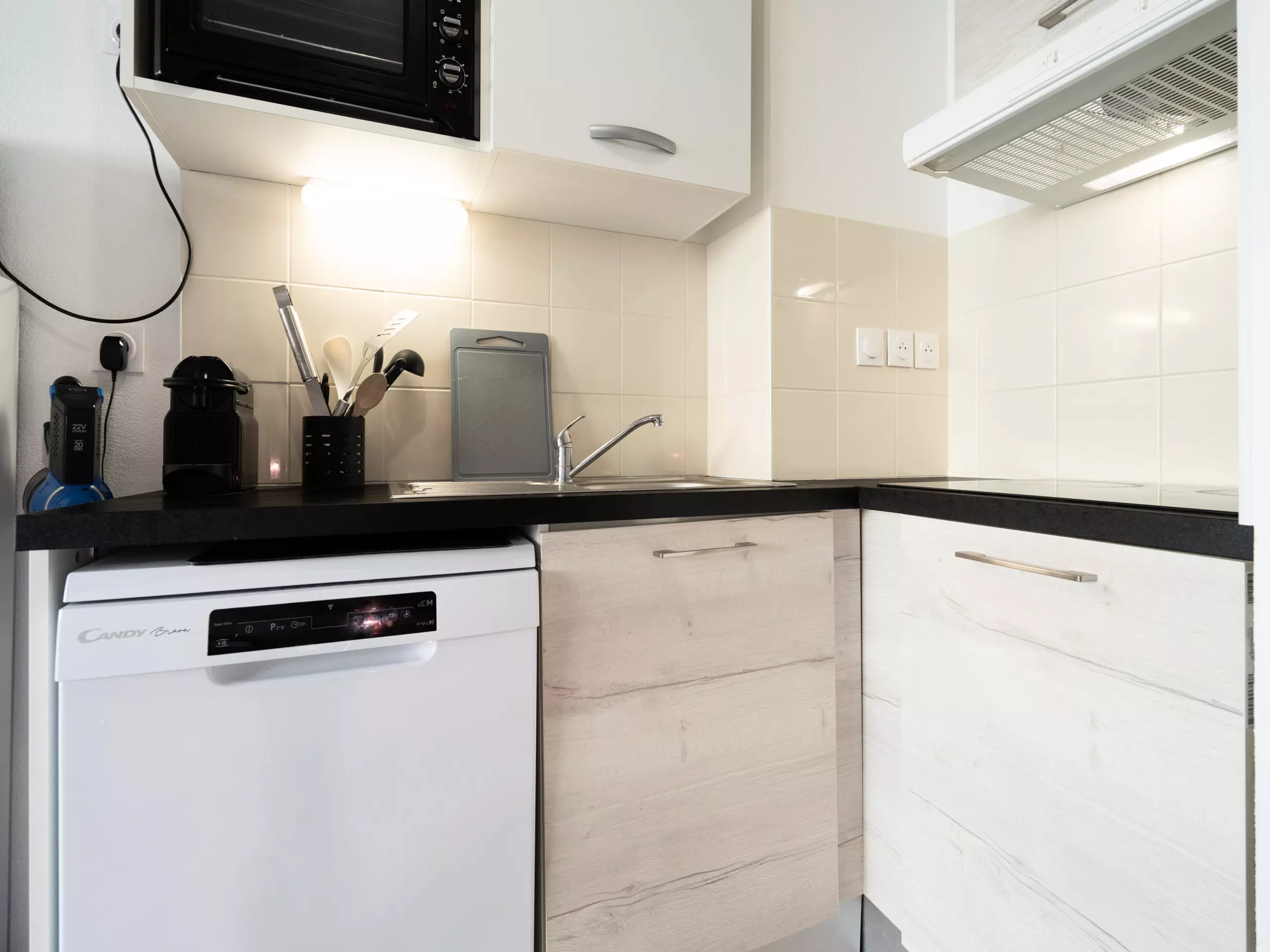 - Cuisine équipée (réfrigérateur, micro-ondes, bouilloire, grille-pain, plaques électriques, lave-vaisselle, machine à café Nespresso, vaisselle et ustensiles de cuisine);