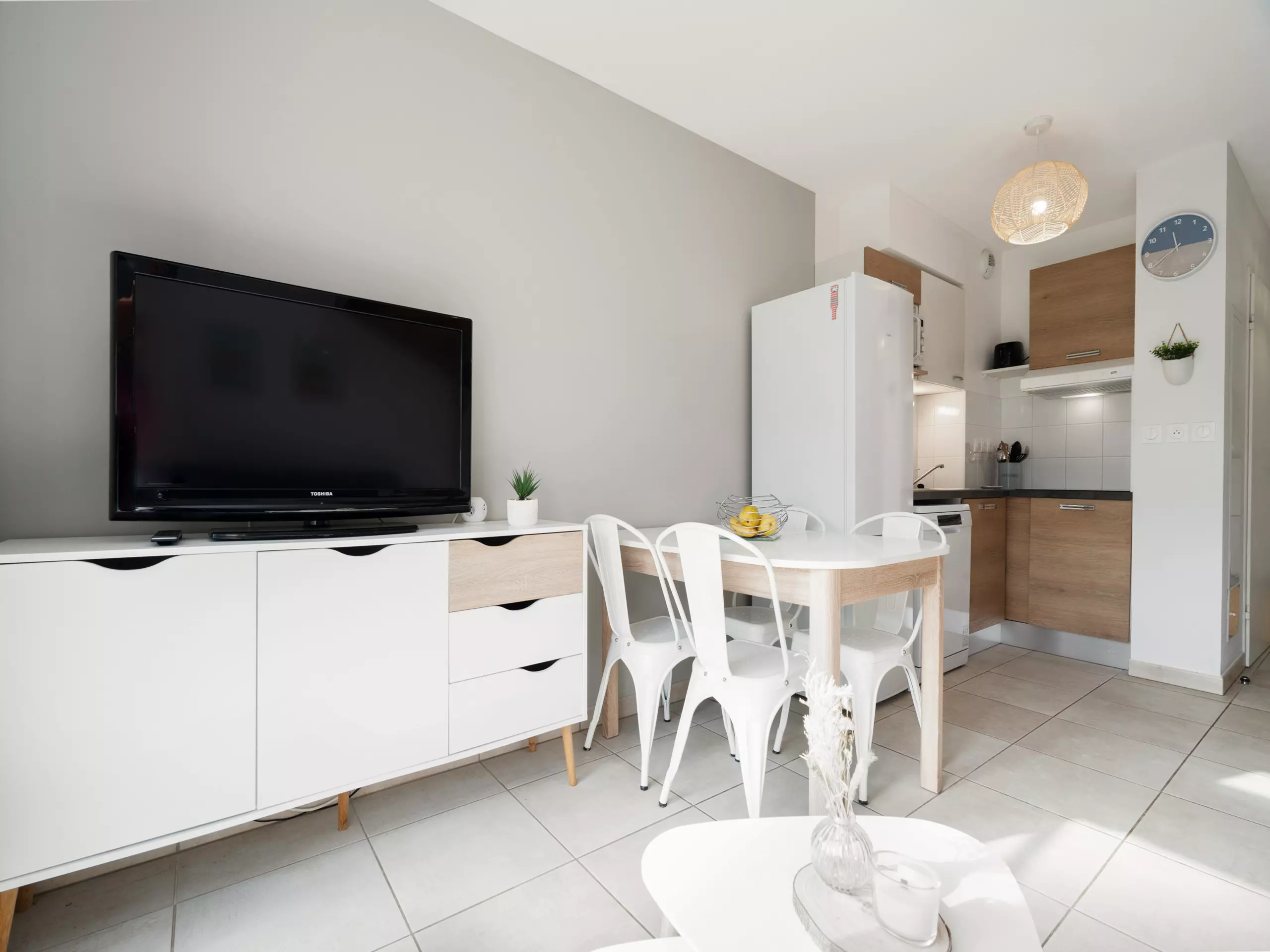 - Cuisine équipée (réfrigérateur, congélateur, four, grille-pain, micro-ondes, bouilloire, cafetière à dosettes SENSEO, lave-vaisselle et ustensiles de cuisine) ;