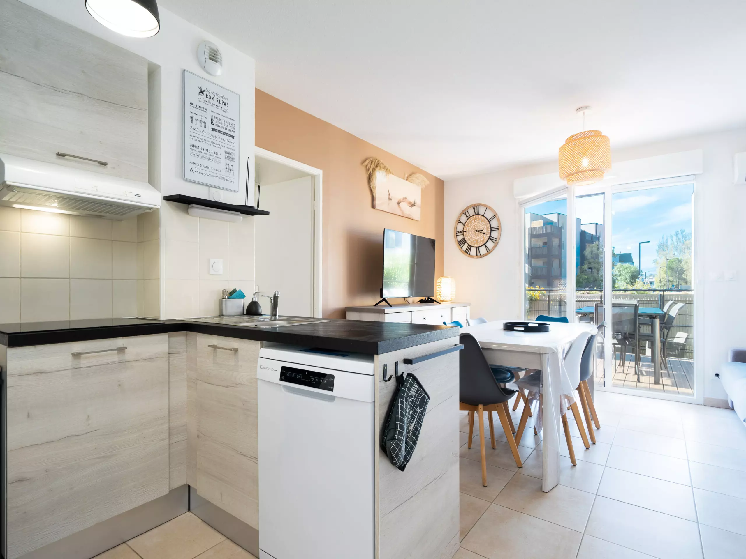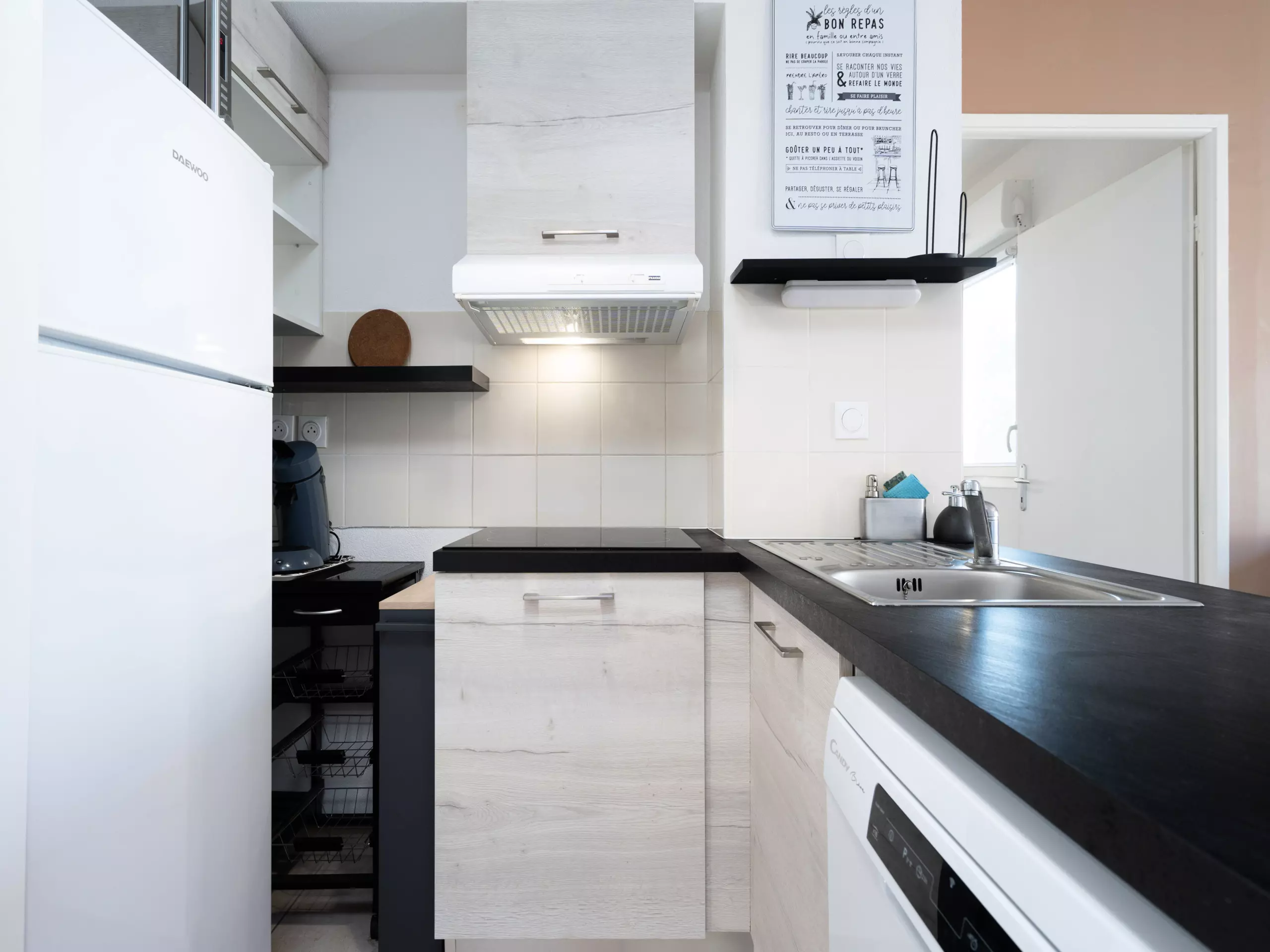 - Cuisine équipée (réfrigérateur, congélateur, micro-ondes, bouilloire, cafetière à dosettes SENSEO, grille-pain, plancha, mini hachoir, robot légumes, lave-vaisselle et ustensiles de cuisine) ;