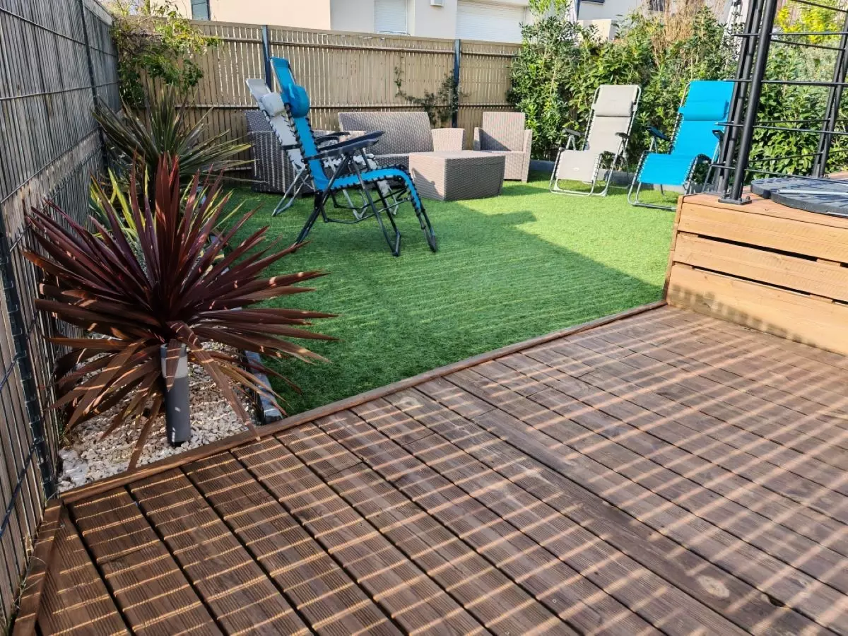 - Terrasse + jardin privatif avec quatre chaises longues,