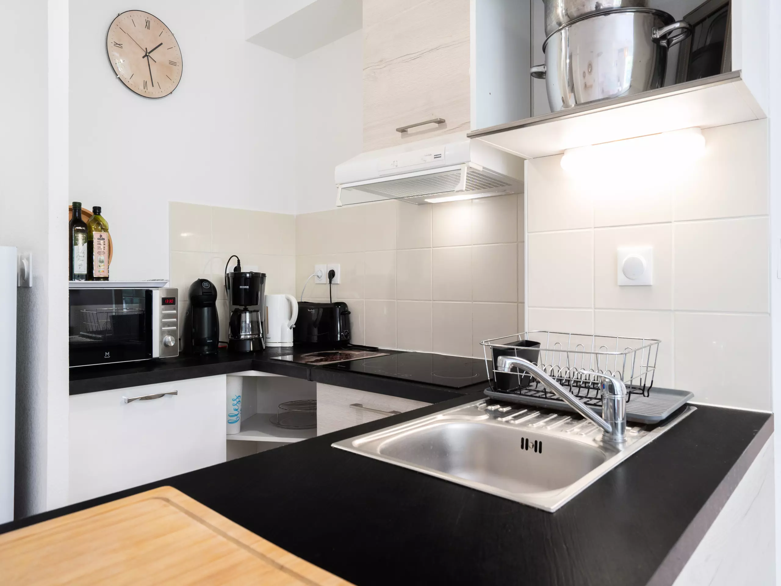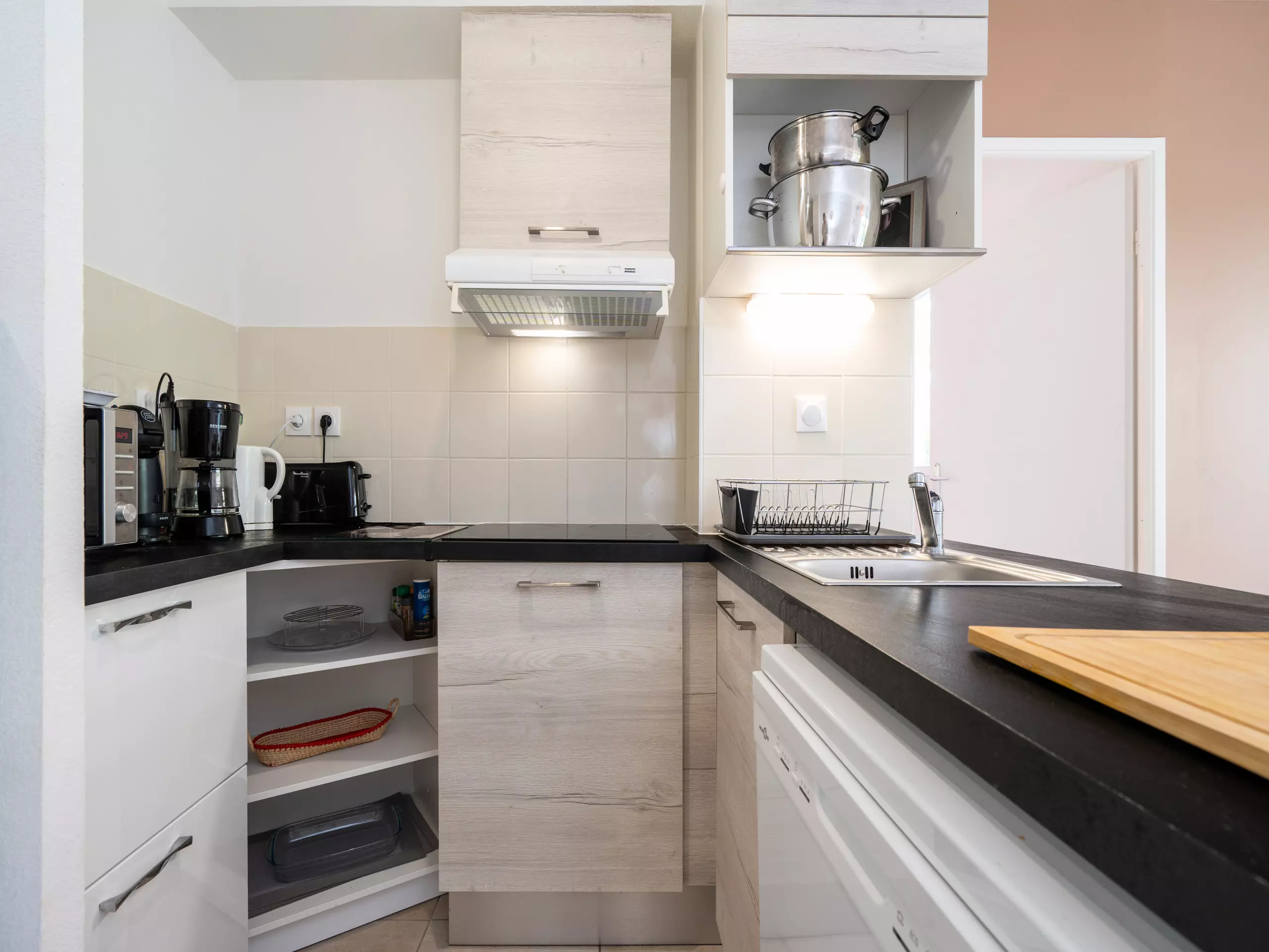 - Cuisine équipée (réfrigérateur, congélateur, micro-ondes, bouilloire, cafetière à filtre, plancha, lave-vaisselle et ustensiles de cuisine) ;
