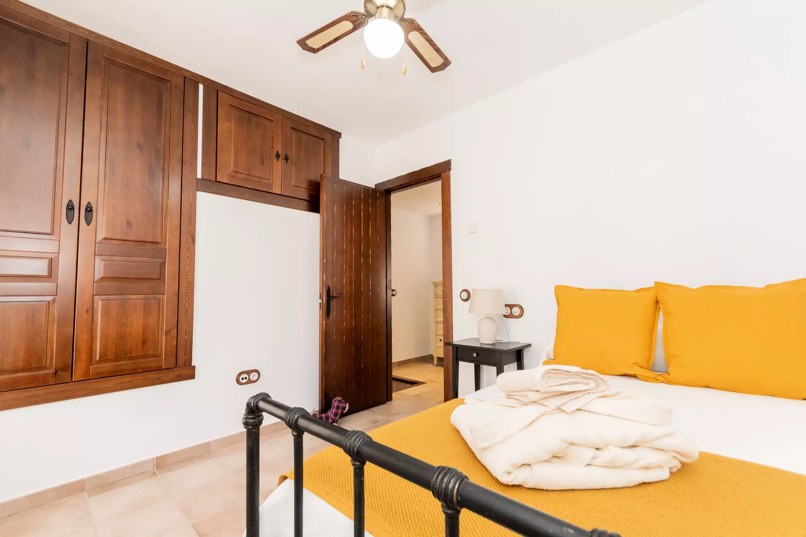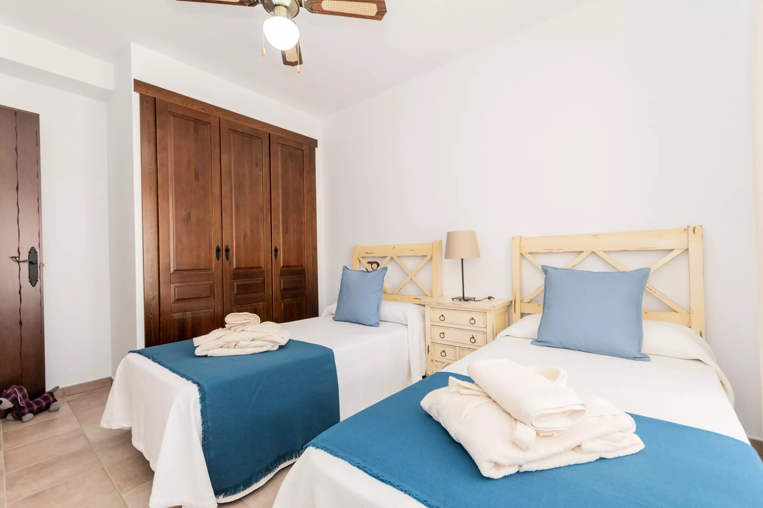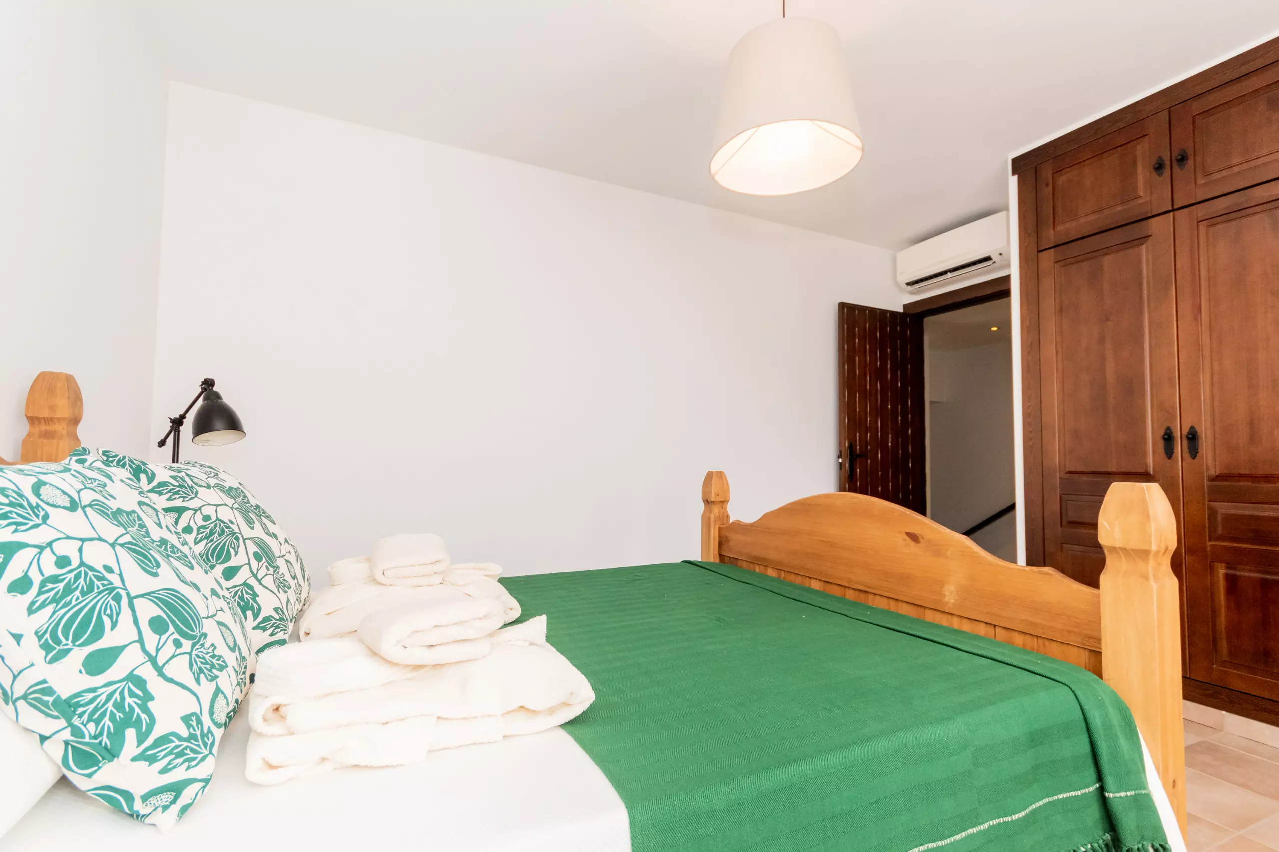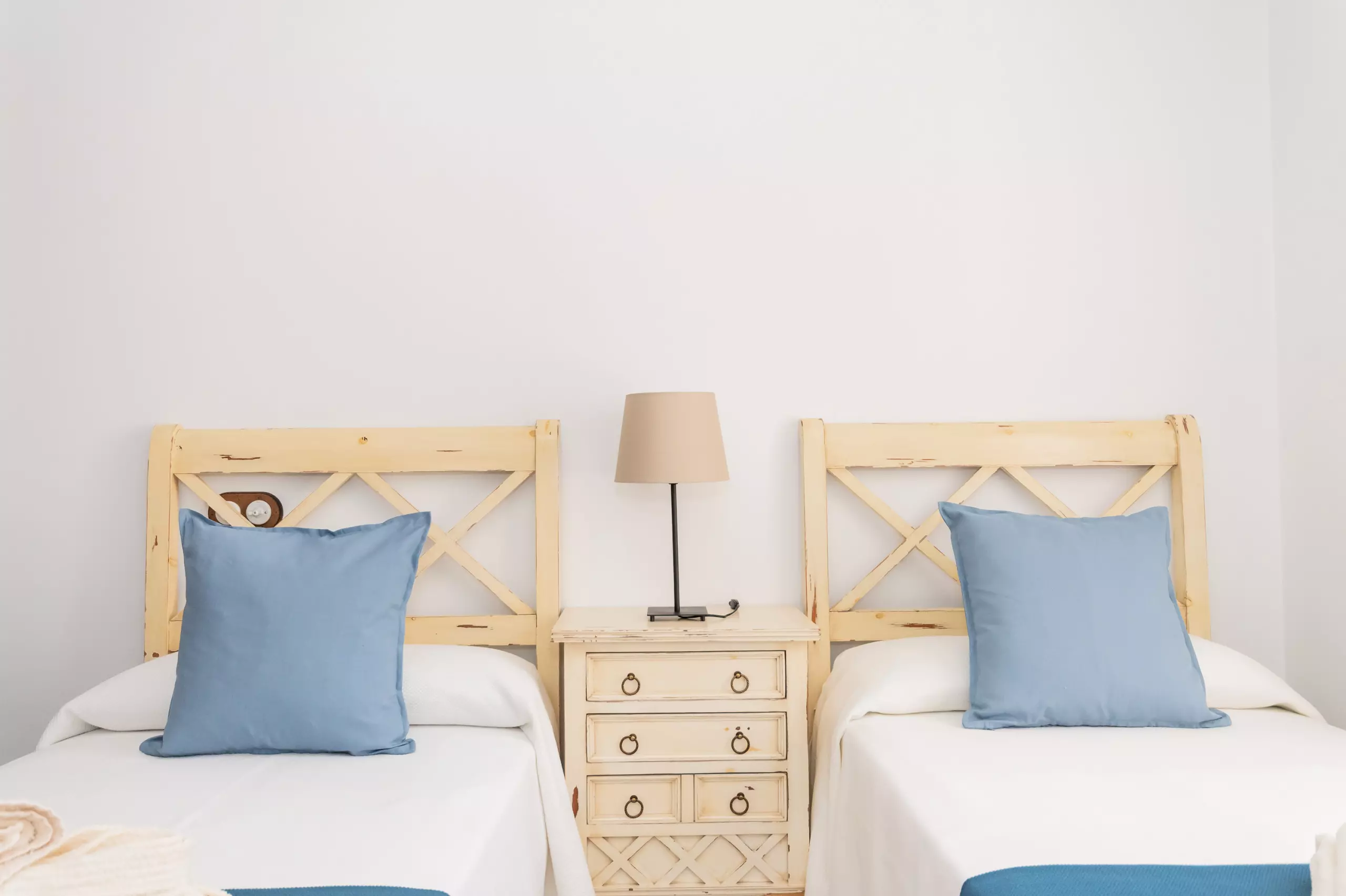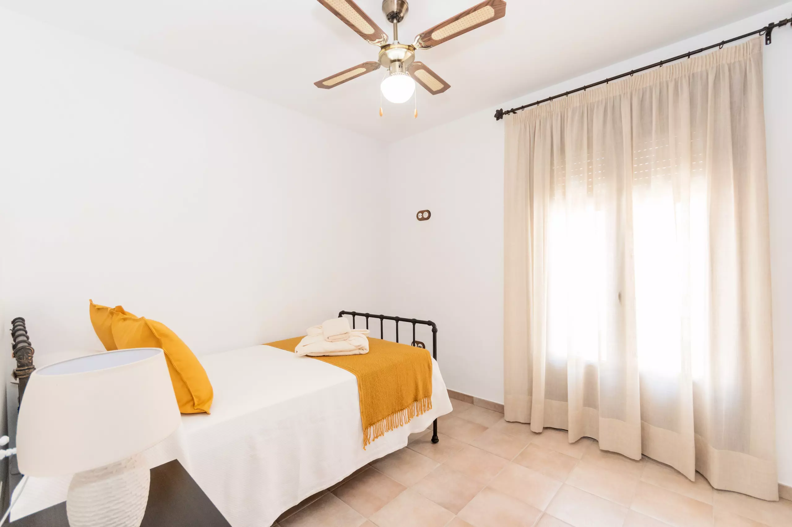 À l'étage supérieur, il y a trois chambres supplémentaires : une avec un lit double de 1,35 cm et la climatisation, une avec deux lits simples de 90 cm et un ventilateur, et une autre individuelle avec un lit de 1,05 cm et un ventilateur. Toutes les chambres disposent de grandes fenêtres qui apportent de la lumière naturelle et de l'espace pour ranger les bagages. Il y a également une grande salle de bain avec baignoire pour plus de confort.