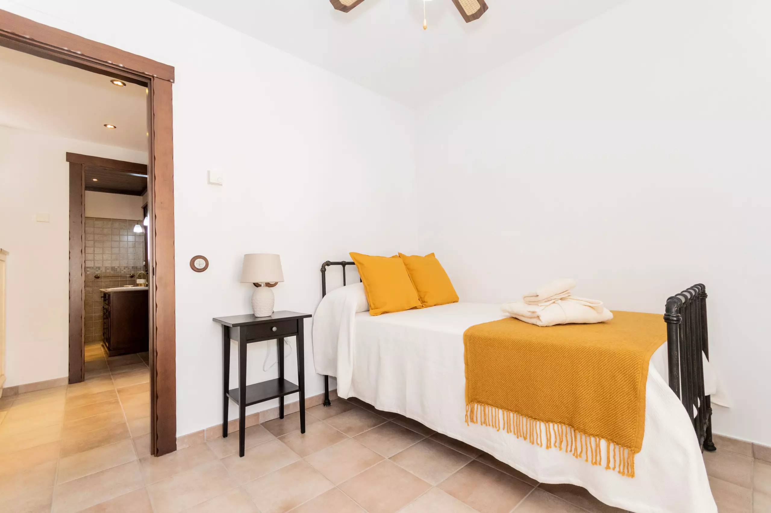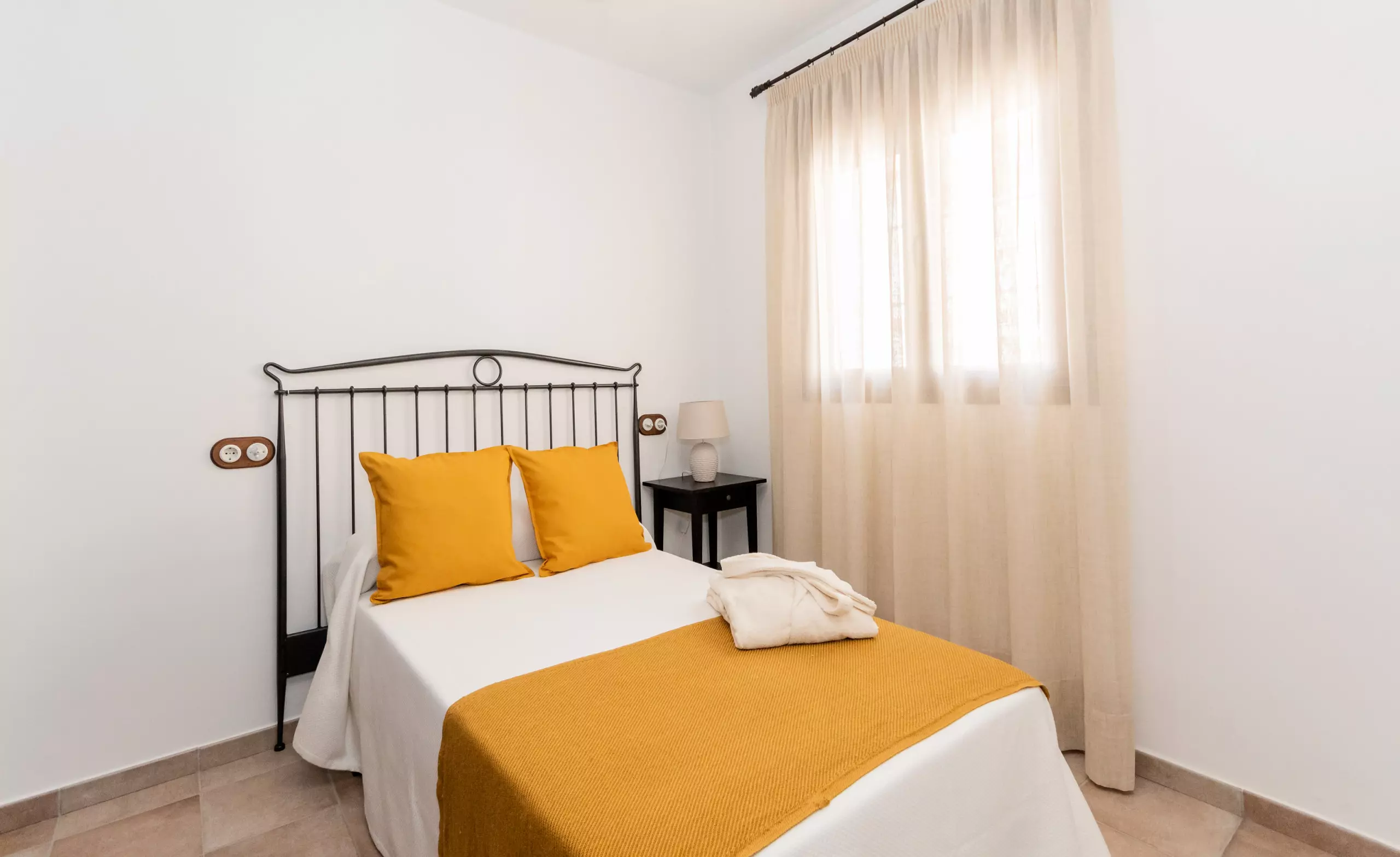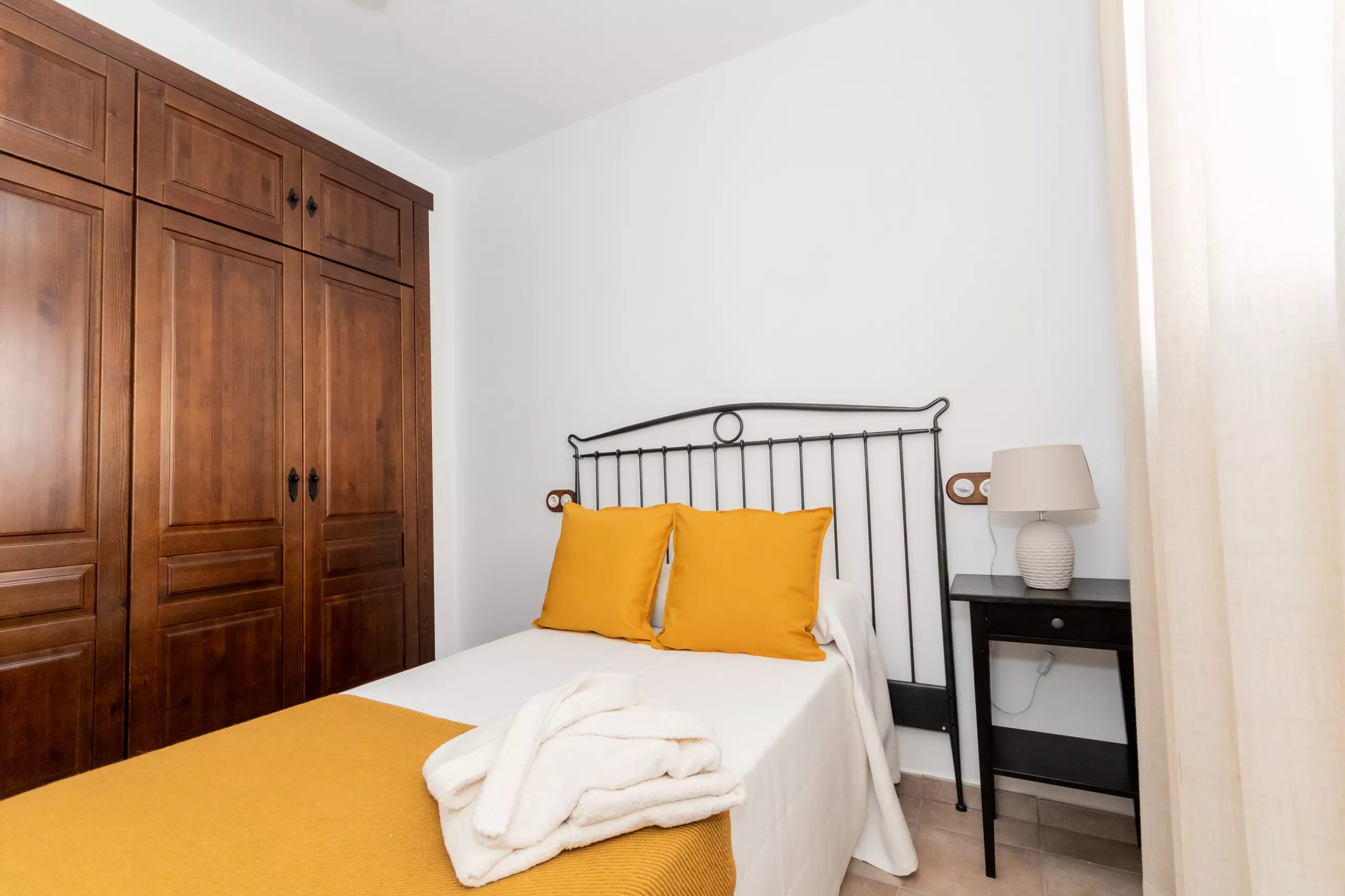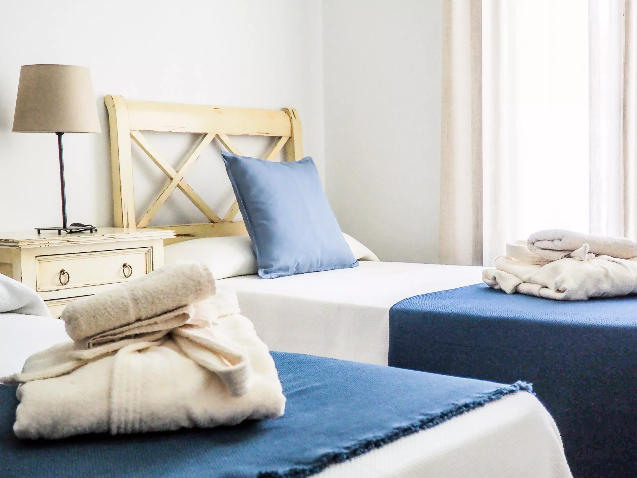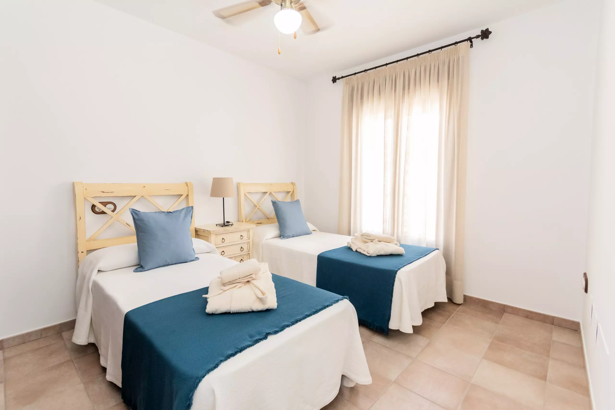À l'étage supérieur, il y a trois chambres supplémentaires : une avec un lit double de 1,35 cm et la climatisation, une avec deux lits simples de 90 cm et un ventilateur, et une autre individuelle avec un lit de 1,05 cm et un ventilateur. Toutes les chambres disposent de grandes fenêtres qui apportent de la lumière naturelle et de l'espace pour ranger les bagages. Il y a également une grande salle de bain avec baignoire pour plus de confort.
