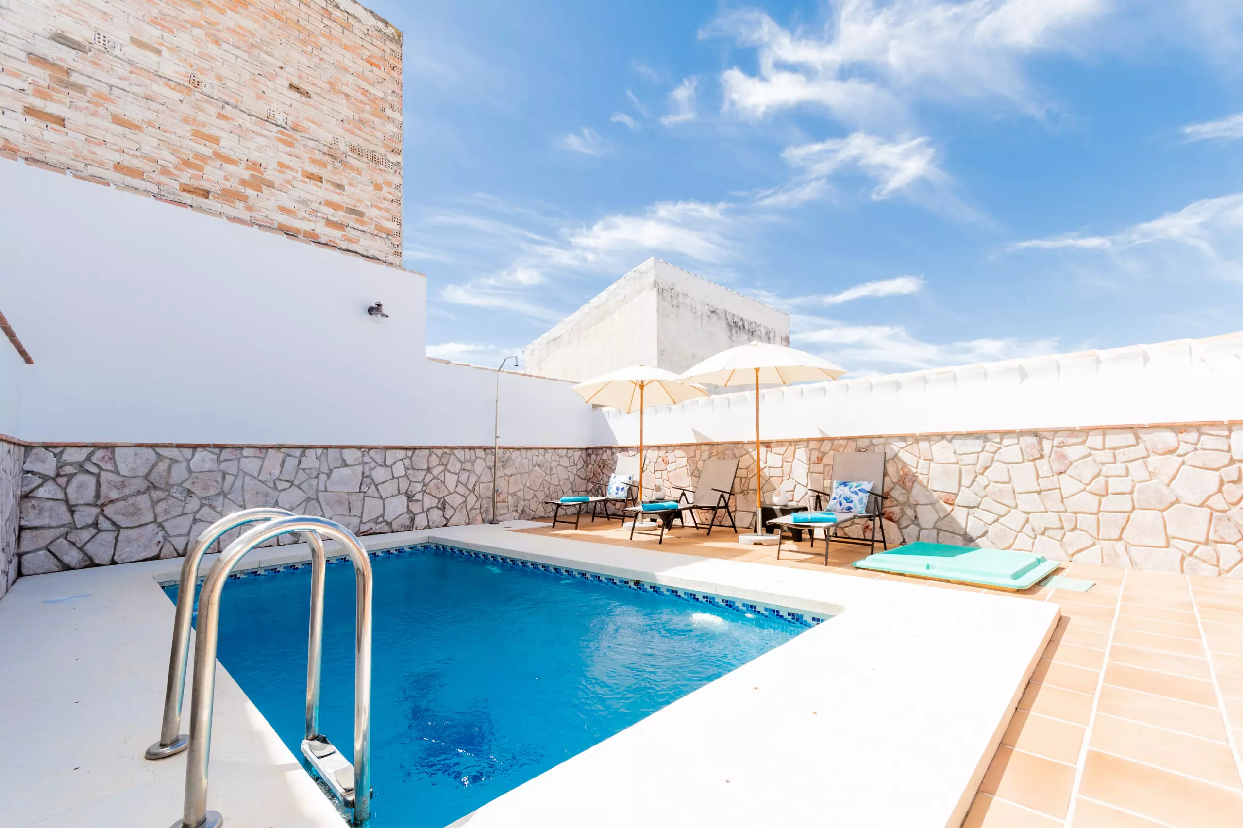 La cour se connecte à une piscine privée clôturée, où vous pourrez vous rafraîchir et prendre un bain de soleil sur les chaises longues, profitant d'une totale intimité et sécurité. De plus, à ce rez-de-chaussée se trouve une chambre individuelle avec un lit de 1,05 cm et un ventilateur, une salle de bain avec une douche et une buanderie.