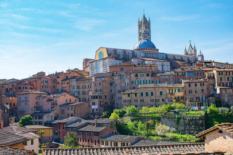 Après le petit déjeuner, rencontrez le chauffeur et partez pour Sienne. Dans l'après-midi, retrouvez votre guide pour découvrir la ville. Perchée sur ses trois collines, Sienne apparaît comme un joyau rouge au cœur de la végétation. Autrefois rivale de Florence, cette ville d'art et de culture a néanmoins conservé son identité traditionnelle. La ville est en effet parsemée de symboles évoquant sa puissance et son passé. Vous visiterez la Piazza del Campo : place principale de la ville, cet endroit est connu à la fois pour sa forme incurvée et son sol incliné en forme d'amphithéâtre, mais aussi pour l'attraction la plus populaire de Sienne, le Palio. Cette course hippique a lieu deux fois par an, en juillet et en août, et oppose les 17 contrades de la ville. Sur la Piazza del Campo, ne manquez pas de visiter le Palazzo Pubblico et sa tour. Montez au sommet de la Torre del Mangia pour profiter d'une vue imprenable sur la ville. La cathédrale Duomo di Siena est une impressionnante construction gothique érigée entre 1214 et 1263. Le bâtiment est décoré de blocs de marbre blanc ainsi que de bandes vertes et noires représentant les couleurs de la ville. Nous vous conseillons d'opter pour le « Pass Opa Si » qui vous permettra d'accéder à tous les espaces du Duomo : la cathédrale, la crypte, le baptistère, le musée de l'Opéra et la Facciatone. Passez la nuit à Sienne.