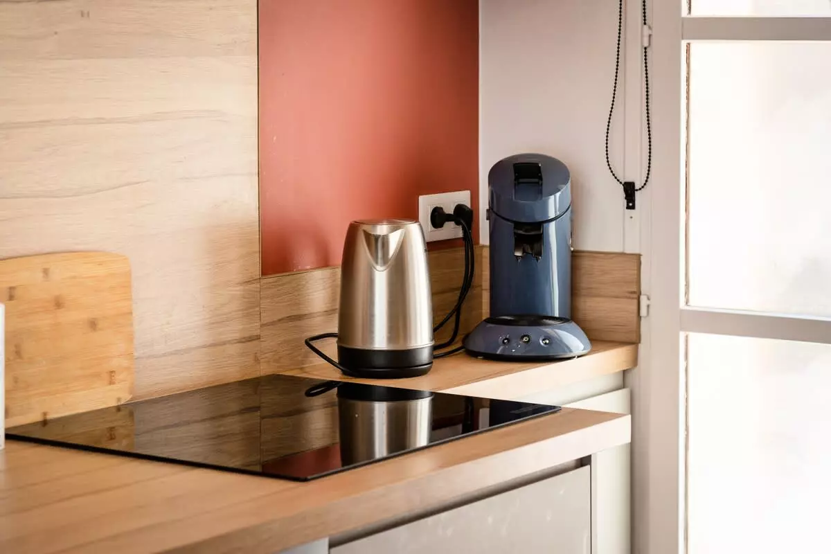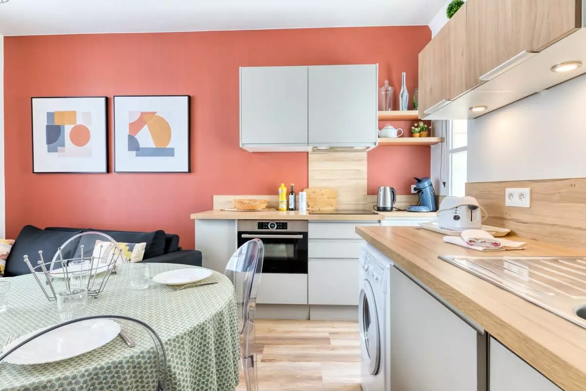 La cuisine ouverte est entièrement équipée avec tout le nécessaire : four, plaques à induction, hotte, réfrigérateur, cafetière Senseo, bouilloire, grille-pain et lave-linge séchant.