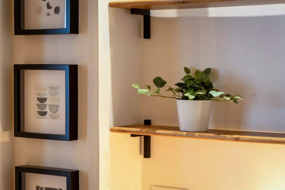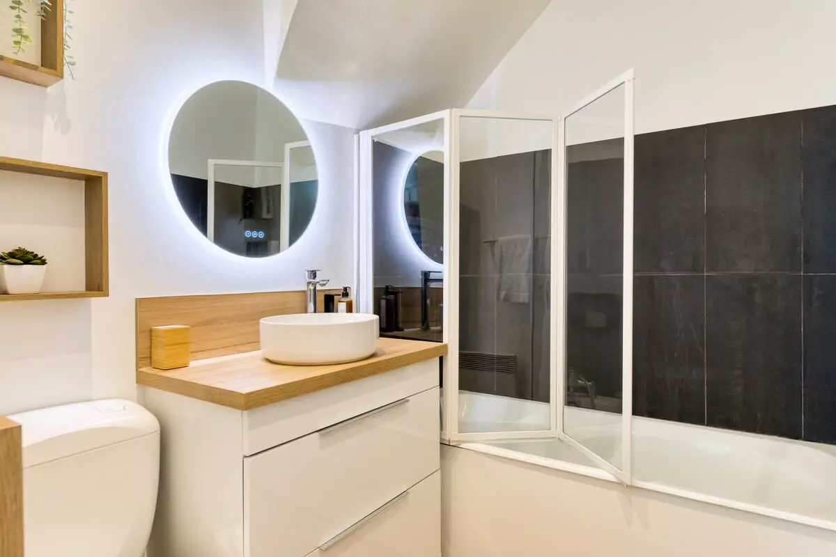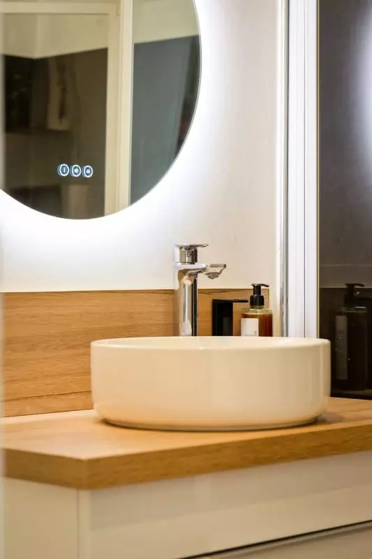 Dès l’entrée, vous trouverez un meuble de rangement contenant les essentiels pour l’entretien du logement (produits ménagers, table et fer à repasser, étendoir), ainsi qu’une salle de bain avec WC et meuble vasque.