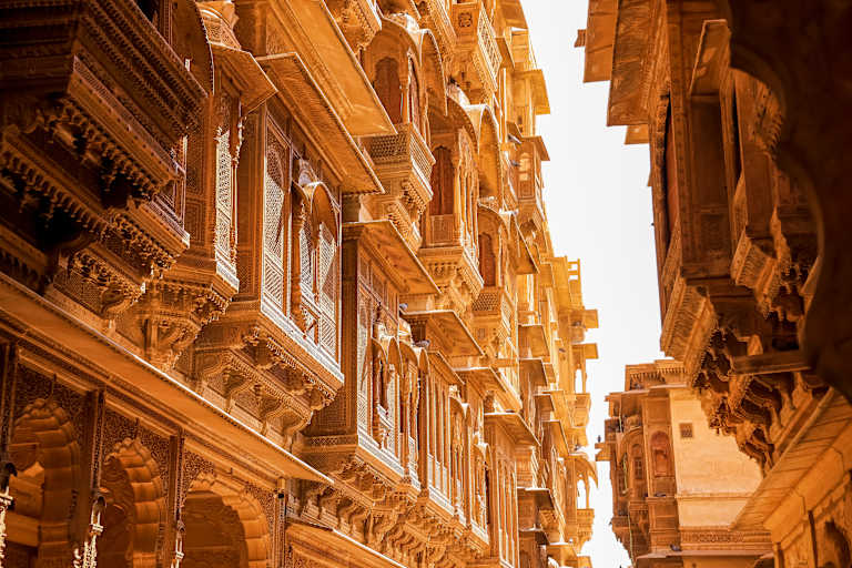 Départ pour la visite de Jaisalmer : Magnifique ville caravanière fondée en 1155 par le Rao Jaisal. Promenade jusqu'à la forteresse et visite du palais du Maharaja, admiration des maisons "havelis" aux façades finement sculptées et aux balcons décorés de dentelle de pierre. Jaisalmer a été décrite comme un musée à ciel ouvert, et pénétrer dans ses rues étroites, c'est se plonger dans l'ère du passé.