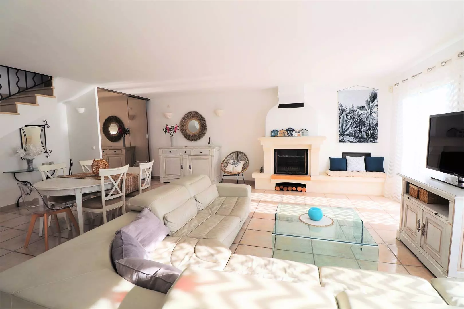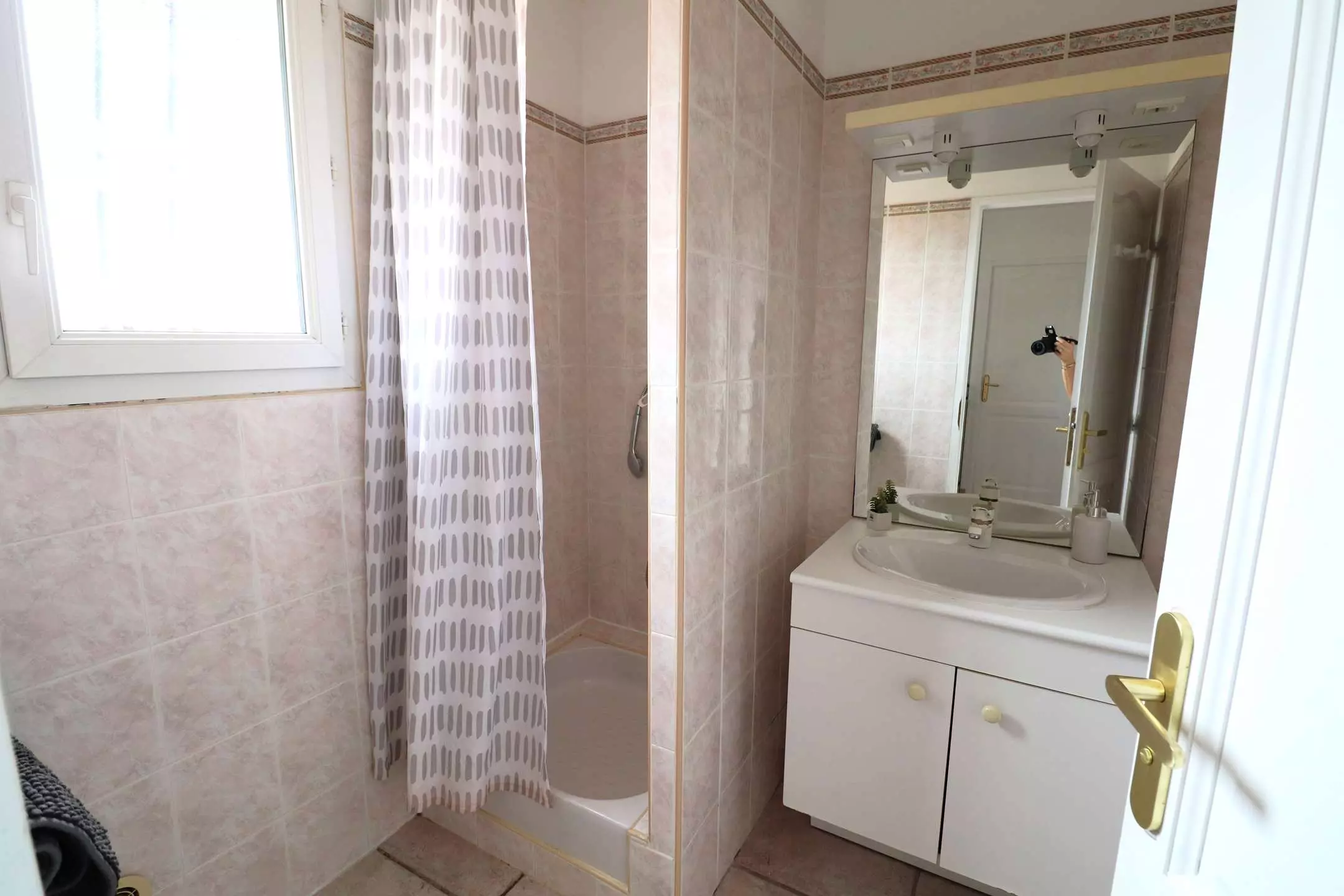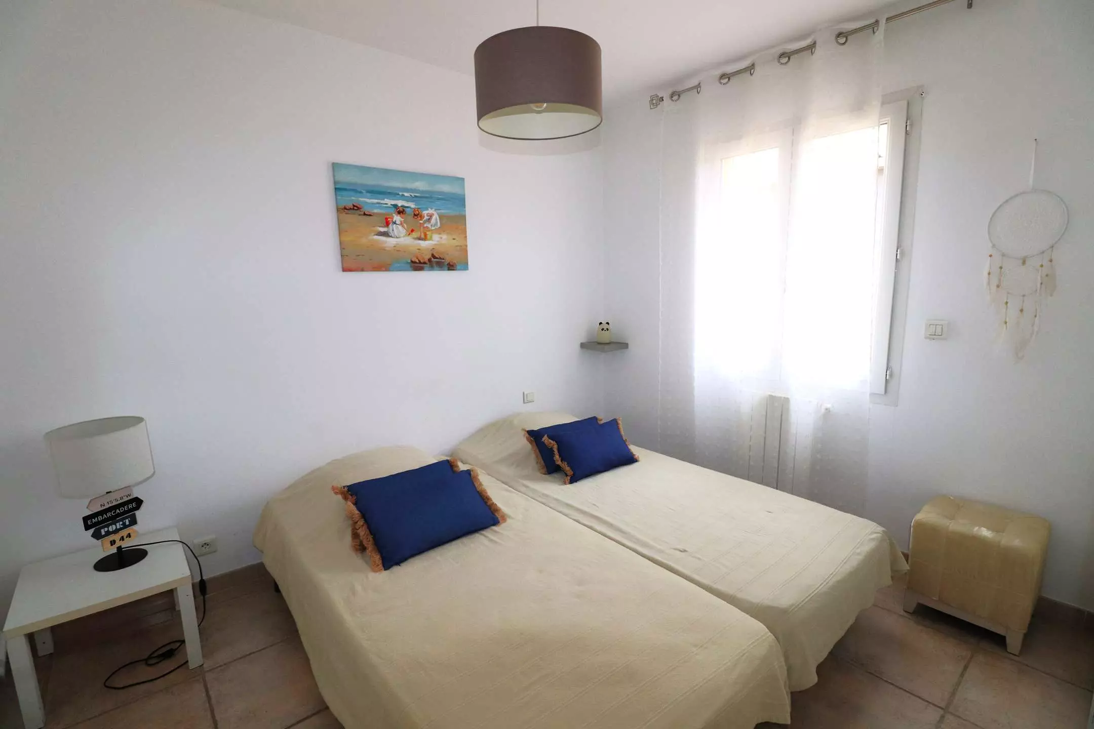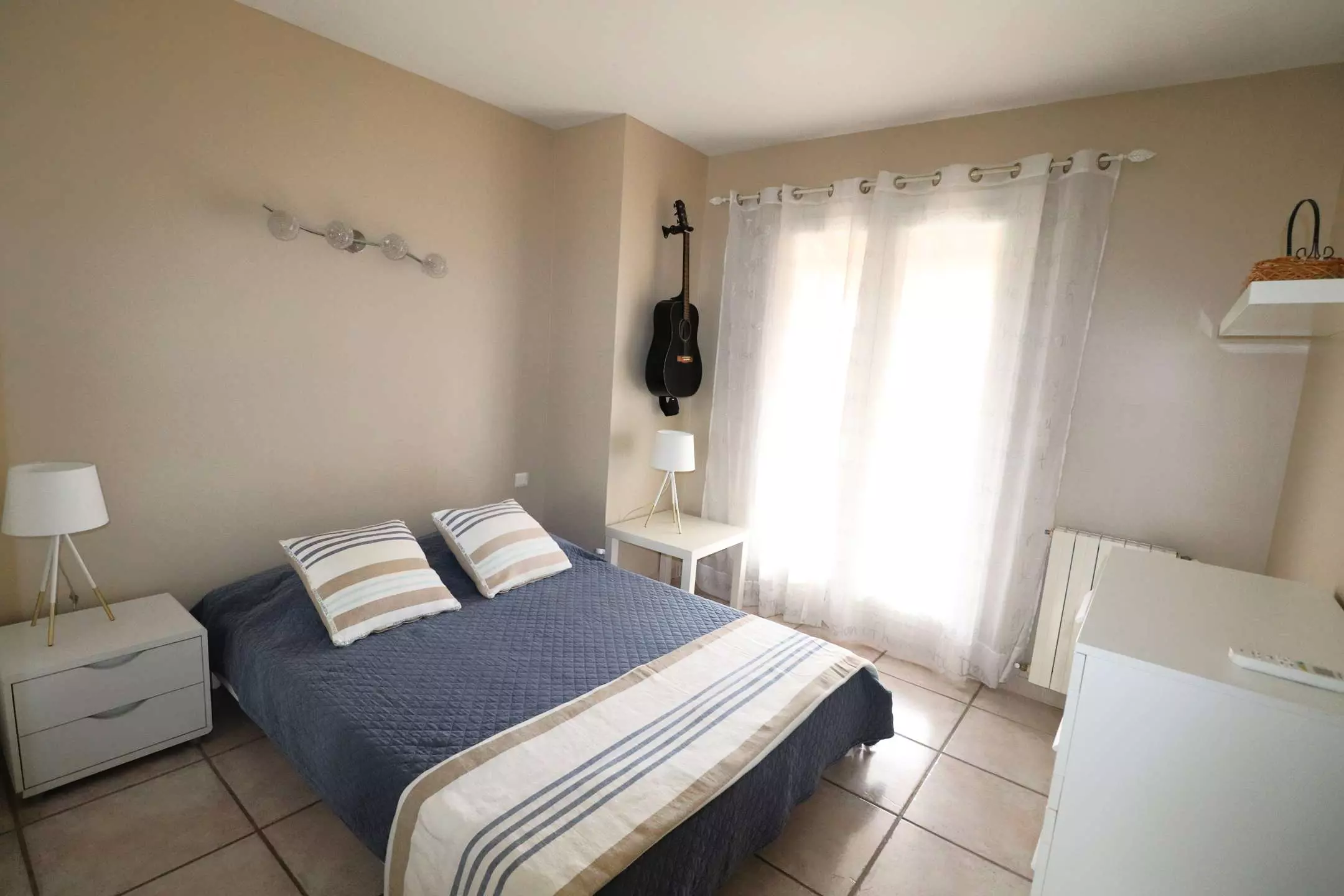 Cette villa se compose au rdc d'une entrée, cuisine équipée (lave-vaisselle, four, micro-ondes, plaques vitro.) donnant sur terrasse aménagée. Séjour de 41m² donnant sur la terrasse extérieure et la piscine, une chambre avec 2 lits simples et placards, une chambre avec 1 lit 2 personnes et placards. SDB, wc séparés. A l'étage : salle d'eau, wc séparés, une chambre composée d'un grand placard et d'un lit double, une autre chambre avec 2 lits simples et placards. Les 2 chambres donnent sur une terrasse extérieure de 10m². Climatisation dans chaque chambre sauf une avec ventilateur. 2 stationnements intérieurs et 1 à l'extérieur.