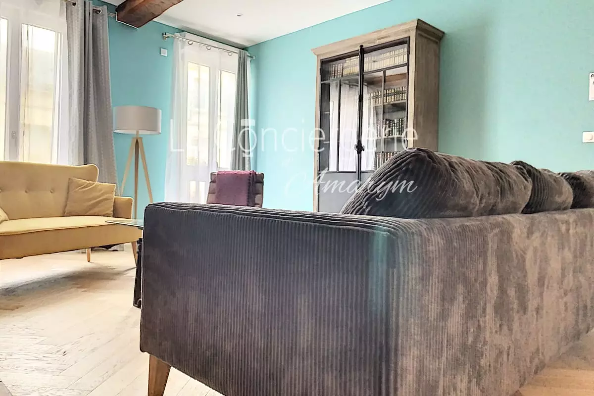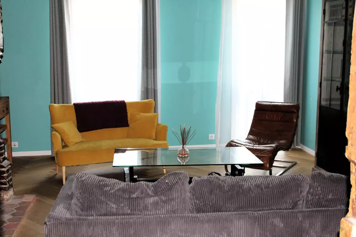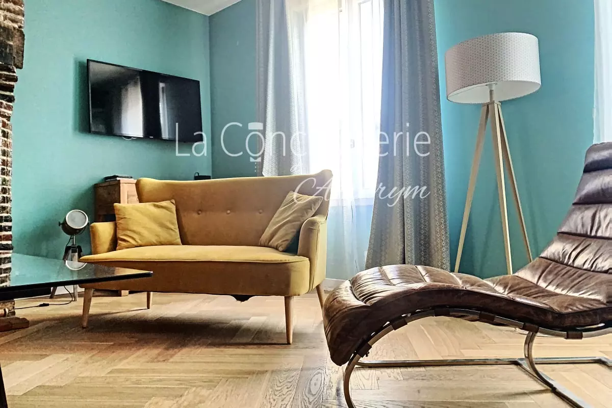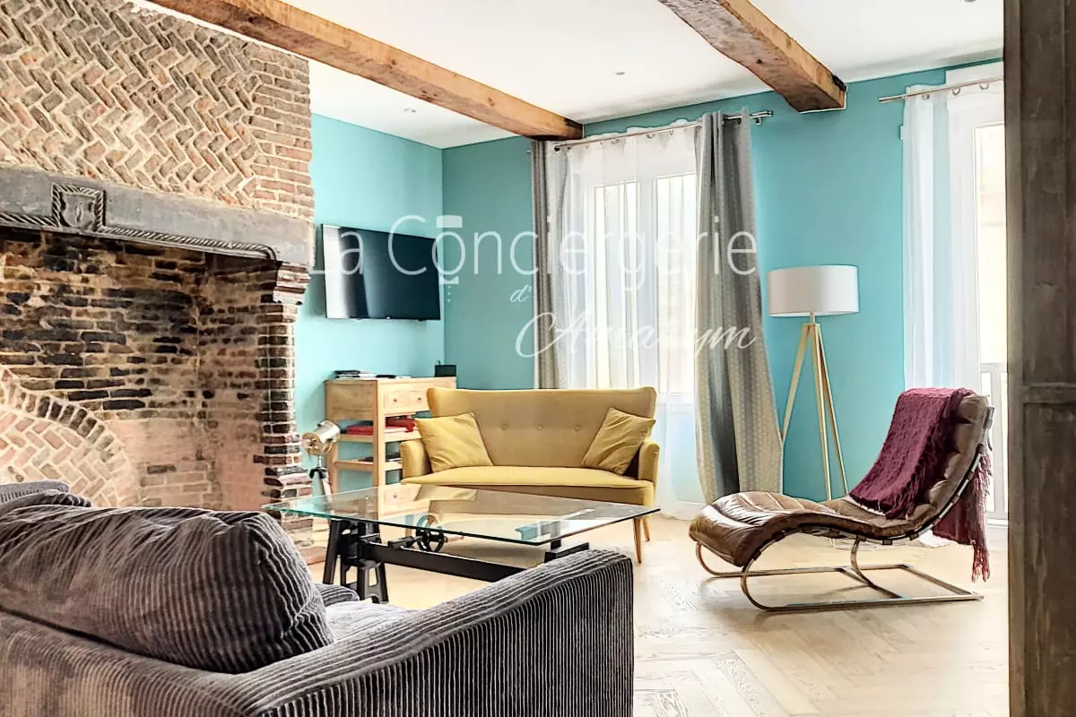 Un salon spacieux et convivial : Le cœur de cet appartement est sans conteste son grand salon baigné de lumière, où vous pourrez vous détendre en famille ou entre amis. Disposant de plusieurs canapés et fauteuils confortables, il invite à la convivialité autour d’une cheminée d’époque (non fonctionnelle), qui ajoute une touche d’élégance et d’histoire à la pièce. Une télévision est également à votre disposition pour vos moments de divertissement.
