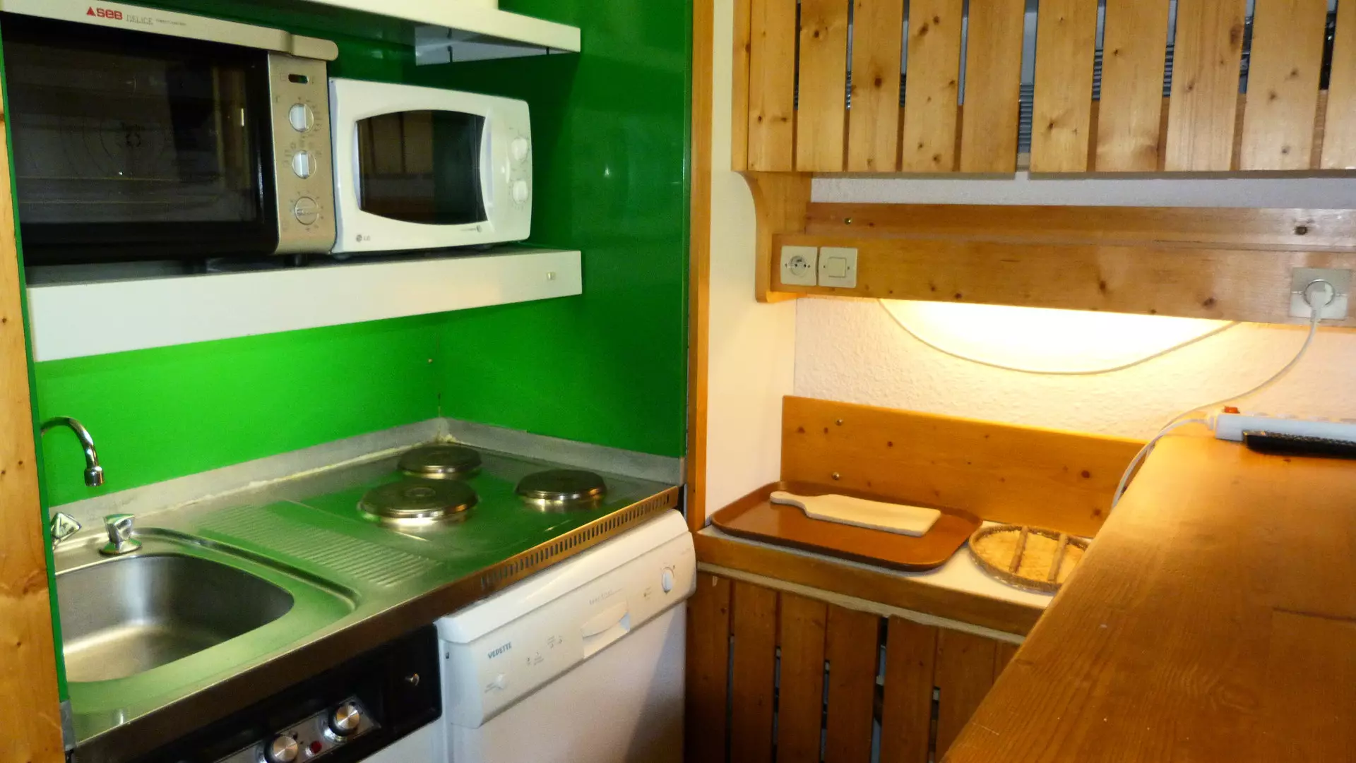 Elle est entièrement équipée de plaques électriques, d'un four, d'un réfrigérateur, d'un lave-vaisselle, d'un grille-pain, d'une bouilloire, d'une cafetière et d'un micro-onde.