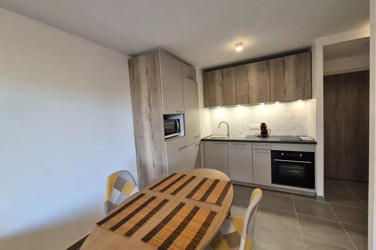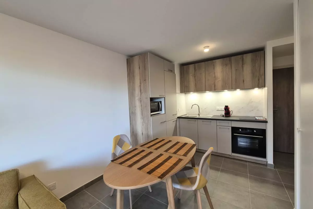 - Salon: Canapé convertible (lit 120 cm) idéal pour 2 enfants, TV, grande baie vitrée donnant sur une terrasse exposée EST, offrant une belle luminosité et une vue dégagée.