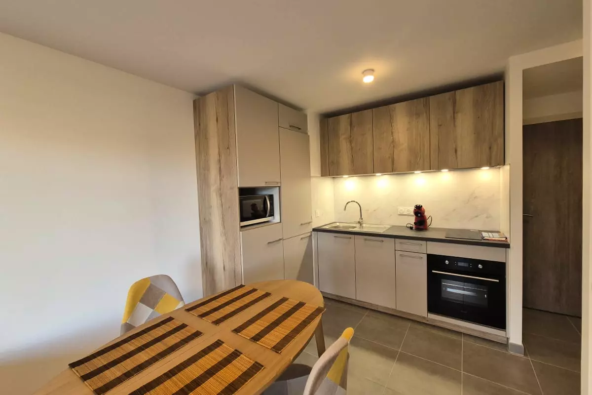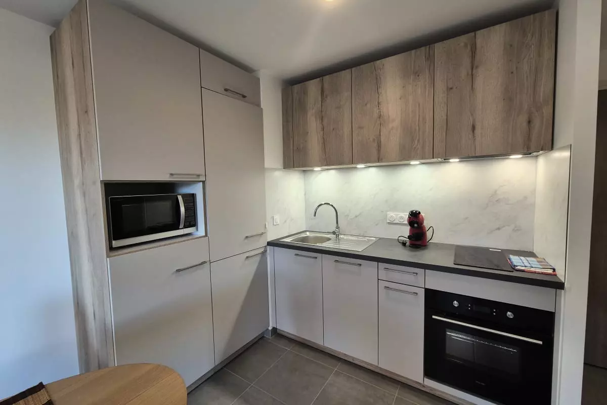 - Cuisine ouverte : Moderne et fonctionnelle, équipée d’un lave-vaisselle, plaque de cuisson, grand réfrigérateur avec congélateur, machine à café dolce gusto, micro onde, grille pain, four, appareil à raclette
