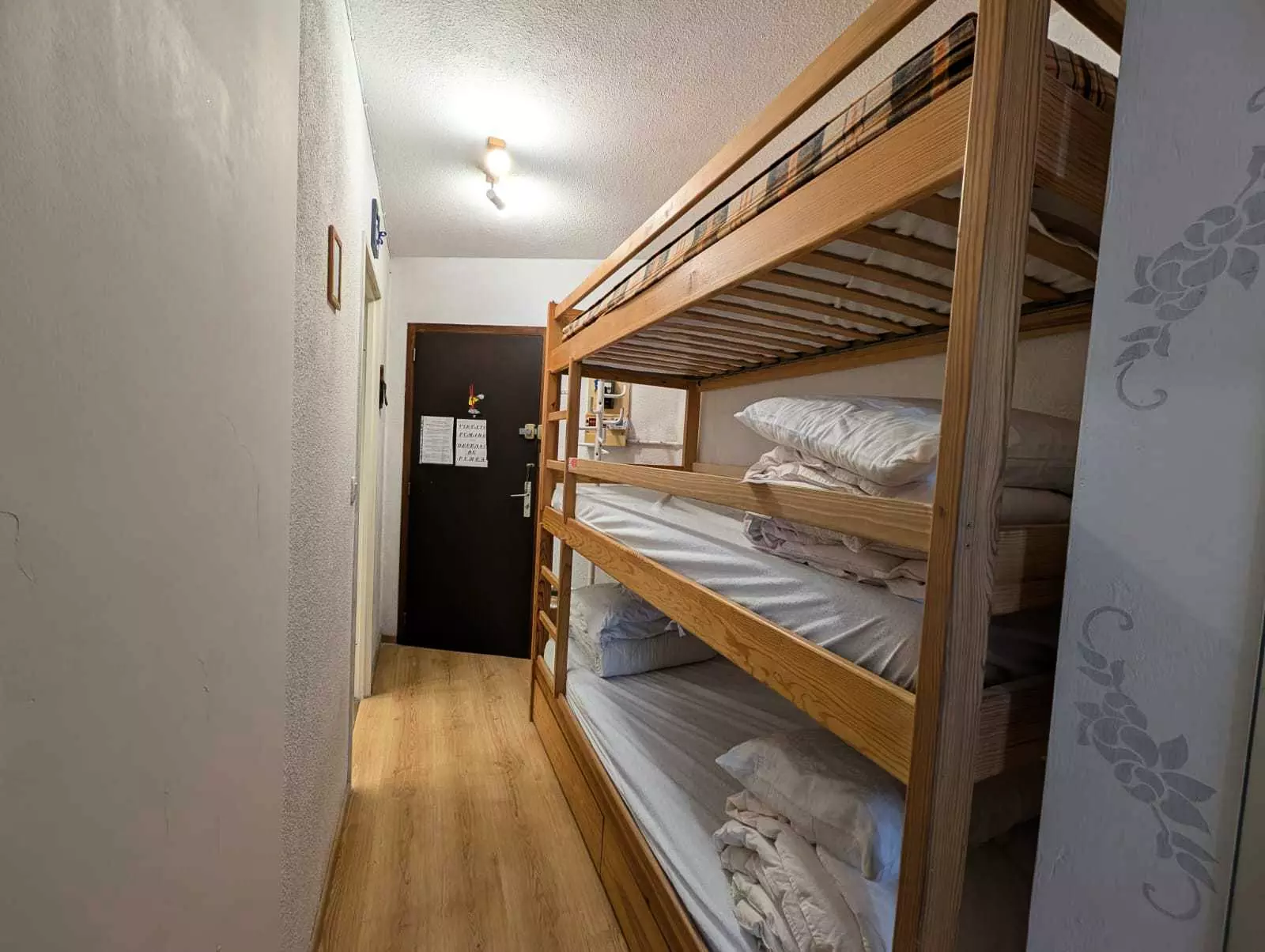 Coin montagne séparé du salon par un rideau : 2 lits superposés + grand placard au dessus.