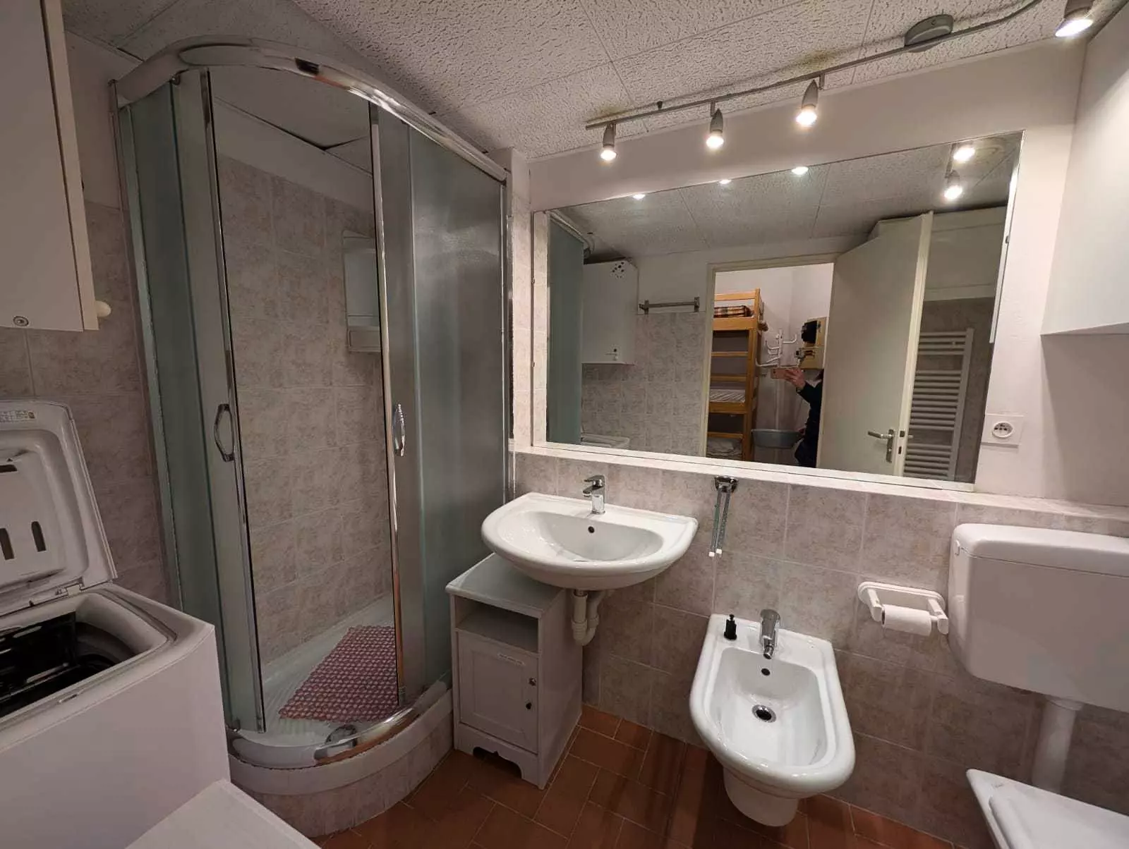 Salle d'eau : cabine douche avec pare-douche, WC, lavabo, bidet, lave-linge