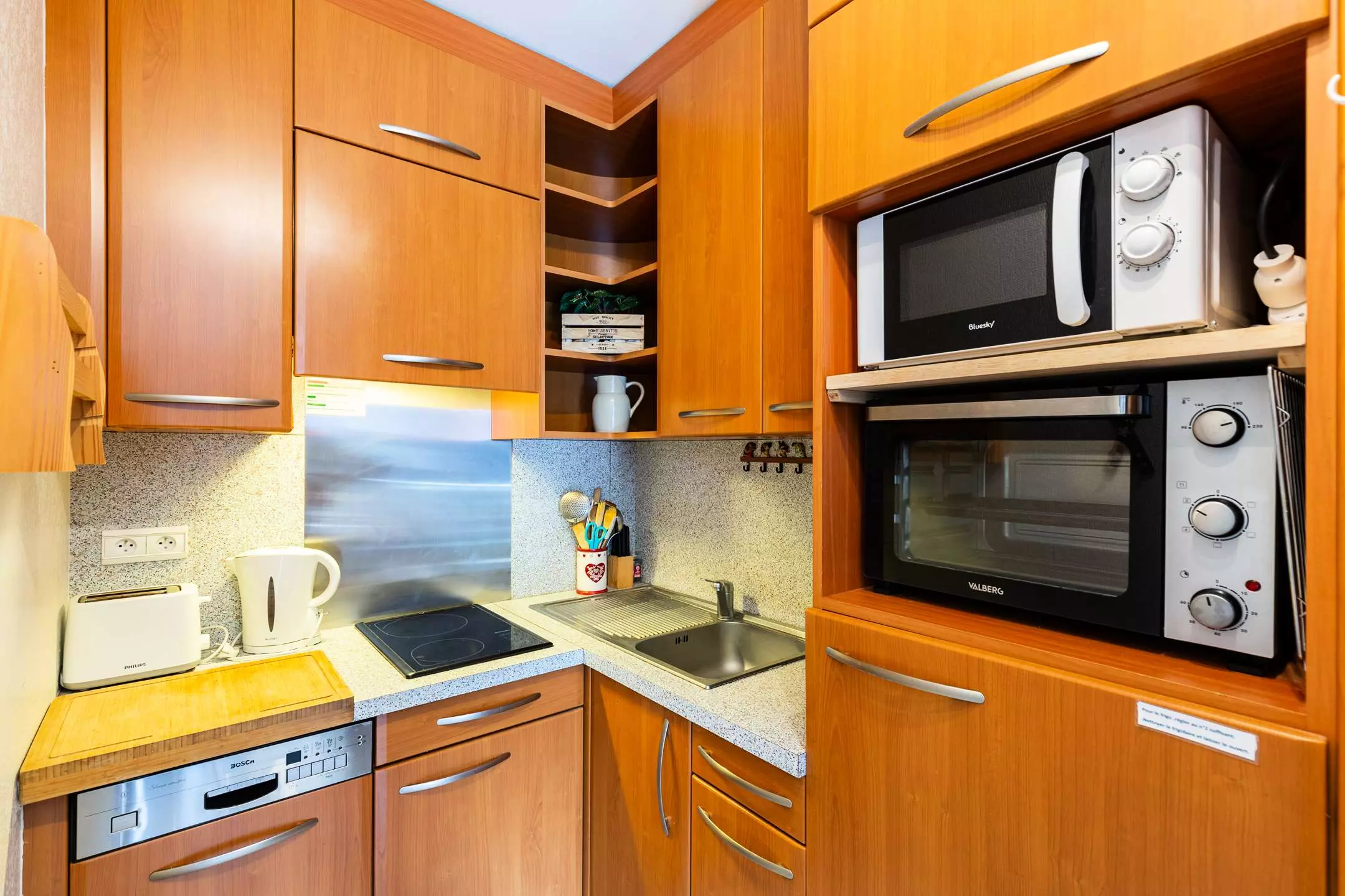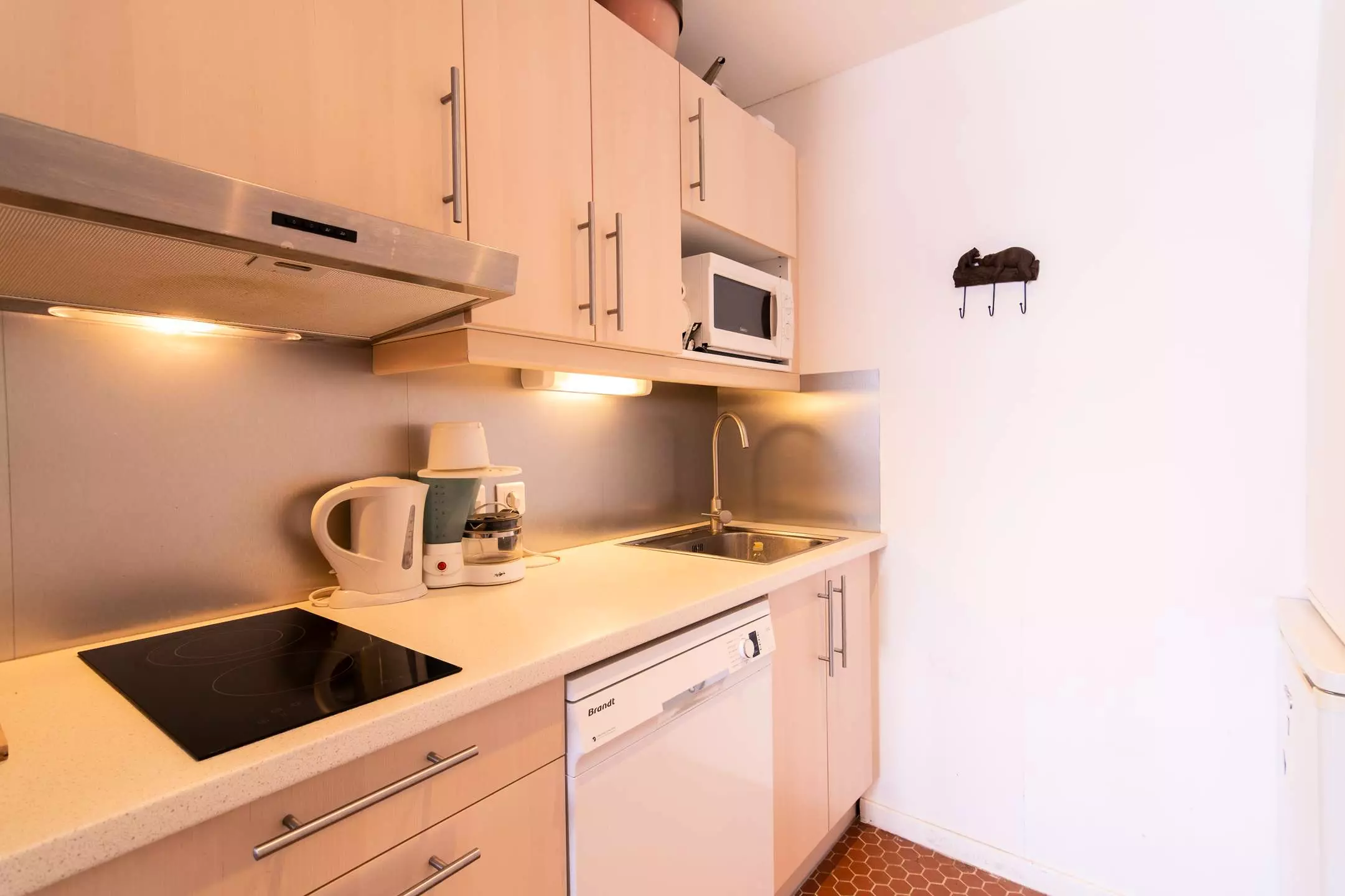 Cuisine ouverte, moderne et entièrement équipée : plaques vitrocéramiques, four, lave-vaisselle, congélateur, vaisselle et ustensiles complets