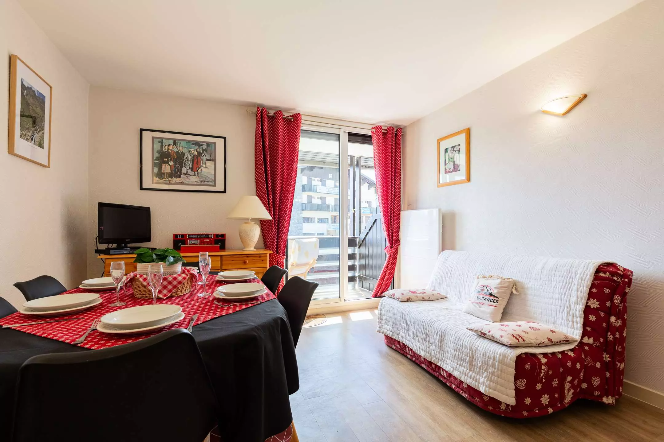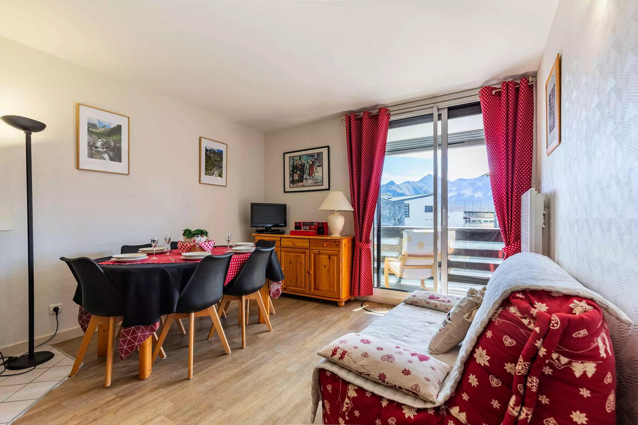 Séjour lumineux avec canapé BZ (couchage en 140cm), TV et accès balcon (mobilier extérieur fourni pour profiter des beaux jours)