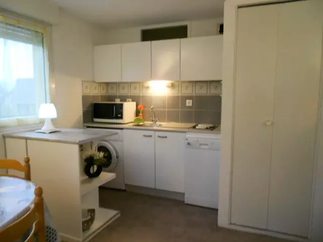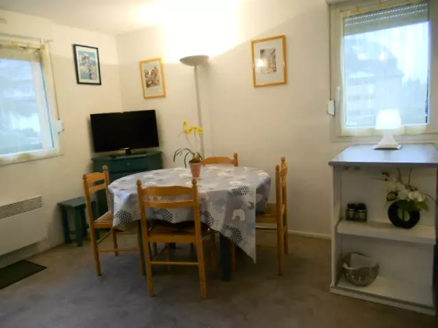 Au premier étage de la résidence ASPIN I, appartement pour 4 personnes composé : Un séjour avec canapé et kitchenette équipée 2 plaques, évier, frigo,micro-ondes, lave-linge et rangements donnant sur balcon Sud. Un espace nuit séparé avec un lit 2 pers. et une cabine avec fenêtre et 2 lits en 90 superposés.Salle de bain avec baignoire. Wc séparés. Moquette. Env. 30 M2.Séjour 12 M2 env.Parkg. Appartement coquet, confortable et ensoleillé.