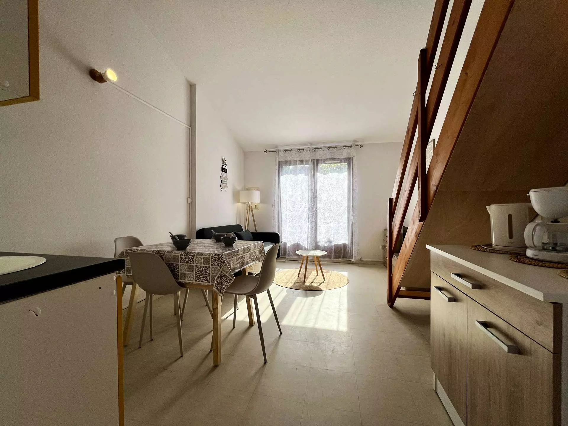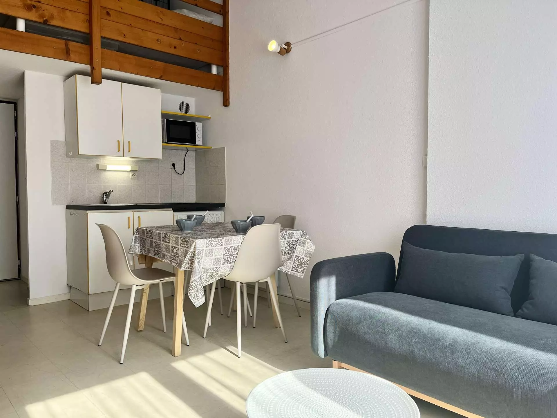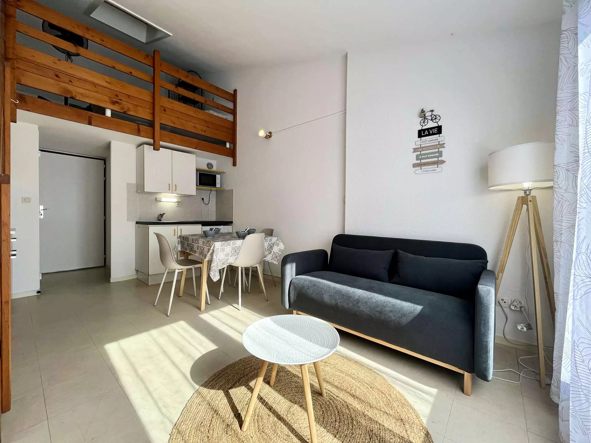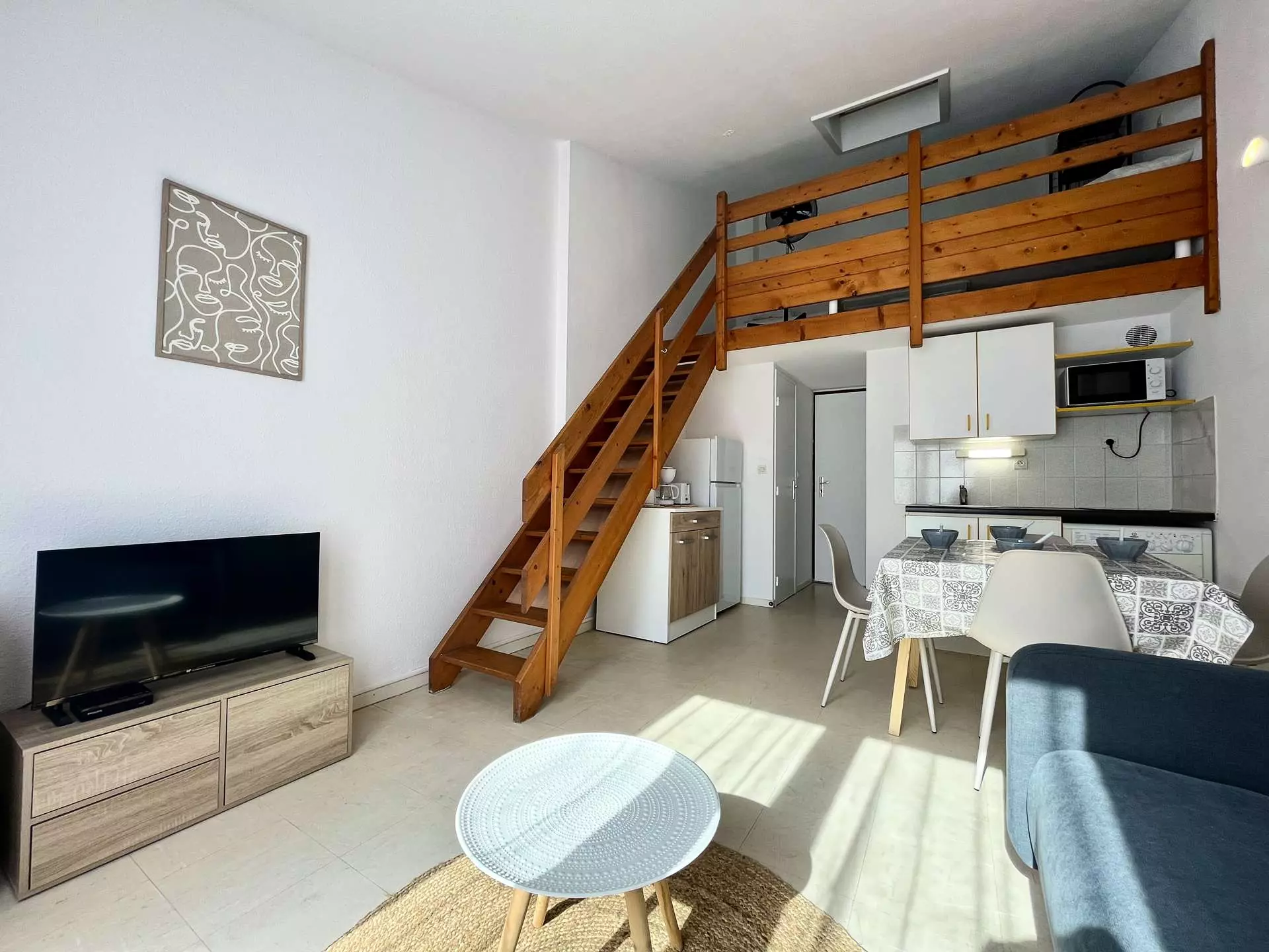 Cette location proche de la plage entièrement rénovée est aménagée en un séjour canapé convertible deux places, son espace repas avec coin cuisine équipé, d'une salle d'eau et wc séparés. A l'étage une mezzanine ouverte avec deux lits d'une personne. Agréable terrasse pour prendre vos repas.