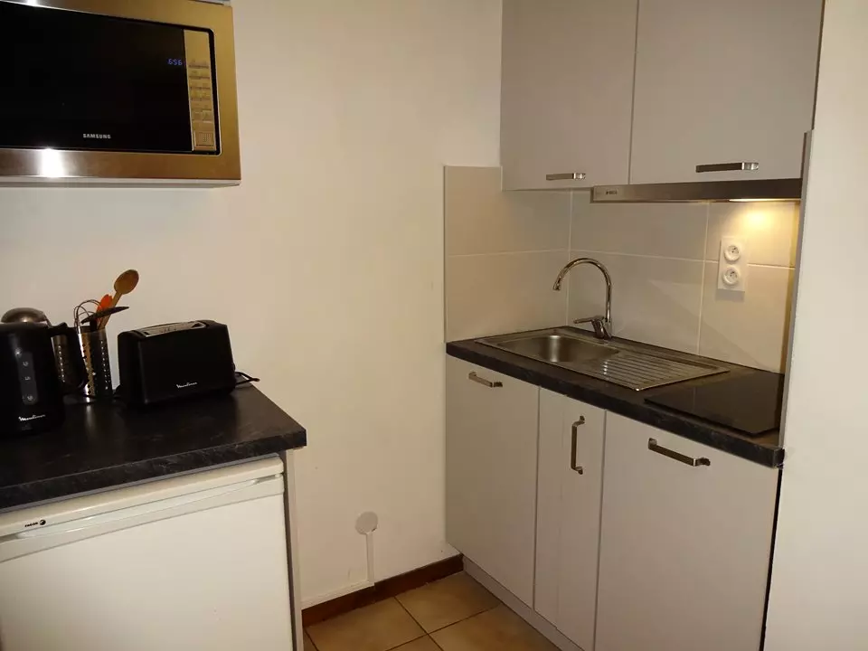 Une kitchenette équipée avec plaque-vitro, lave-vaisselle, frigo, micro-ondes, mini-four.
