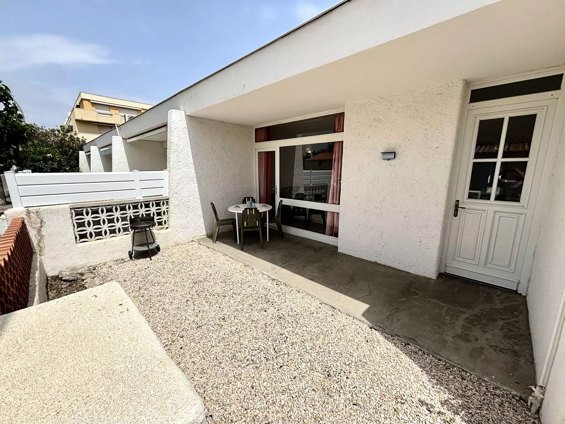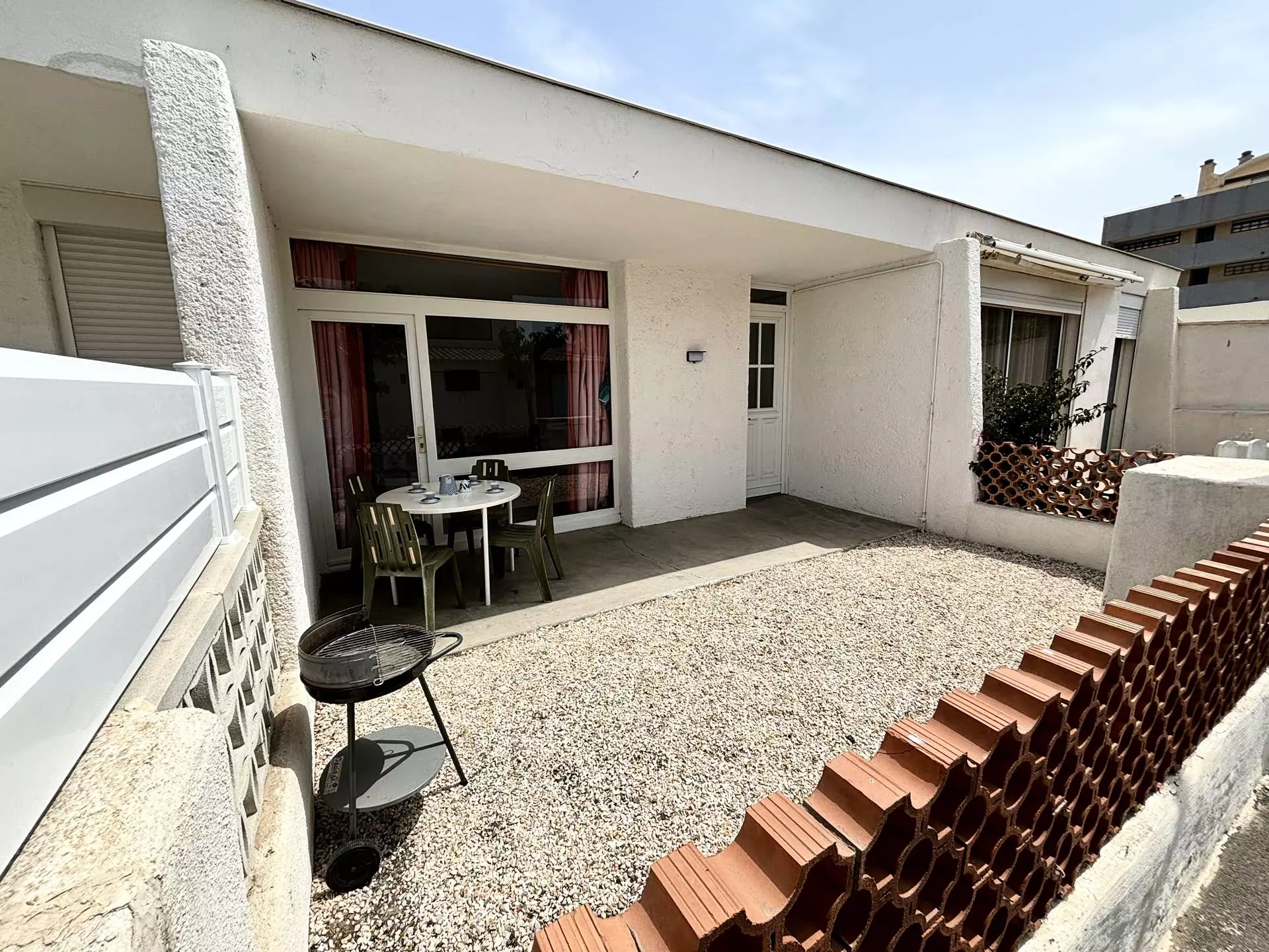 Les avantages de cette location saisonnière : une terrasse à l'avant et une autre à l'arrière pour profiter au maximum du soleil avec salon de jardin.