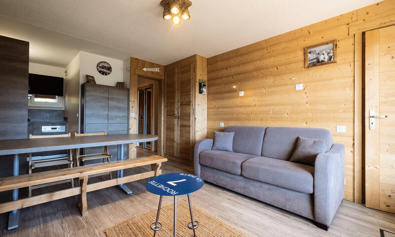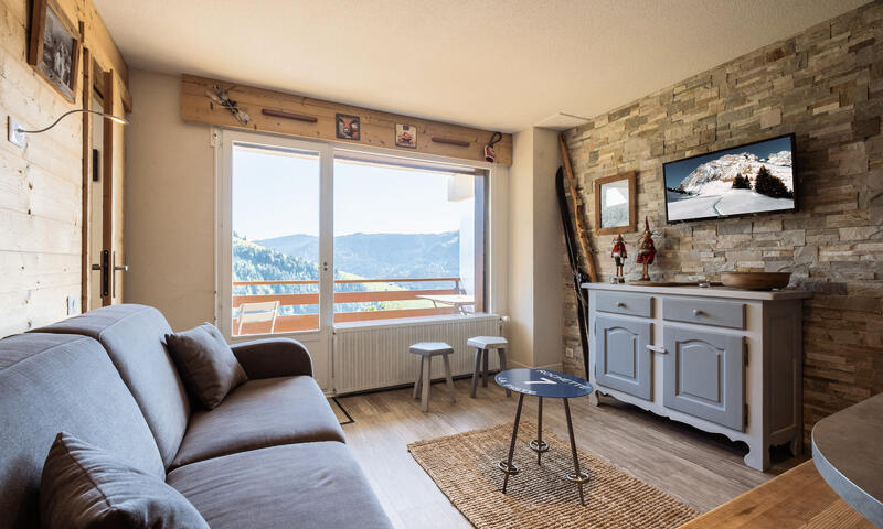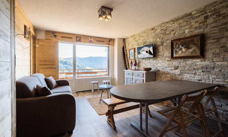 - SEJOUR (16.53 m²) : coin repas, TV écran plat, 1 CANAPE-LIT RAPIDO (140), baie + porte-fenêtre, accès balcon sud, vue chalets voisins / pistes / montagne