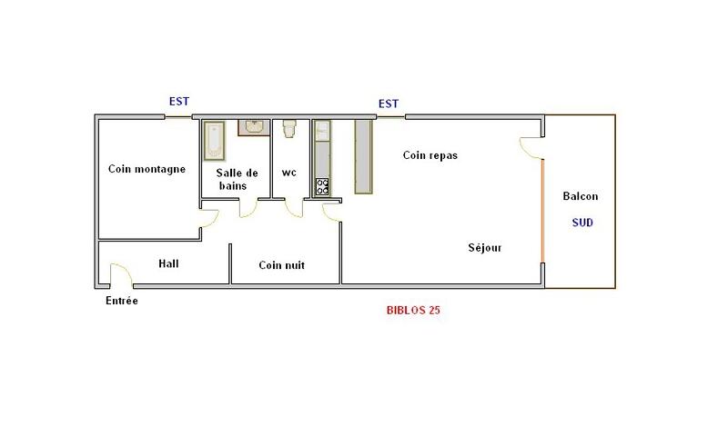 - SEJOUR (12.51 m²) : coin repas, 2 BANQUETTES-LITS 1 PLACE (80), TV écran plat + lecteur DVD, fenêtre + porte-fenêtre, balcon sud, vue station / montagne