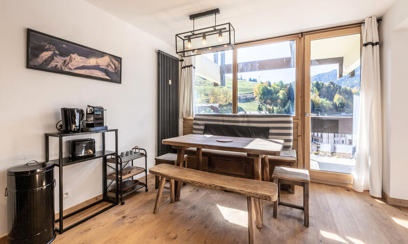 - SEJOUR (9.49m²) COIN REPAS : cheminée à INSERT, baies, porte-fenêtre sud, balcon sud ouest, vue résidences voisines / station / montagne