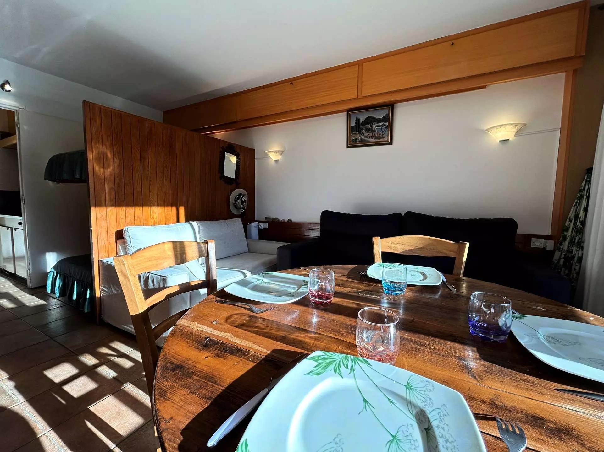 La pièce à vivre dispose d'un coin nuit avec lits superposés en 80 et un séjour avec un canapé lit en 140 et une télévision.