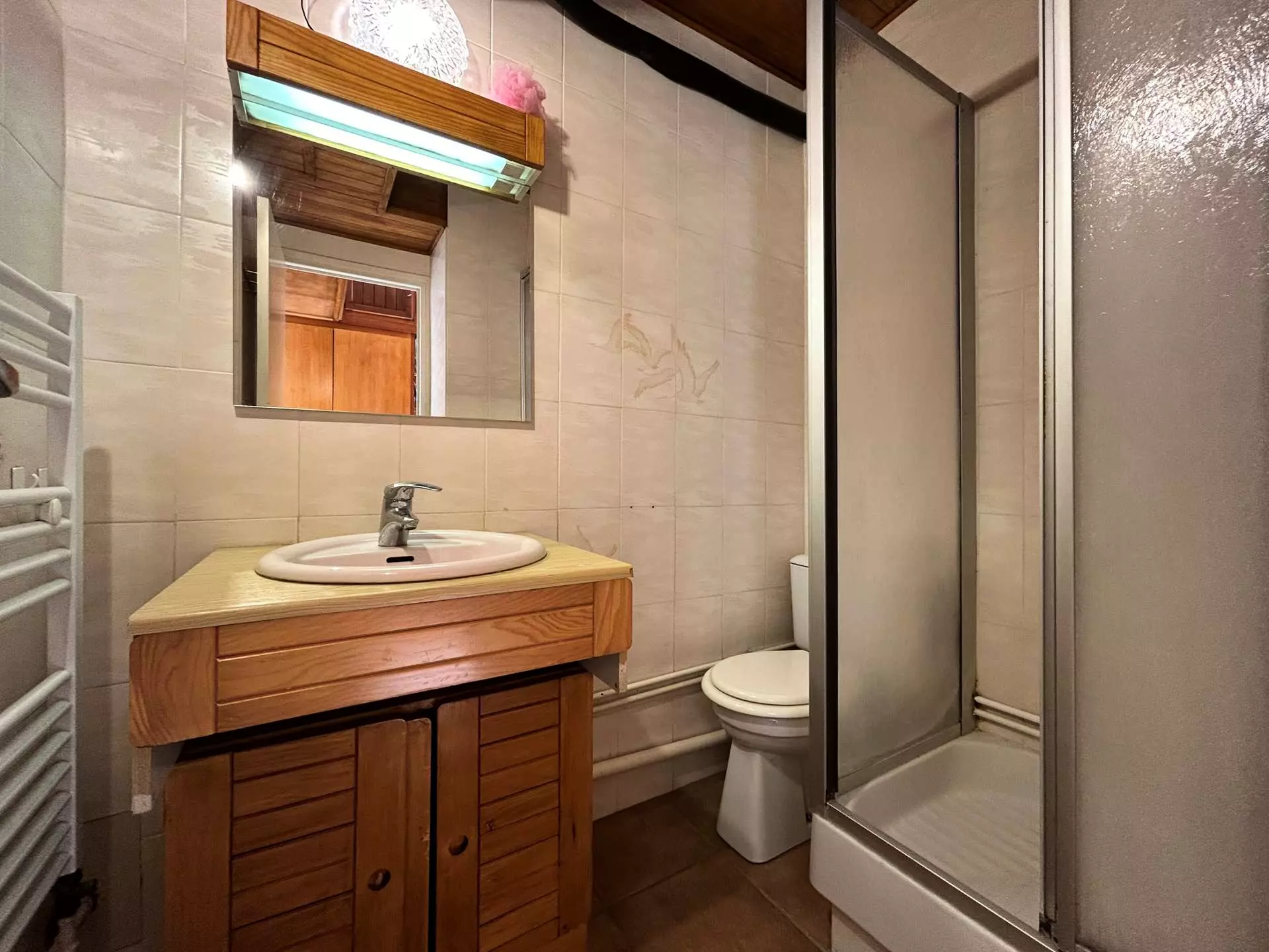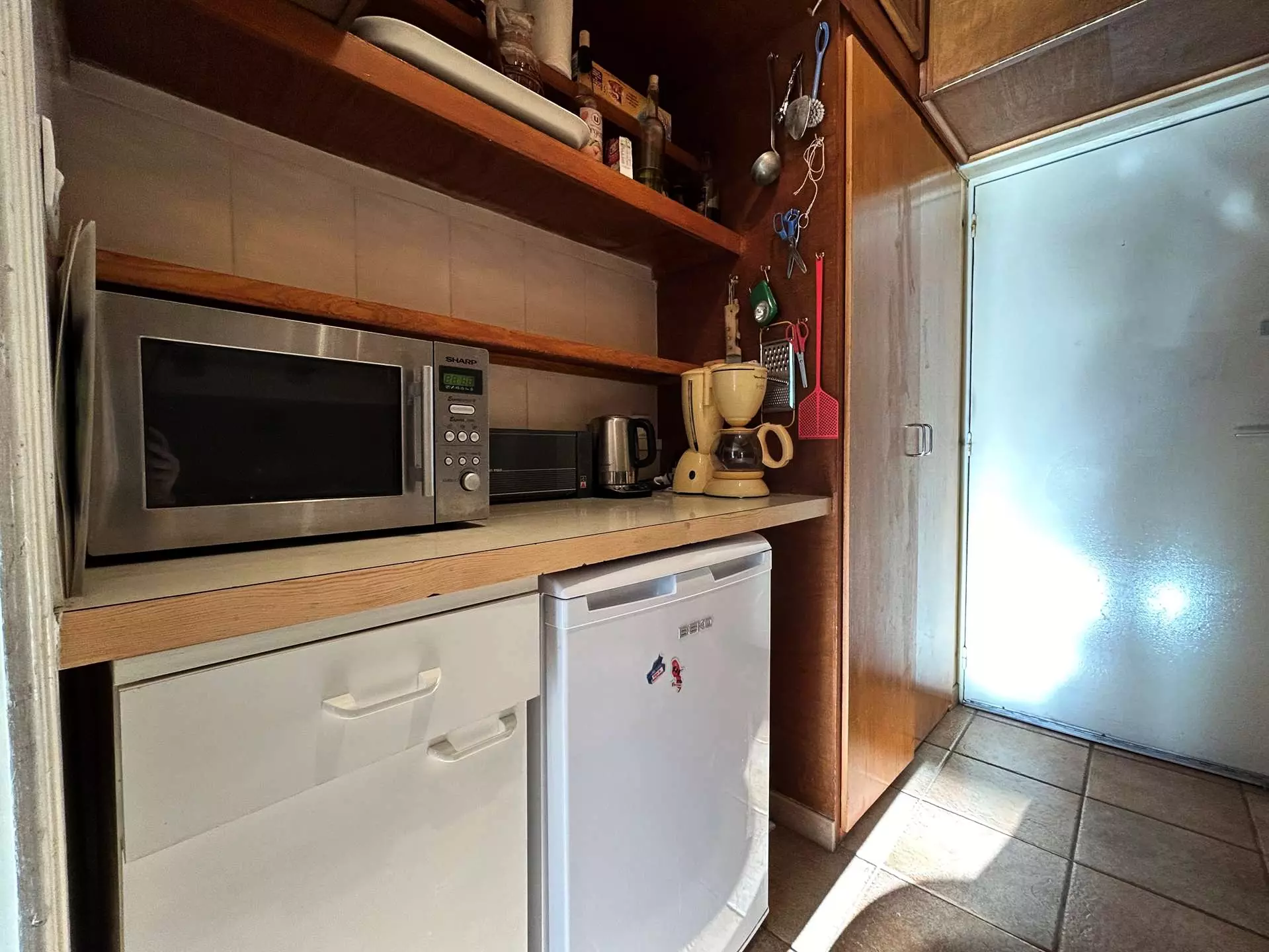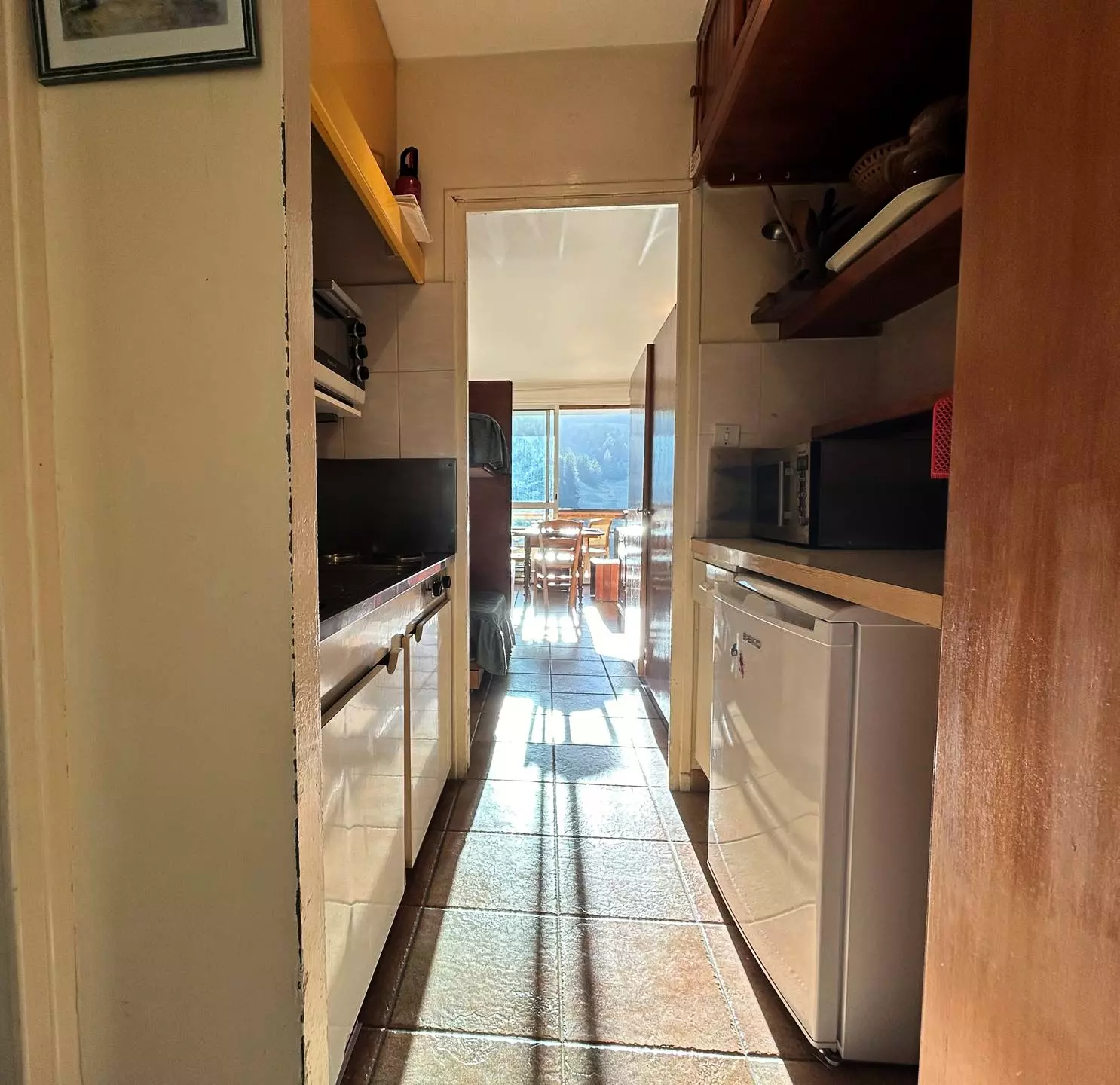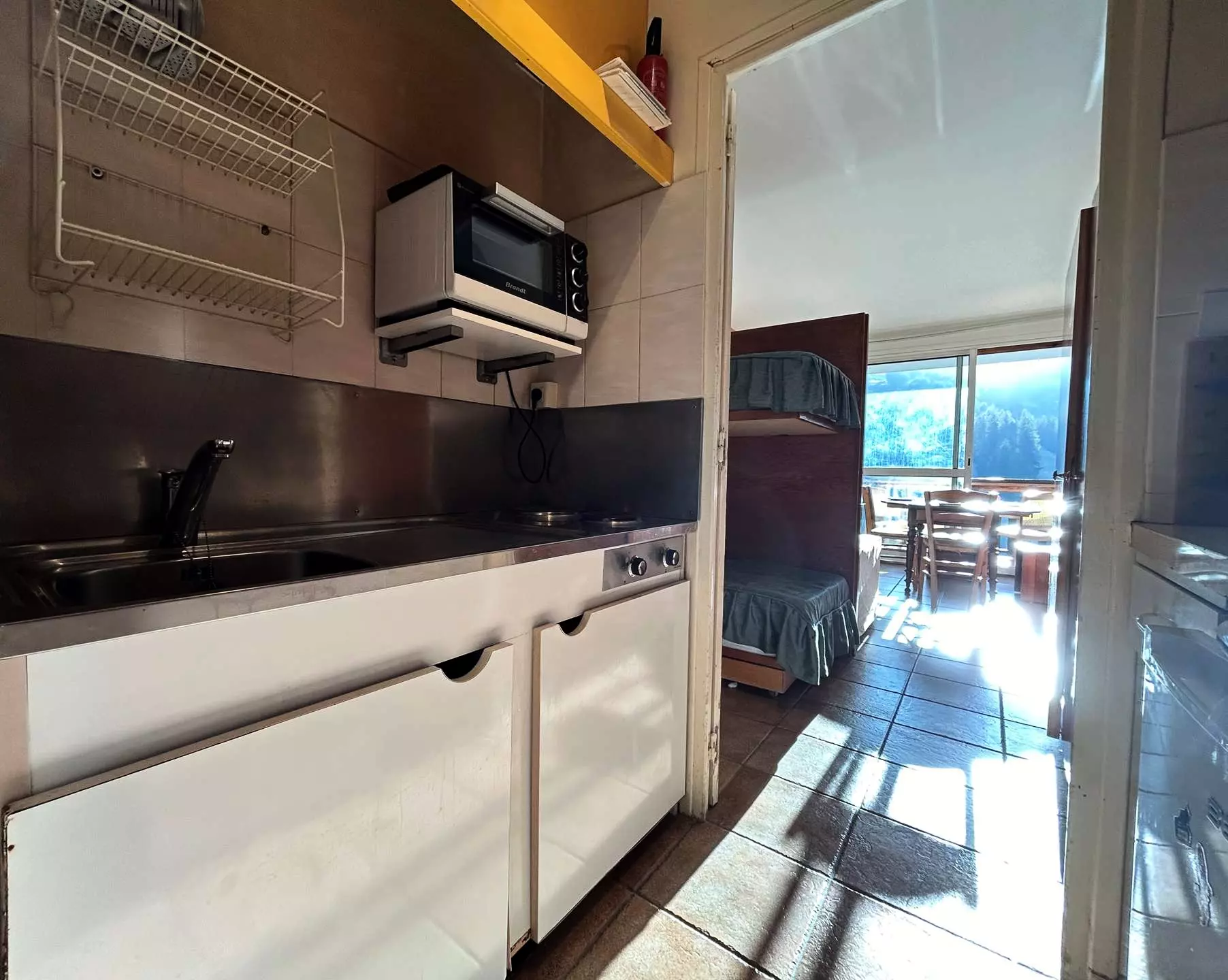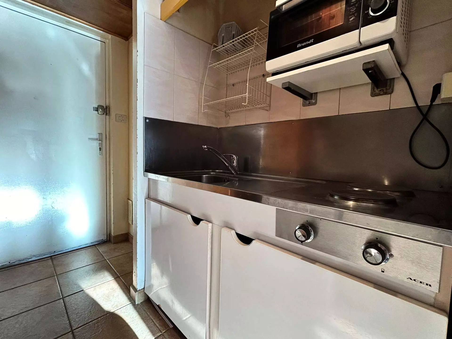 Il comprend une entrée desservant la salle d'eau avec WC, une kitchenette séparée équipée d'un micro-ondes, d'un four, de 2 plaques vitrocéramique, d'une cafetière Senseo et d'un lave-vaisselle.