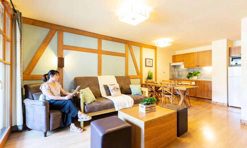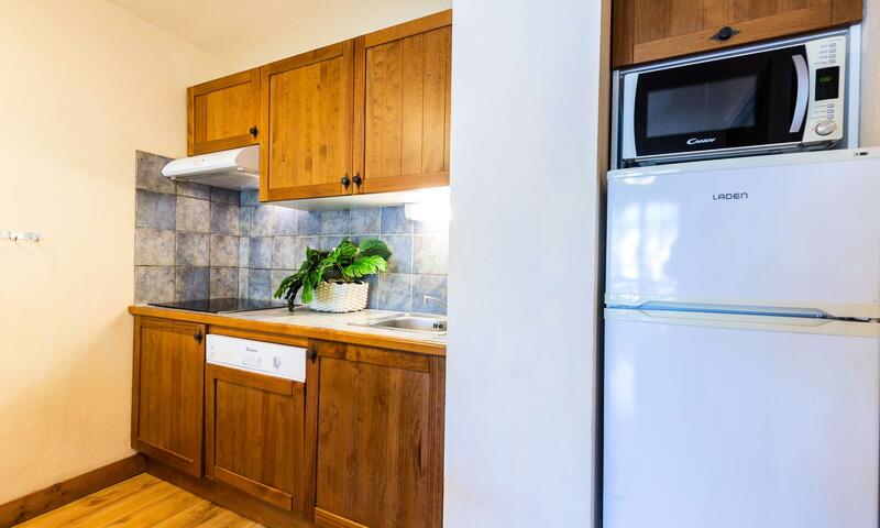 -Un séjour avec 1 canapé-lit gigogne 2 places et TV , ouvert sur une Cuisine équipée (plaques vitrocéramique, micro-ondes, lave-vaisselle)