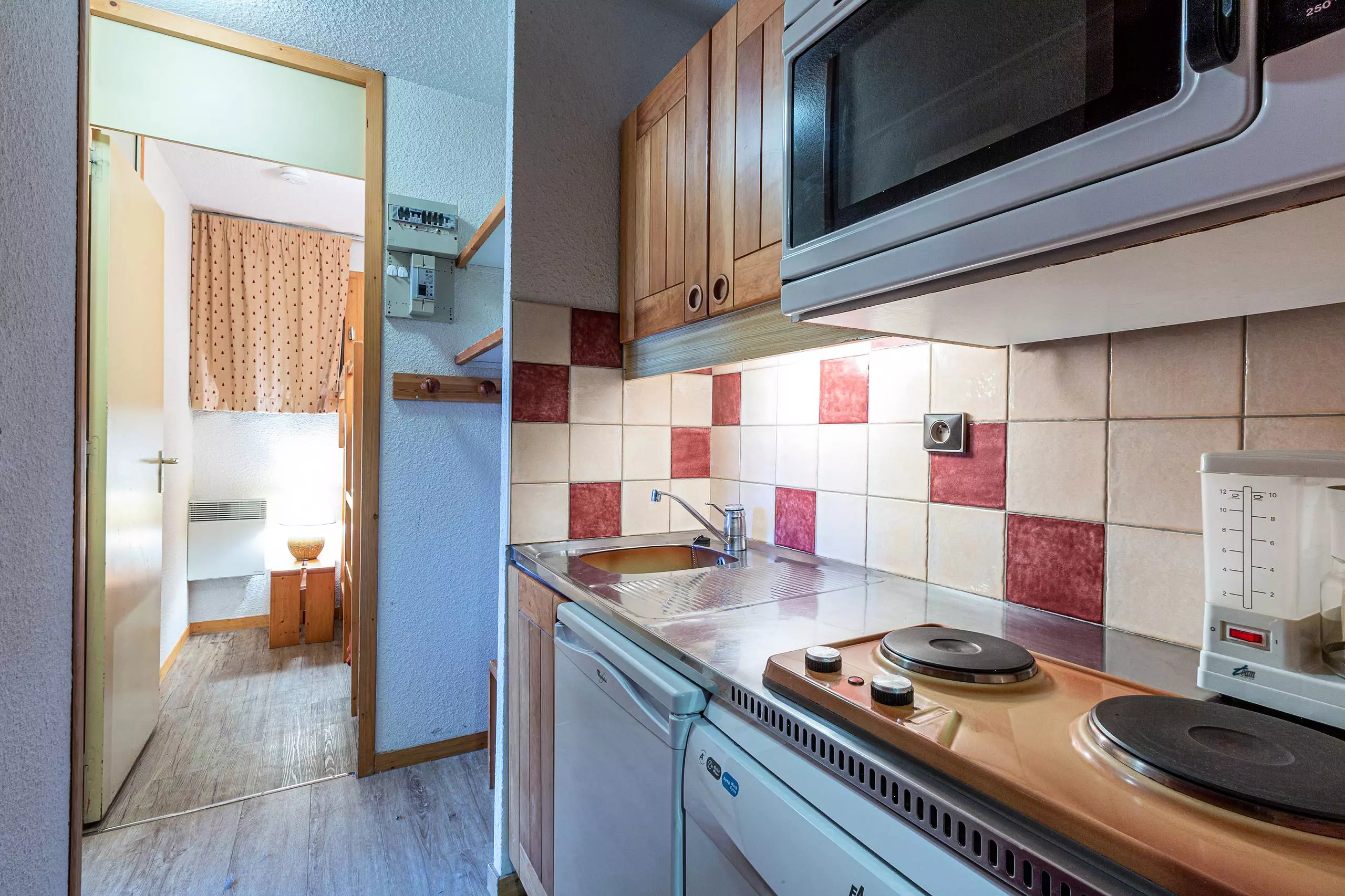 - Cuisine dans l'entrée équipée de plaques électriques, four, micro-ondes.
