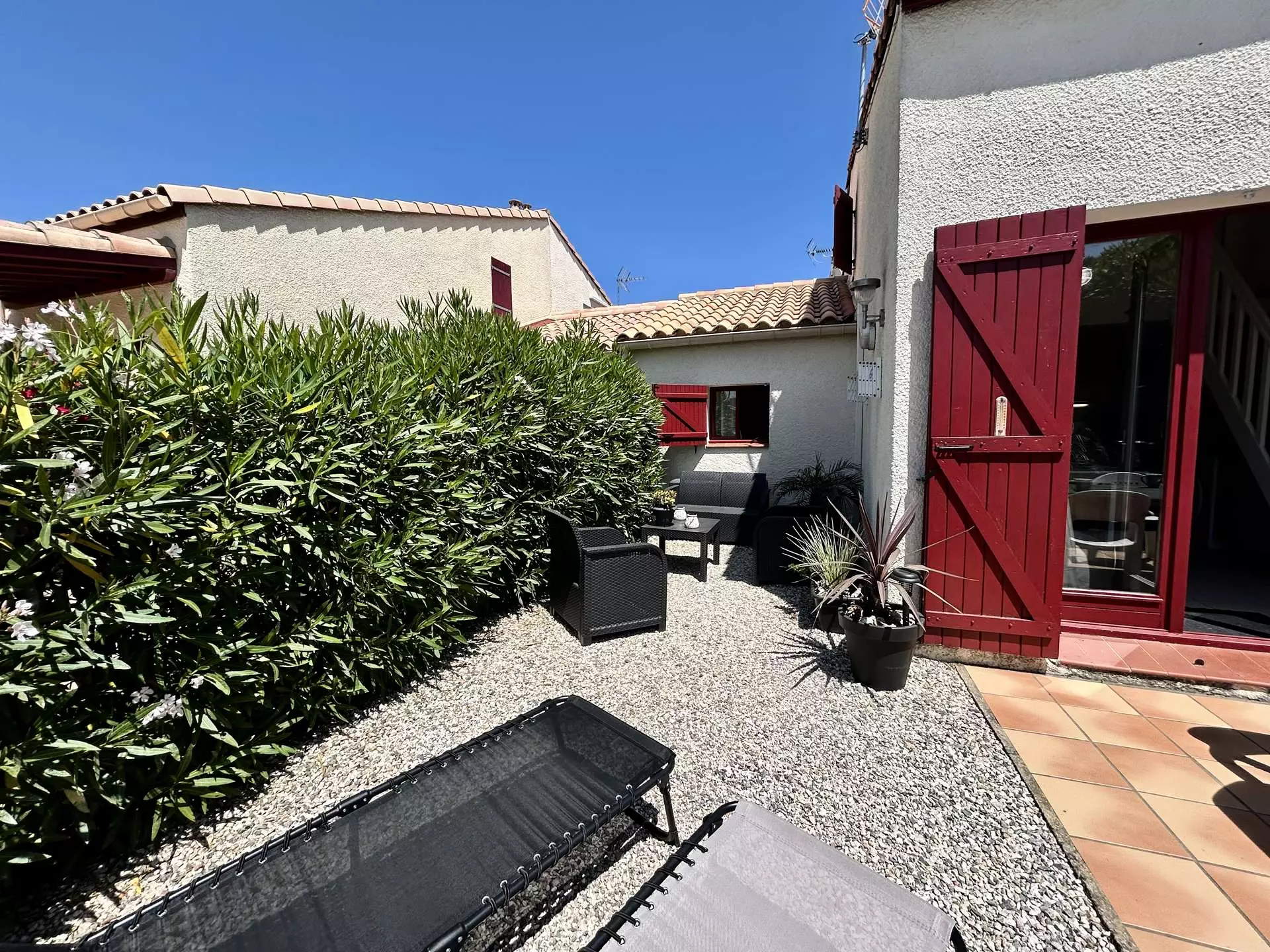 Les Plus de cette location à la mer :climatisation, piscine collective du 15/06 au 15/09 , parking devant le portail, jardinet avec un salon de jardin et un barbecue d'extérieur, télévision.