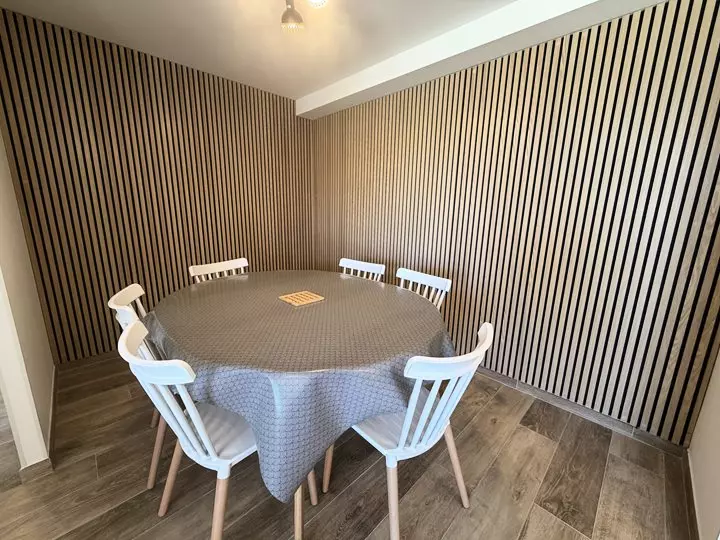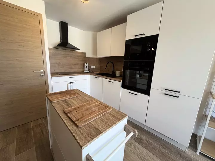 - Une cuisine ouverte entièrement équipée : réfrigérateur, four, plaque à induction 3 feux, lave-vaisselle, micro-ondes, cafetière à filtre, grille-pain, appareil combiné raclette/fondue.