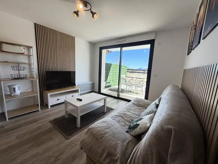 - Un salon confortable avec canapé convertible en 140 cm, ouvrant sur une agréable terrasse offrant une vue panoramique sur le lac de Matemale et le village des Angles.