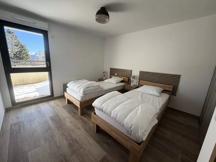 Superbe appartement neuf avec terrasse et jardin privatif, offrant une vue sur le le village des Angles, idéalement situé à proximité des pistes.