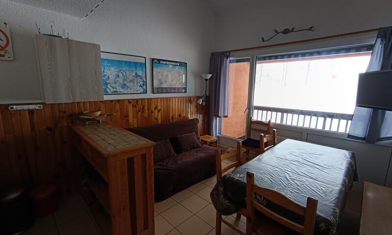 Séjour : Télévision murale, canapé gigogne 3 places, tabourets, coin repas avec table et 4 chaises (avec rallonges), accès balcon vue pistes. Volets roulant en prévision.