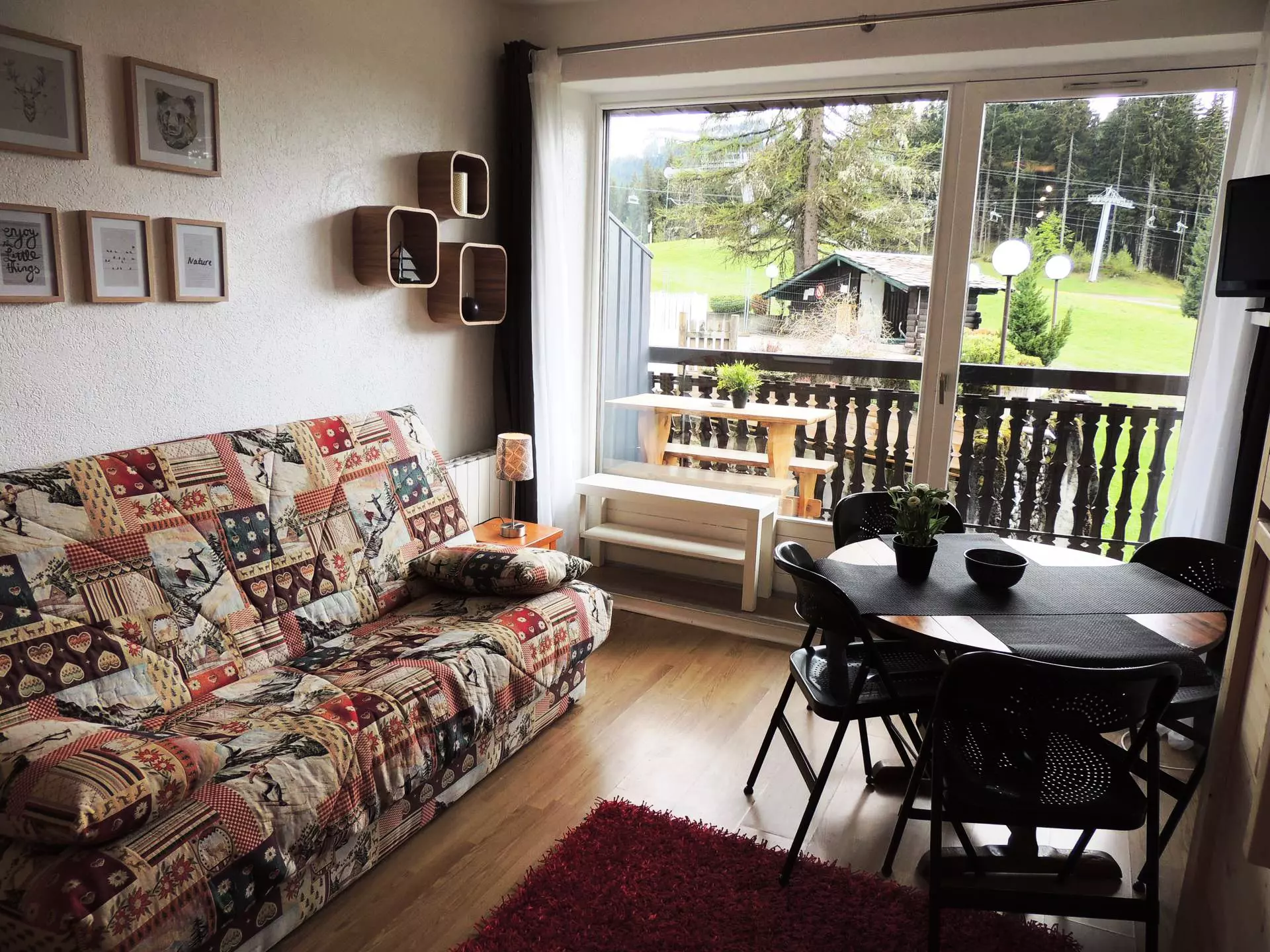 - 1 salon séjour avec acces balcon exposé sud et Ouest, vue sur village et pistes, un canapé lit, et deux lits superposés retractables.