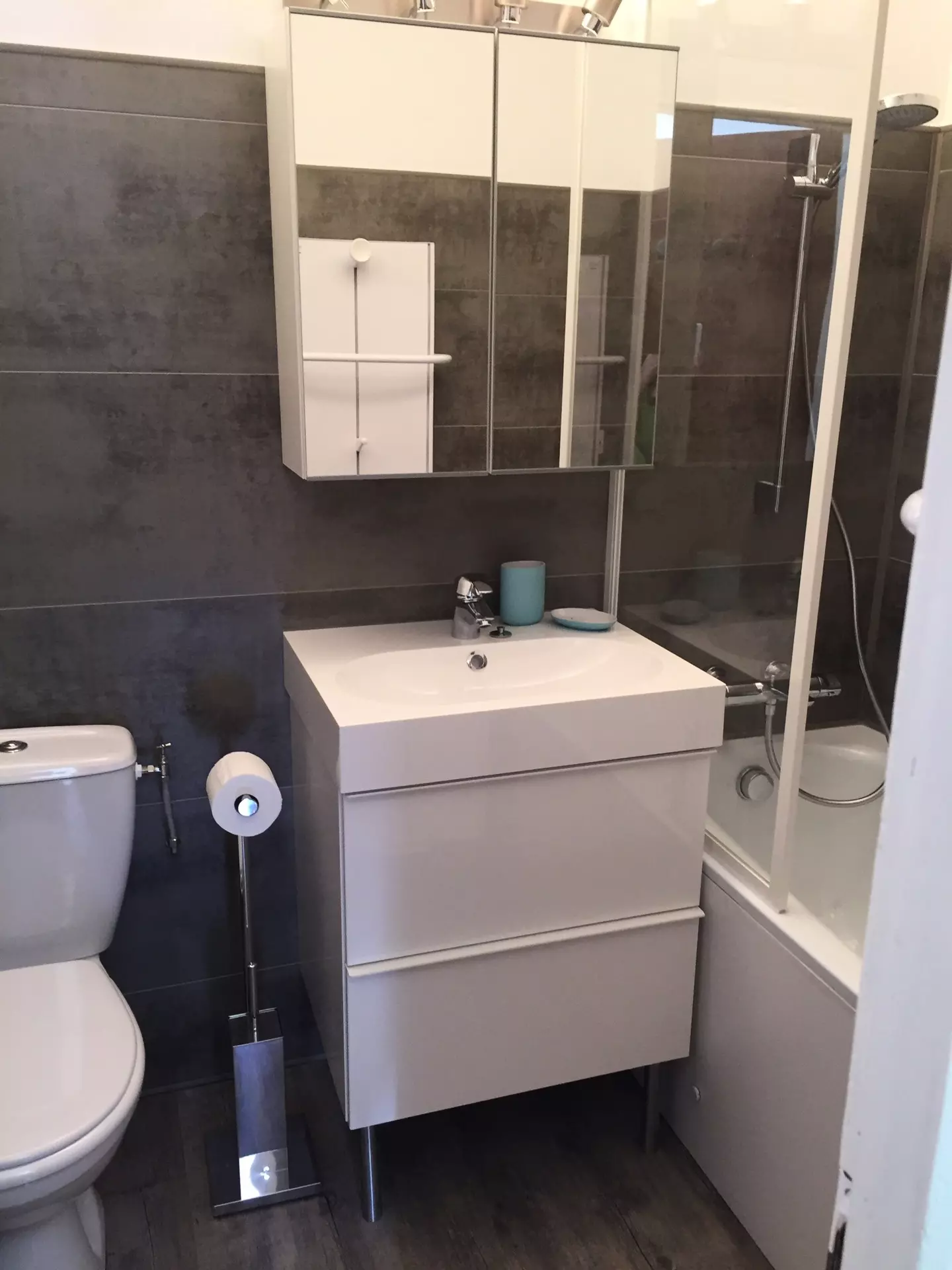 - 1 salle de bain avec baignoire, lavabo, sèche serviette électrique.