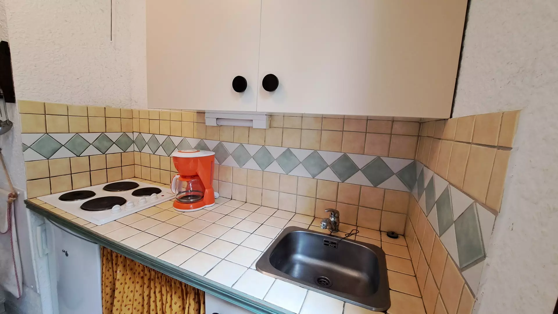 La cuisine ouverte sur le séjour: un coin cuisine tout neuf avec: frigo avec compartiment congélateur, un mini-four, un micro-onde, une cafetière Senseo, 2 plaques électriques, une bouilloire, un grille-pain, une raclette-grill et un appareil fondue, un aspirateur, un mixeur, air fyer, appareil à crêpes, blinder, mixeur