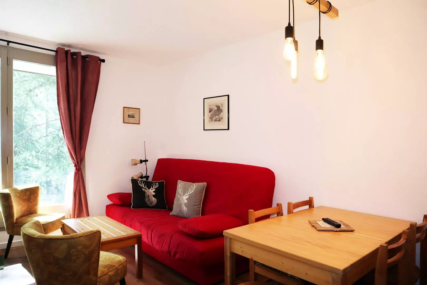 Résidence située à 300 mètres des commerces, à 150 mètres du télésiège de Prébois, grand studio équipé pour 5 personnes entièrement refait à neuf de très bon confort comprenant une entrée, placard, un coin montagne avec 3 lits superposés 1 place, une salle de bains, un WC indépendant, un séjour avec 1 banquette rapido 2 places en 160 cm, un coin cuisine équipé, un balcon en exposition est, box à skis. Grand parking extérieur communal payant, quartier calme, dans la verdure. Animaux non acceptés.