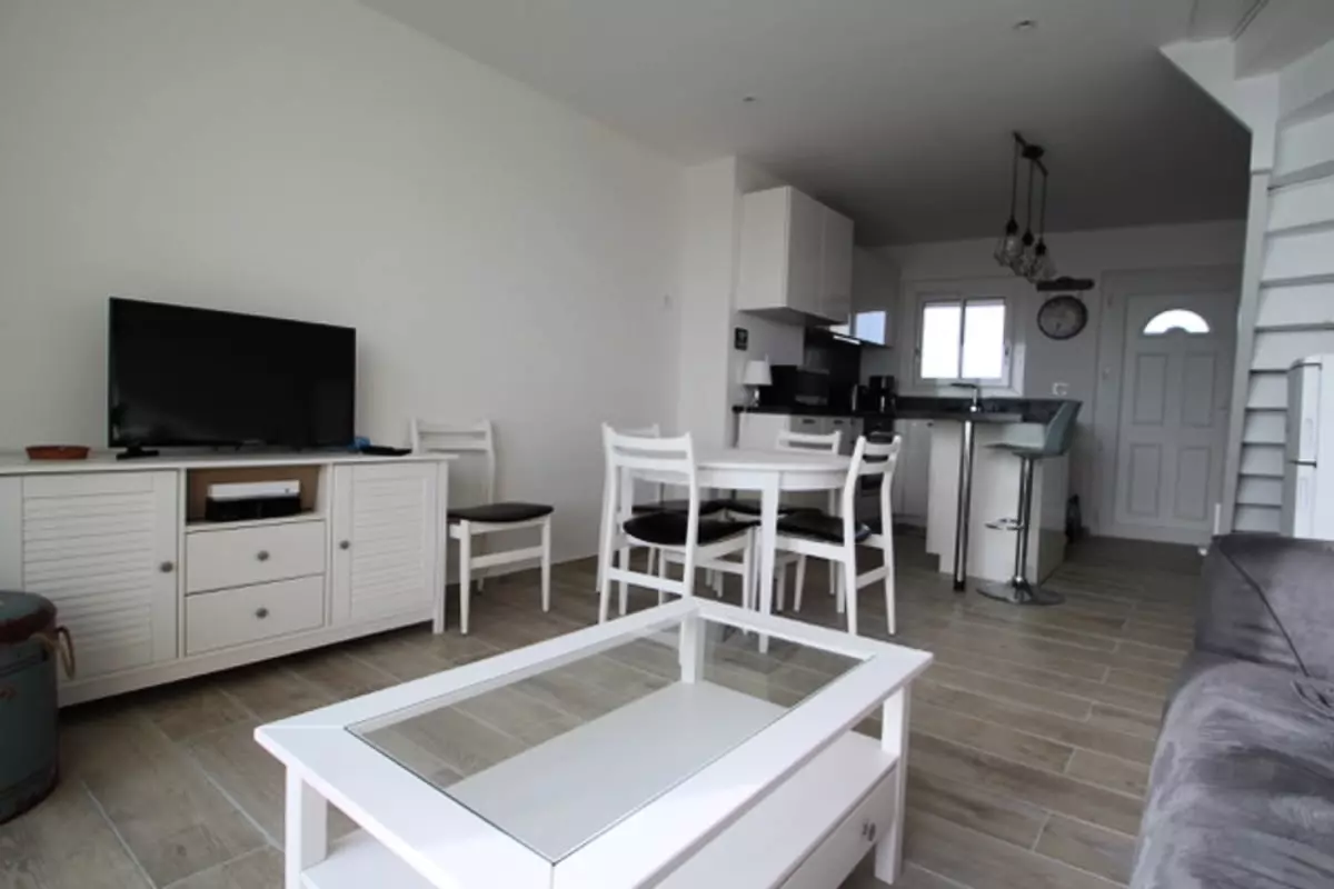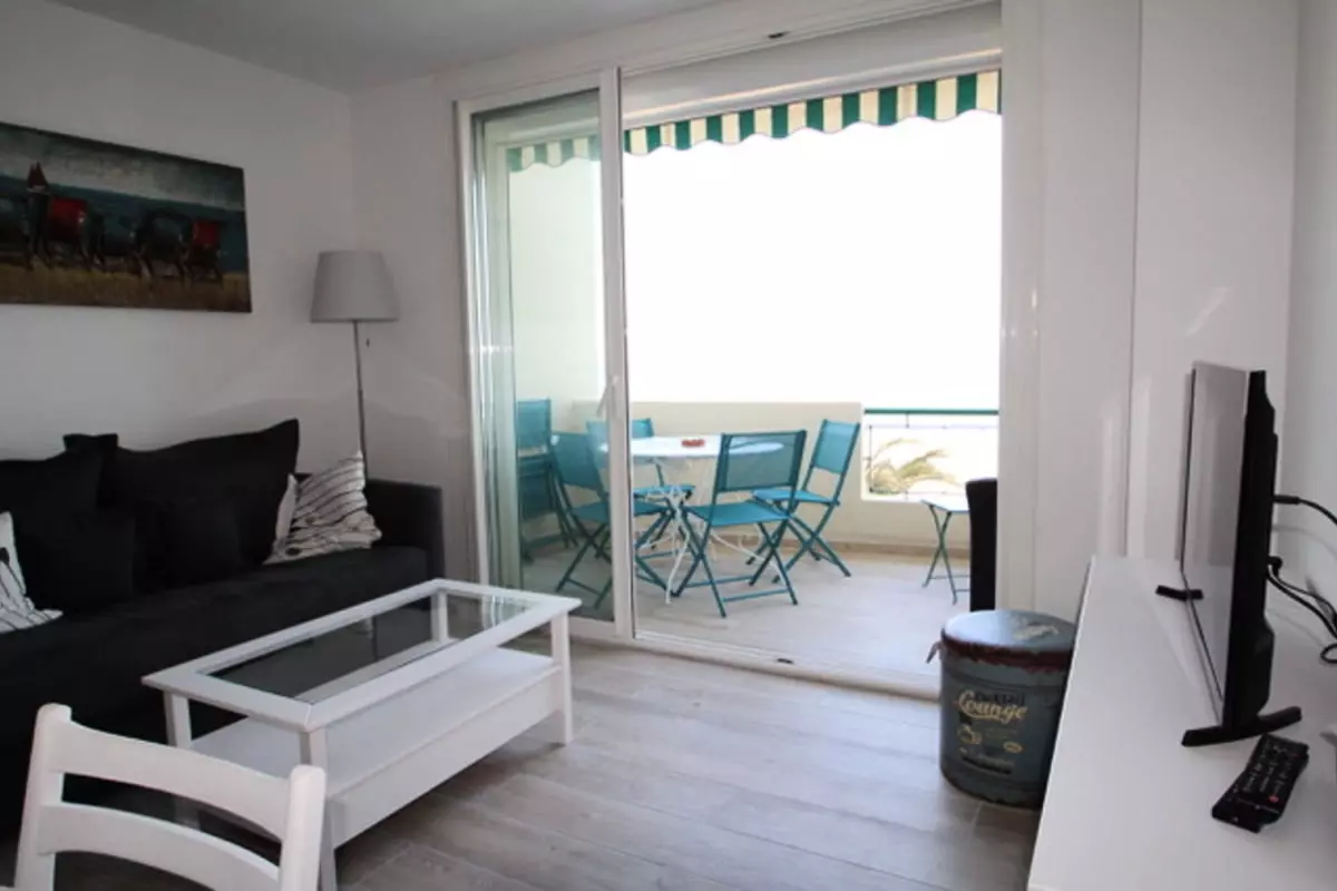 La pièce de vie est agréable et baignée de lumière, avec un canapé convertible, une TV et un accès direct à la terrasse avec vue sur la mer.